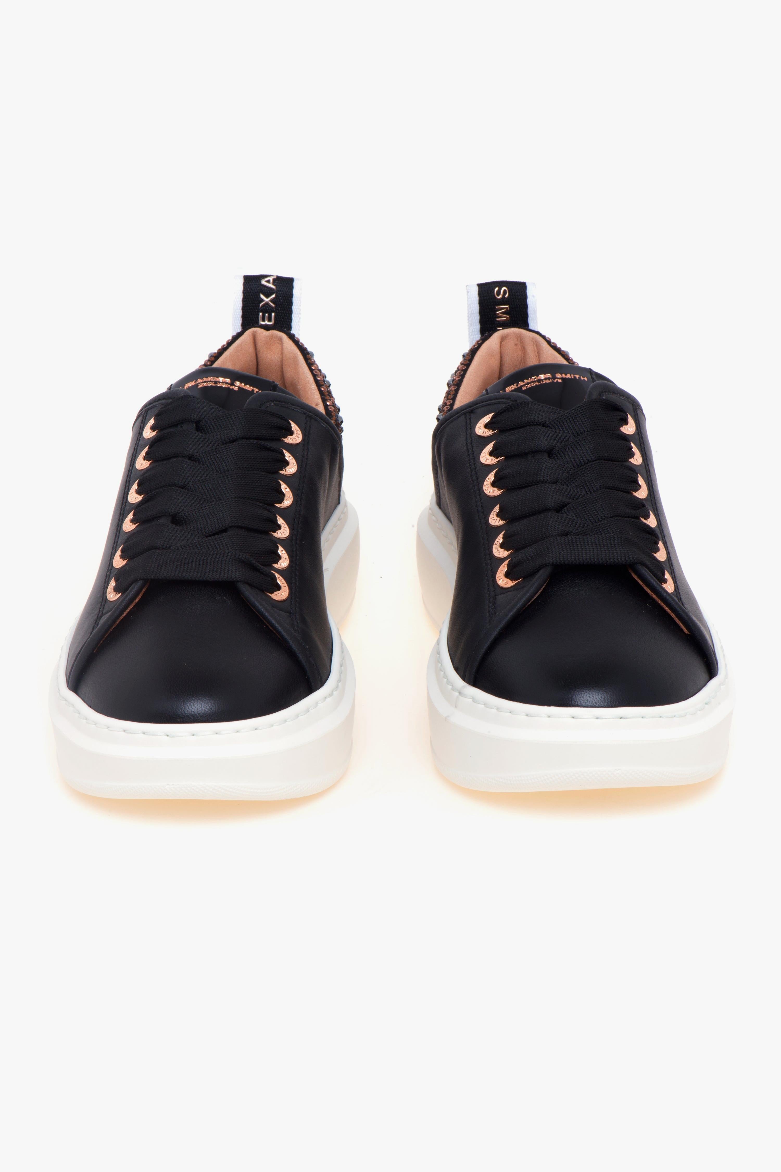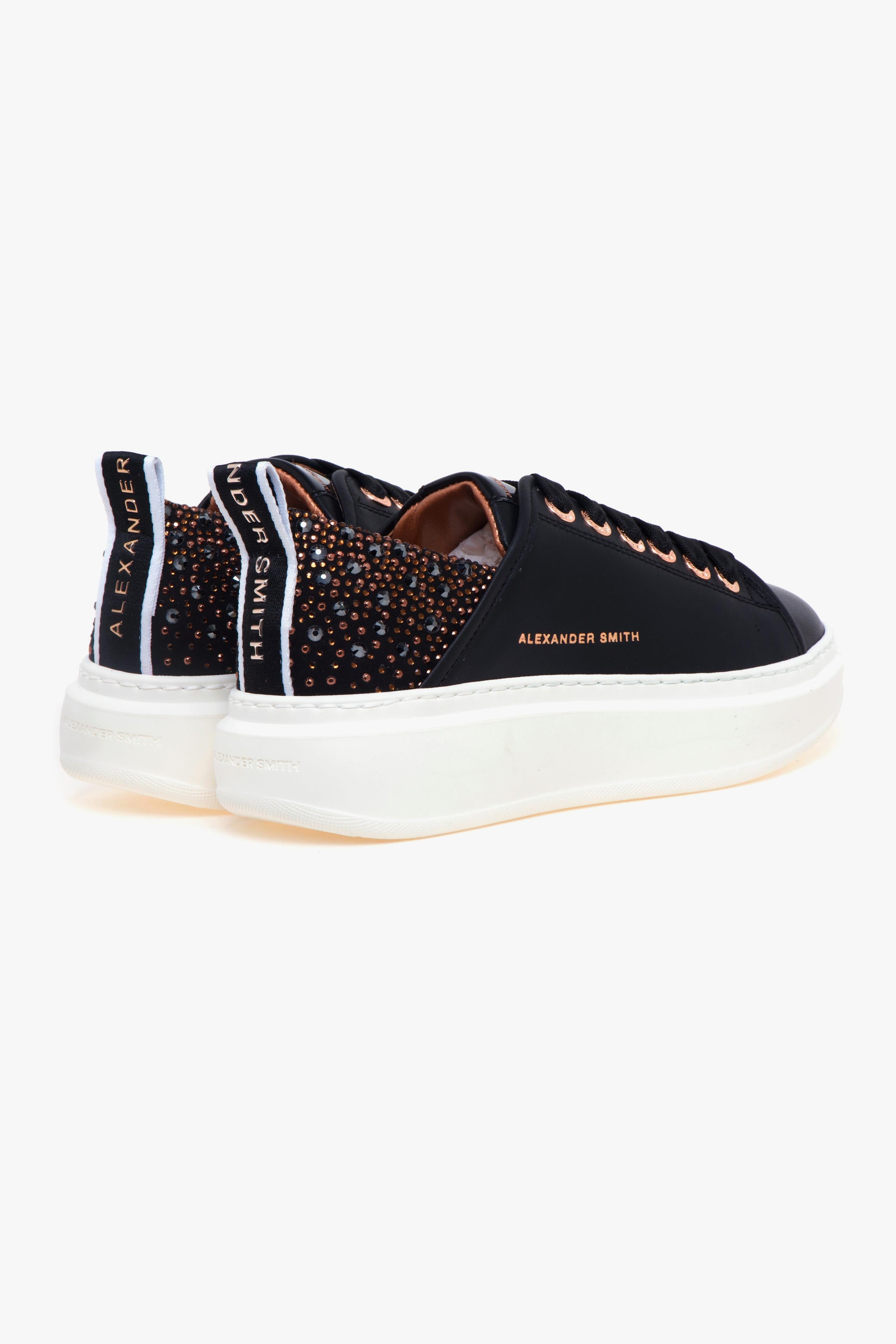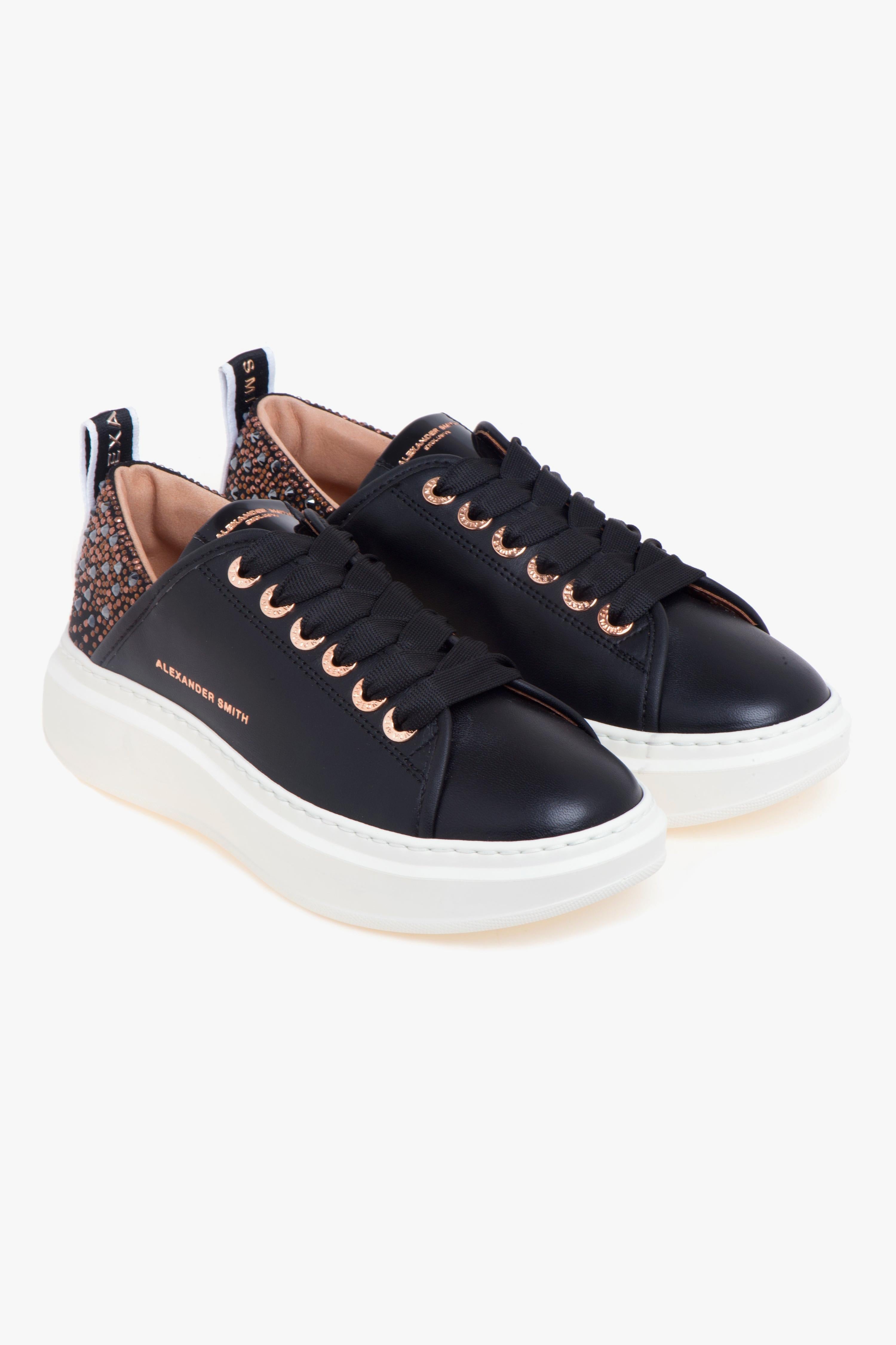 Stile sportivo e dettagli ricercati si incontrano in una sneaker dal profilo essenziale, pensata per chi ama distinguersi con discrezione.La Alexander Smith Wembley, nella versione in pelle nera, unisce linee pulite e materiali di qualità con un tocco glam contemporaneo. La cucitura trasversale sulla tomaia, in prossimità del tallone, disegna un profilo dinamico e originale. Sul retro, la scarpa è impreziosita da un inserto in pelle ricoperto di strass tono su tono, che illumina la silhouette senza eccessi.Il logo Alexander Smith è stampato lateralmente con finitura discreta, mentre il laccetto sul tallone presenta il lettering del brand in argento, per un dettaglio funzionale e decorativo. La suola in gomma personalizzata sul retro assicura grip, comfort e uno slancio visivo ben equilibrato.All’interno, la sneaker è dotata di fodera in pelle e tessuto, e di una soletta estraibile in pelle che assicura una calzata morbida e traspirante. Moderna ma versatile, Wembley è perfetta per accompagnare con eleganza la quotidianità.Caratteristiche principali:# Tomaia in pelle nera.# Tallone ricoperto di strass tono su tono.# Cucitura trasversale e logo laterale stampato.# Loop sul tallone con lettering Alexander Smith argento.# Fodera in pelle e tessuto.# Sottopiede removibile in pelle.# Suola in gomma personalizzata, altezza: 40 mm.# Soletta interna: 10 mm.# Made in ItalyConsigli di stile:Indossala con pantaloni culotte a vita alta e una camicia fluida o maglia in filato sottile, completando il look con un trench leggero o blazer sfoderato. L’effetto ton-sur-ton degli strass dona luminosità senza eccessi, perfetta per un’eleganza contemporanea.Per un look più raffinato, abbinala a una longuette plissé, una camicia in seta opaca e un blazer a monopetto con cintura in vita. Un equilibrio tra femminilità e attitudine sporty-chic, ideale anche per contesti semi-formali o per un appuntamento curato ma comodo.In alternativa, abbinala a pantaloni jogger in felpa pulita o jeans cropped, con una t-shirt over e una giacca in nylon tecnico o bomber corto. I dettagli luminosi aggiungono un twist glam a un look casual urbano.