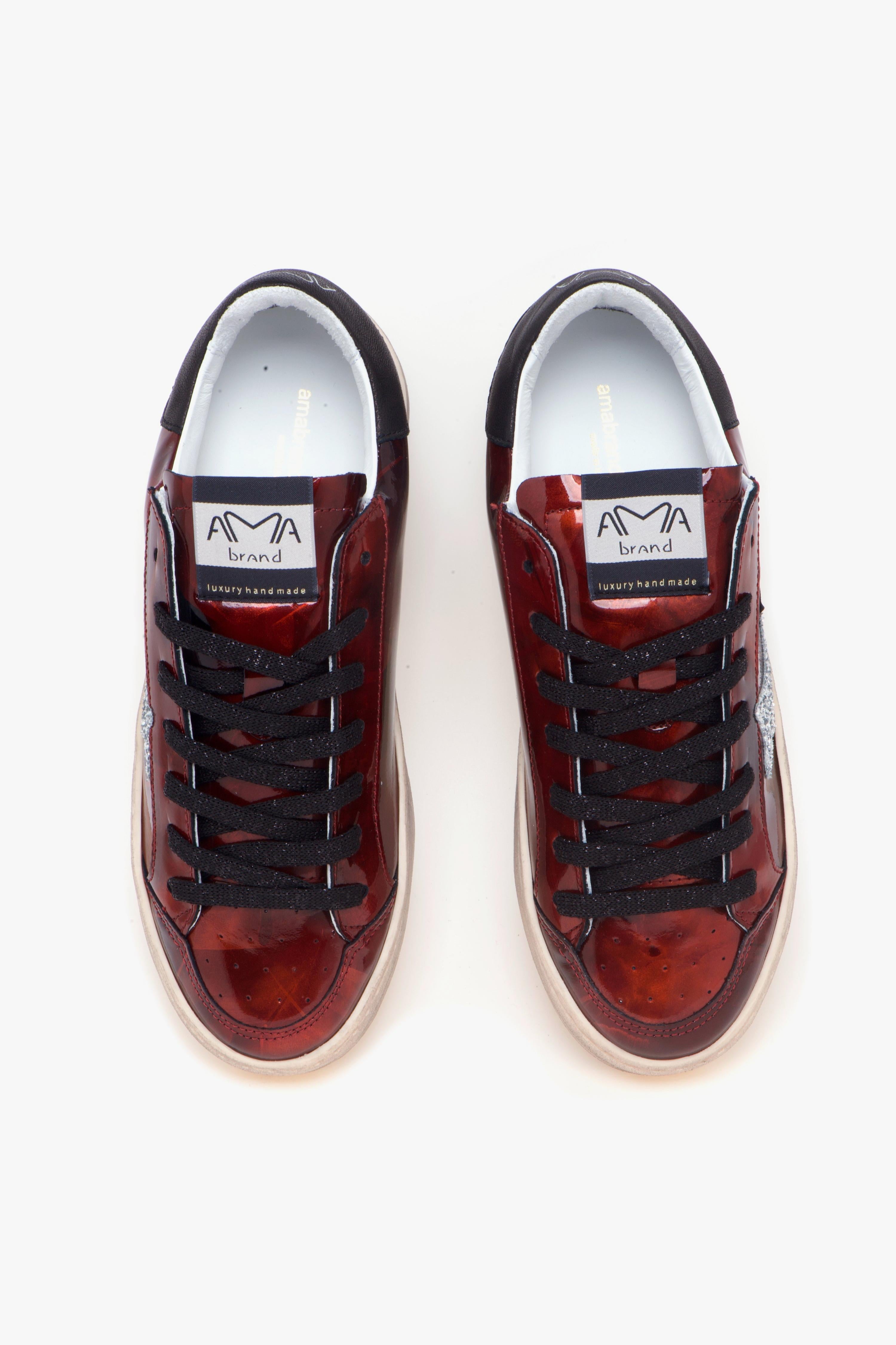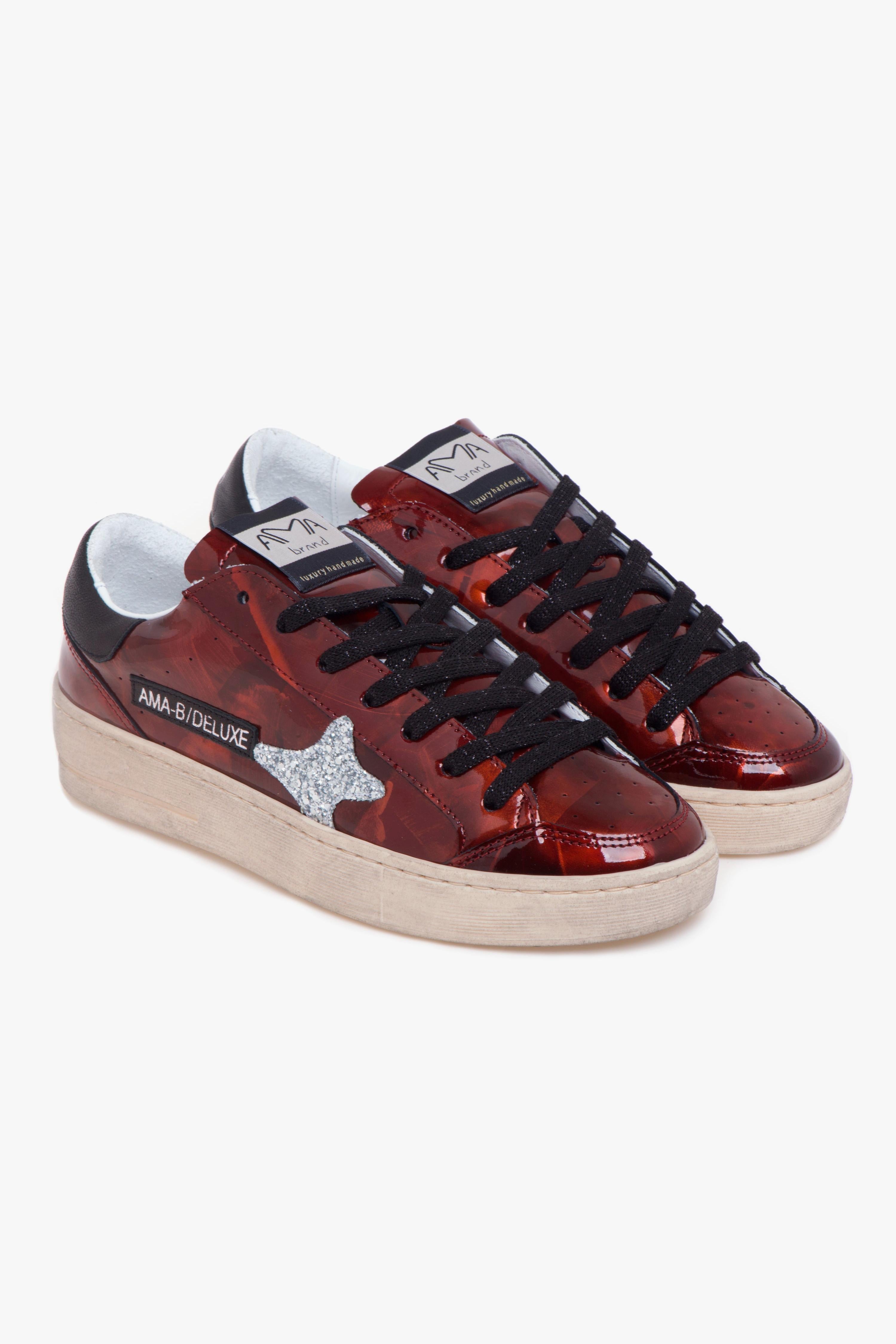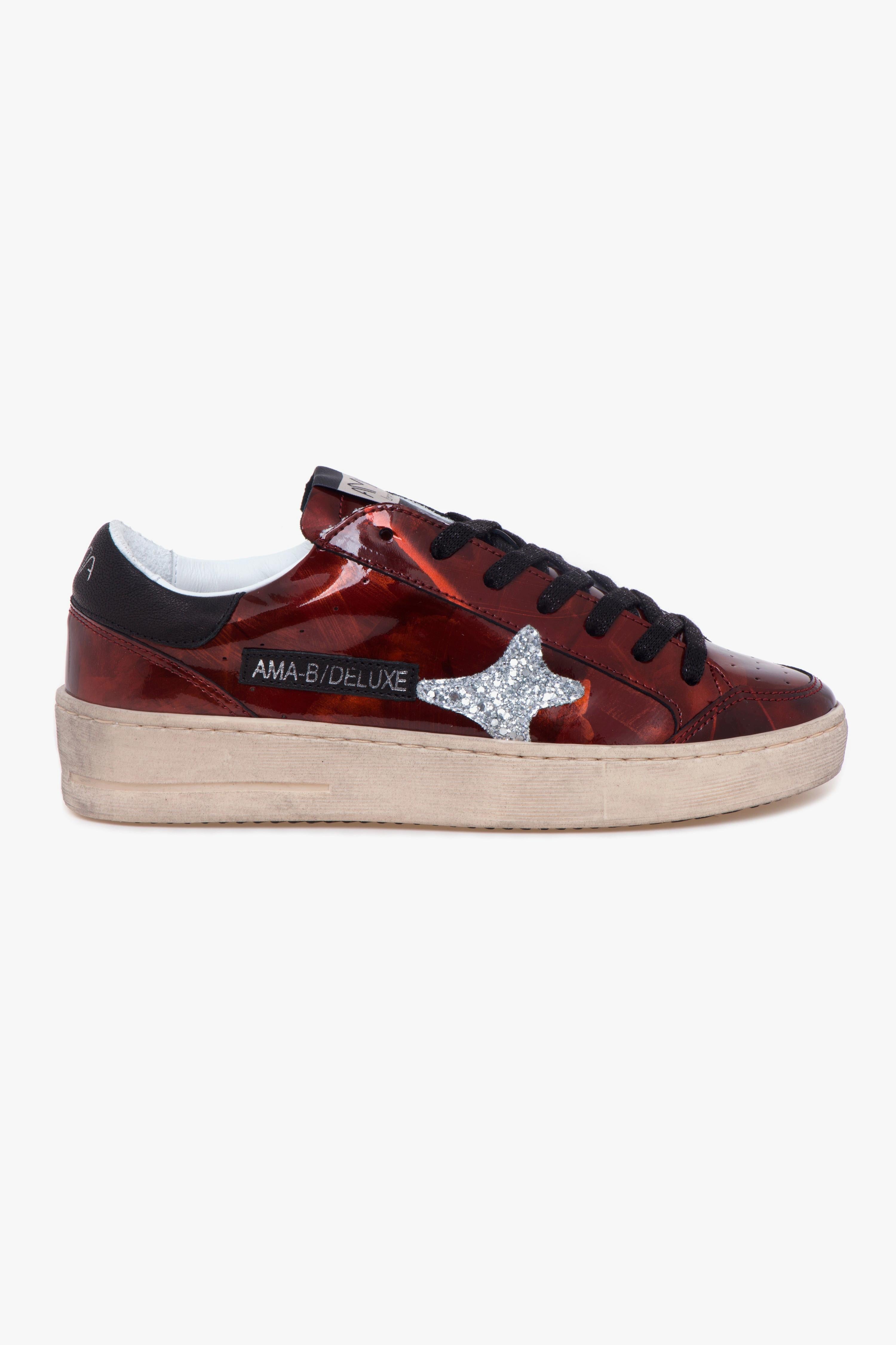 Ama Brand Slam è una sneaker che unisce carattere urbano e dettagli glamour. La tomaia in vernice effetto spalmato regala un raffinato gioco di chiaro-scuro, mentre il logo laterale in glitter argento illumina il design con un tocco brillante. Il tallone in pelle nera con logo argento e la label laterale in pelle con scritta AMA-B/DELUXE completano uno stile deciso ma versatile.La suola in gomma leggera con effetto invecchiato dona personalità e, grazie alla leggera rialzatura sul tallone, offre maggiore comfort nella camminata. All’interno, la fodera in pelle e tessuto garantisce traspirabilità e morbidezza, mentre il sottopiede estraibile in pelle assicura sostegno per tutta la giornata.Consigli di stile:Perfetta con pantaloni cropped dal taglio morbido e camicia in popeline bianco per un look casual-chic con un tocco luminoso.In alternativa, abbinala a cargo pants e giacca bomber oversize per un outfit di tendenza dallo spirito metropolitano.Caratteristiche principali:# Tomaia in vernice effetto spalmato.# Logo laterale in glitter argento.# Tallone in pelle nera con logo argento.# Label laterale in pelle con scritta AMA-B/DELUXE.# Fodera in pelle e tessuto.# Sottopiede estraibile in pelle.# Suola in gomma leggera con effetto invecchiato.# Rialzo tallone per maggiore comfort.# Made in Italy