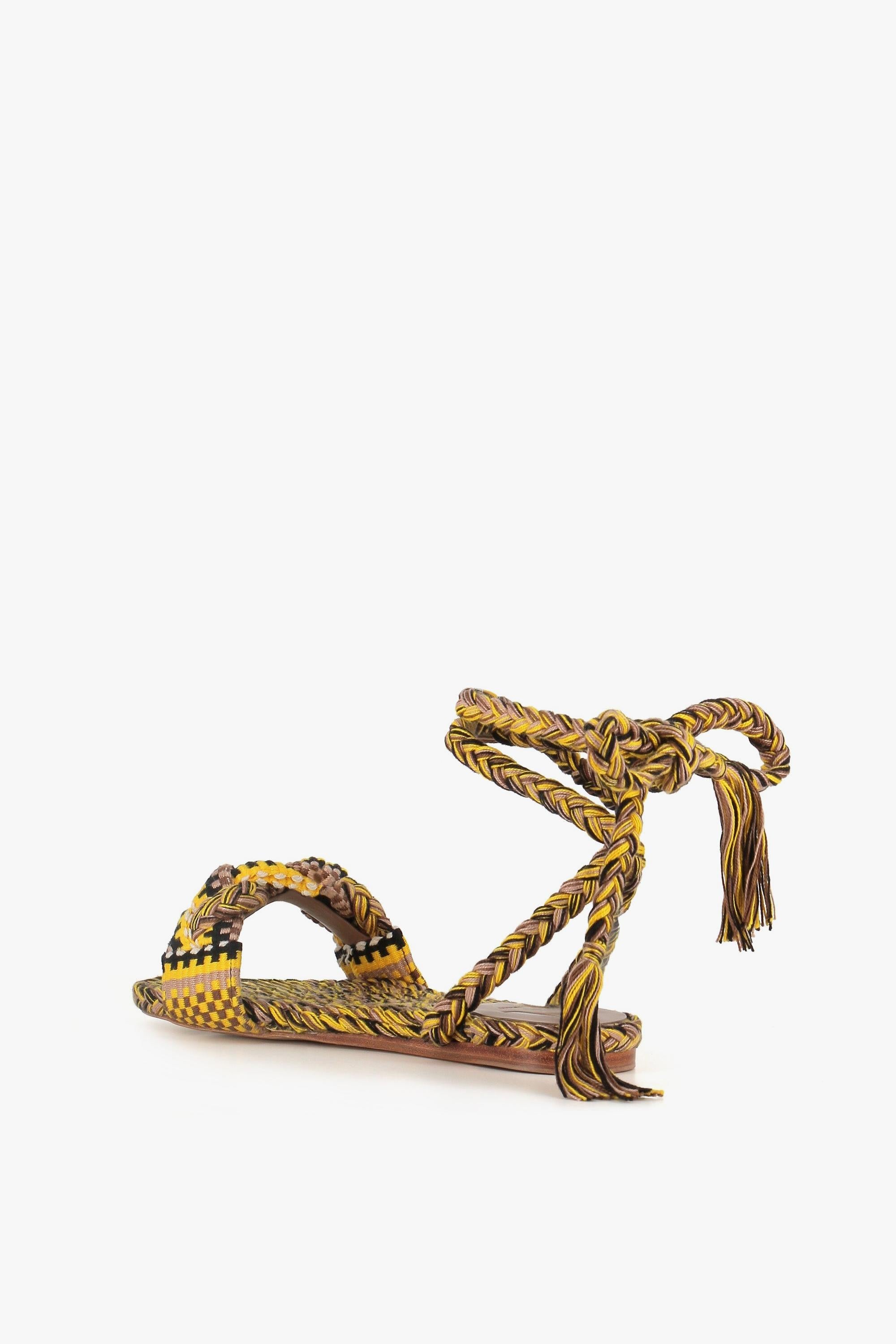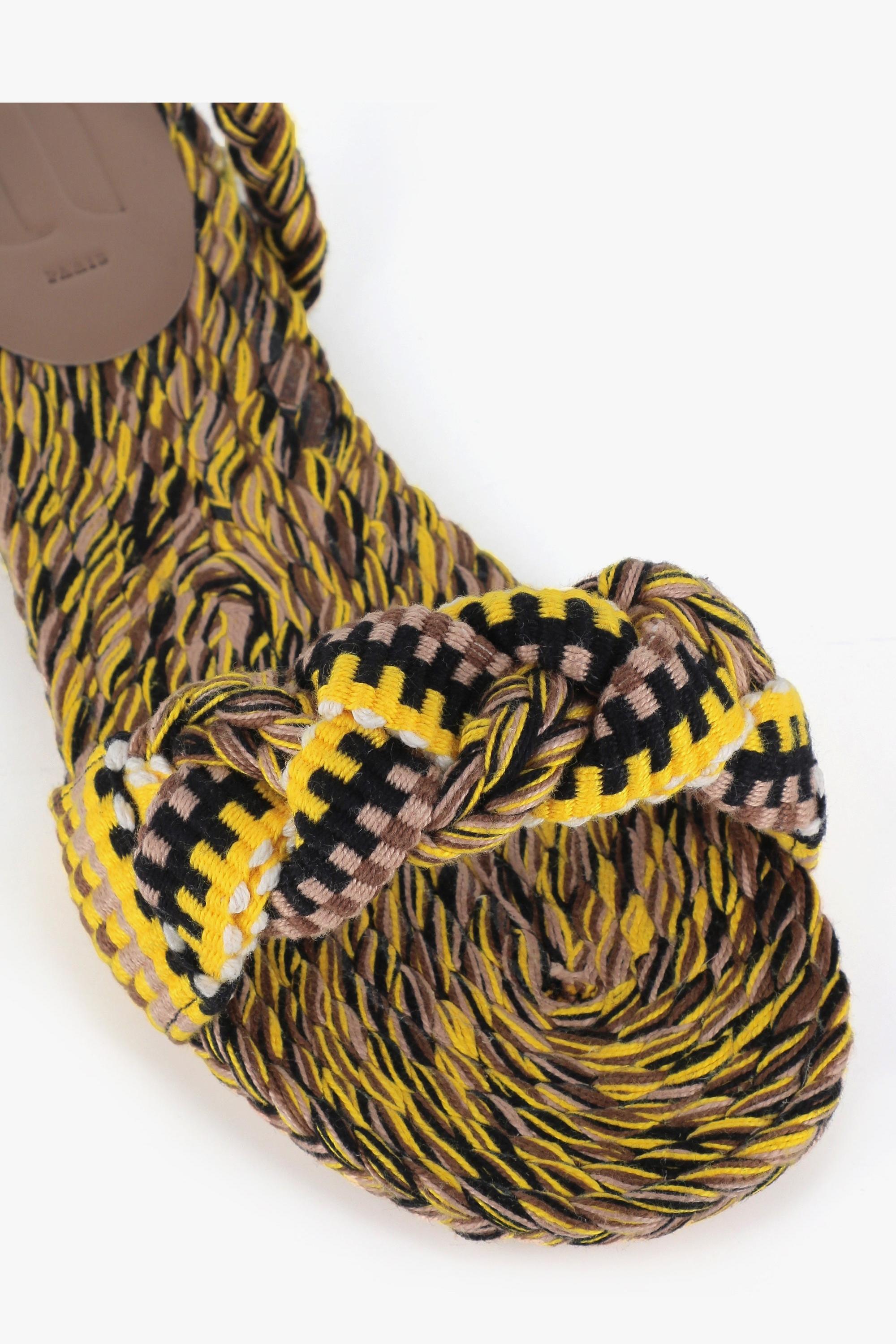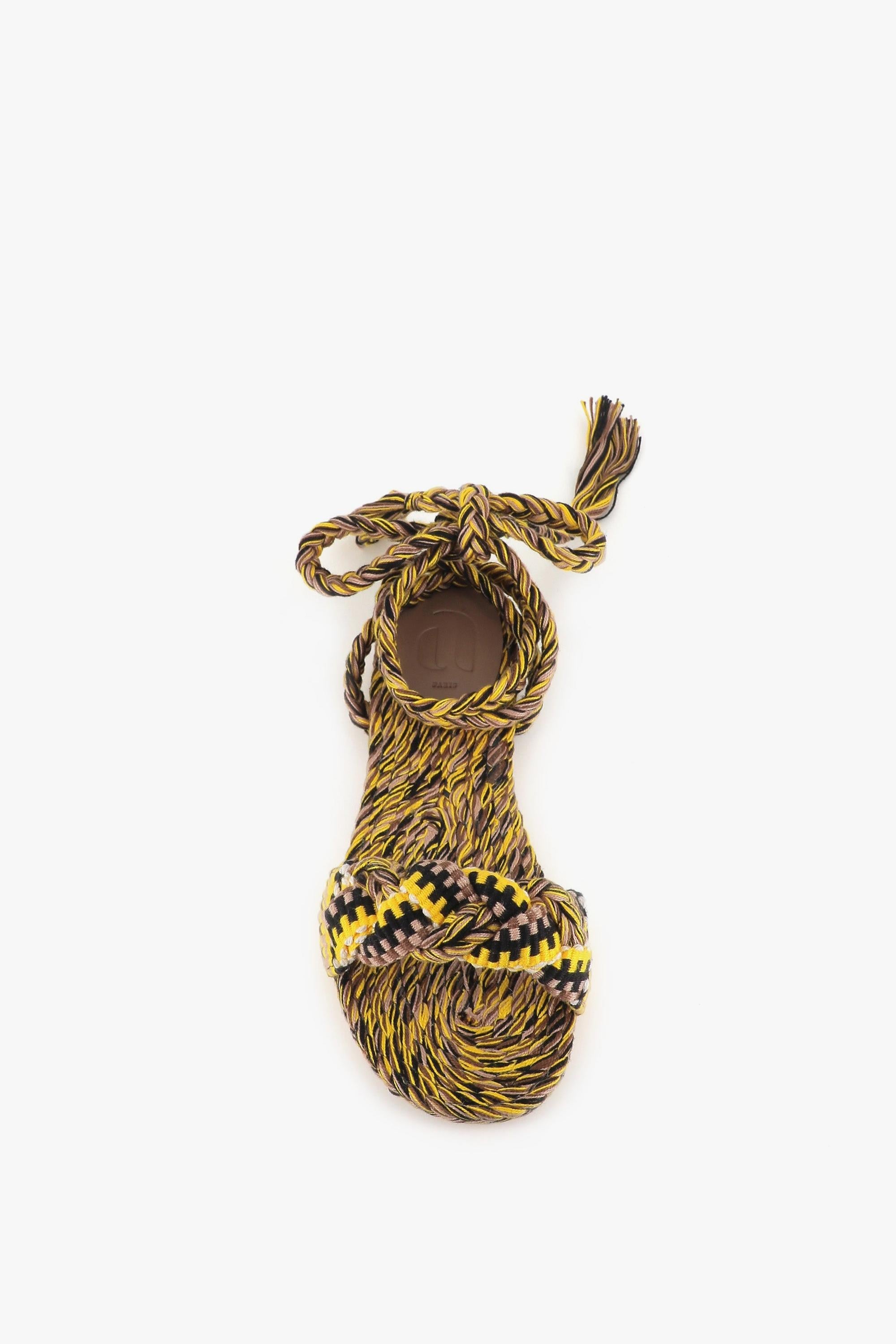 Sandalo Amambaih donna colore giallo e beige, realizzato in tessuto, caratterizzato da una chiusura con lacci. Lavorazione artigianale. Suola in cuoio. Tacco: 1 cm