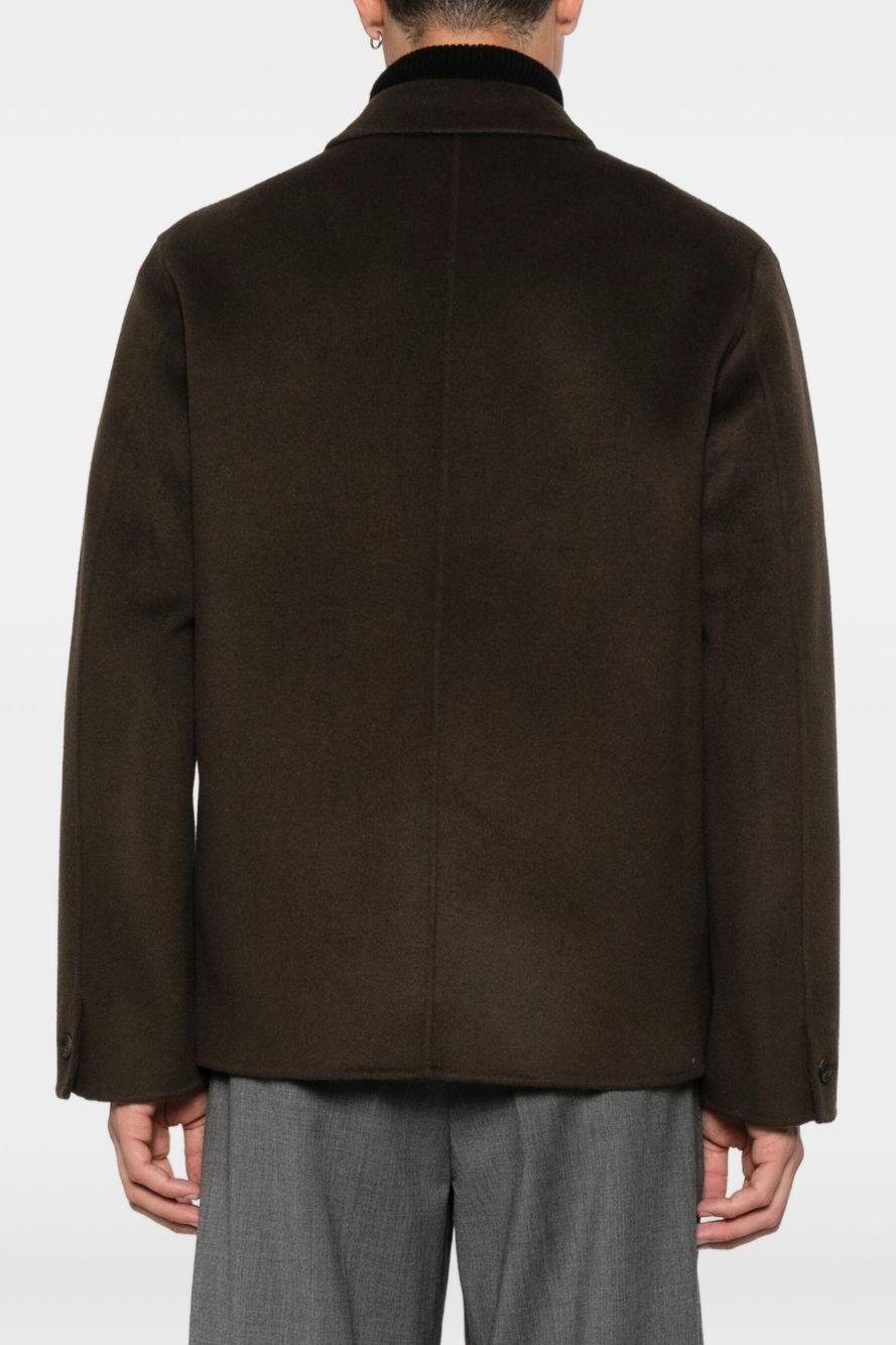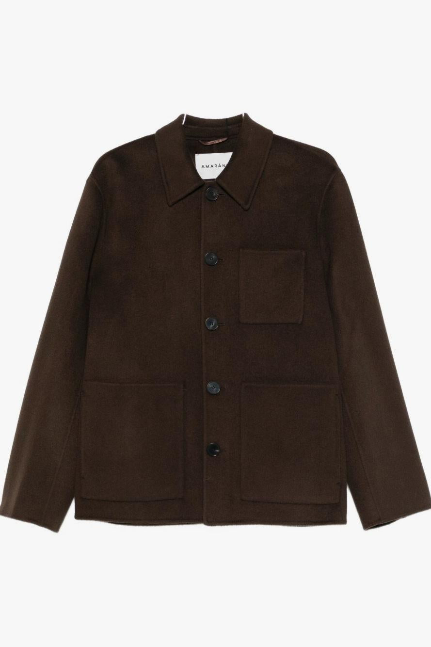 Il marrone scuro, profondo e sofisticato, valorizza le linee pulite del modello. Il colletto a punta richiama lo stile delle overshirt moderne, mentre la chiusura frontale con abbottonatura conferisce un aspetto classico e funzionale. La tasca applicata sul petto e le tasche frontali applicate aggiungono praticità e un tocco utility, perfettamente bilanciato dalle maniche lunghe che completano il profilo essenziale.