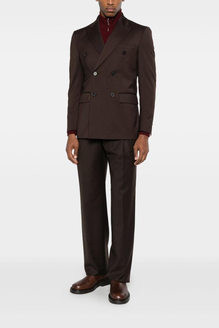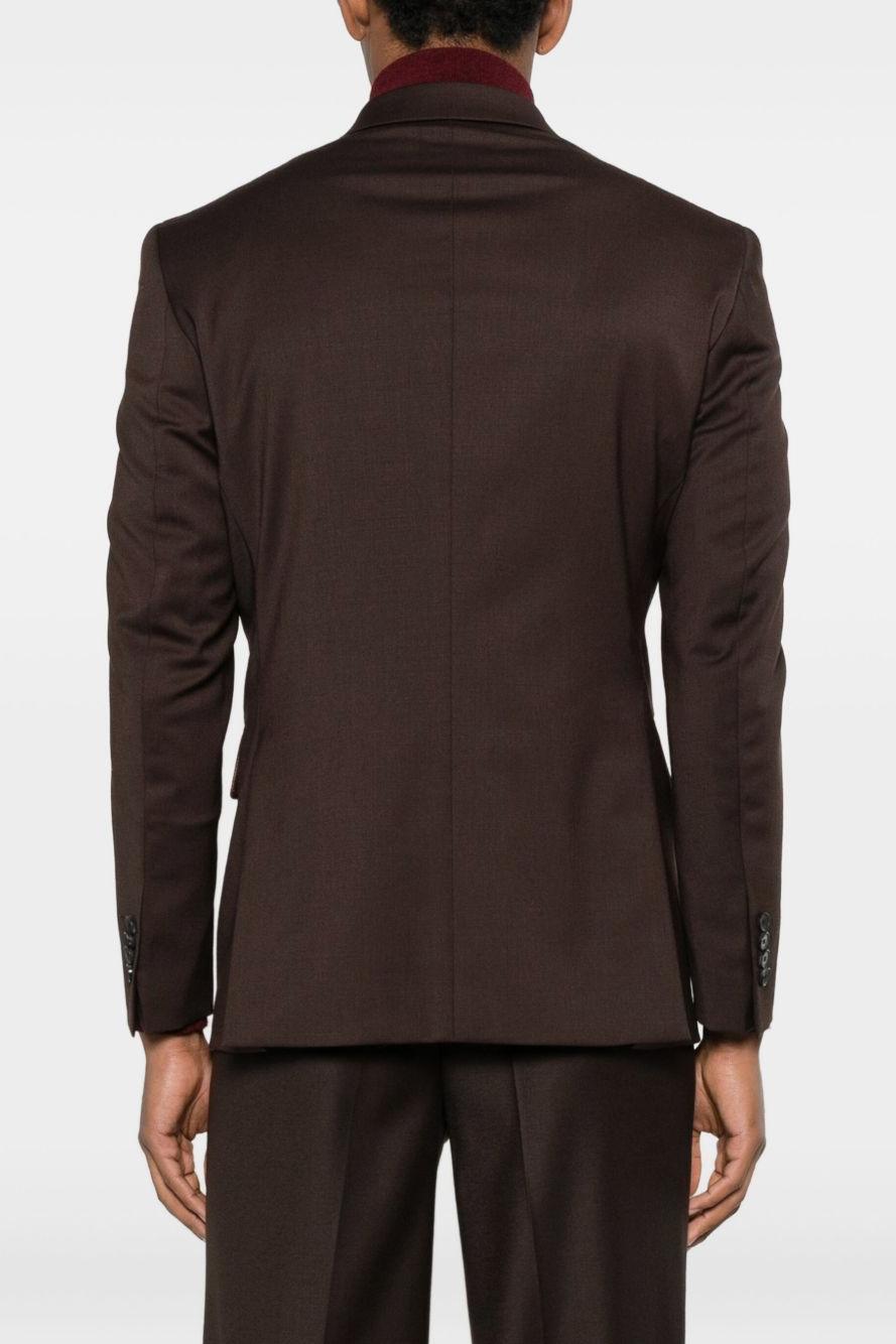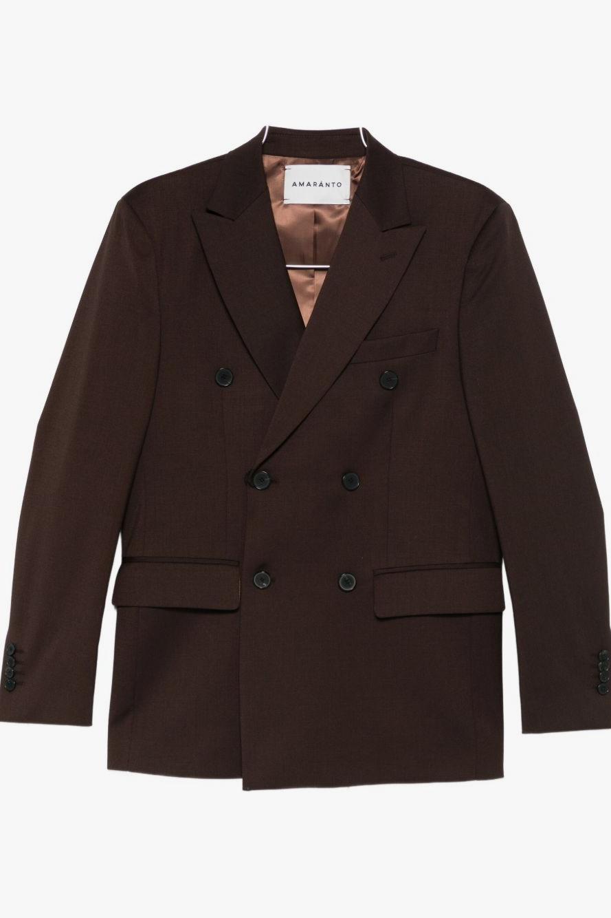 Il marrone scuro, profondo e sofisticato, dona carattere al modello, esaltando il design doppiopetto con chiusura a bottoni e revers a punta, elementi distintivi della tradizione sartoriale. Le tasche ad aletta aggiungono funzionalità senza compromettere la pulizia delle linee, mentre le maniche lunghe completano una silhouette classica e versatile.