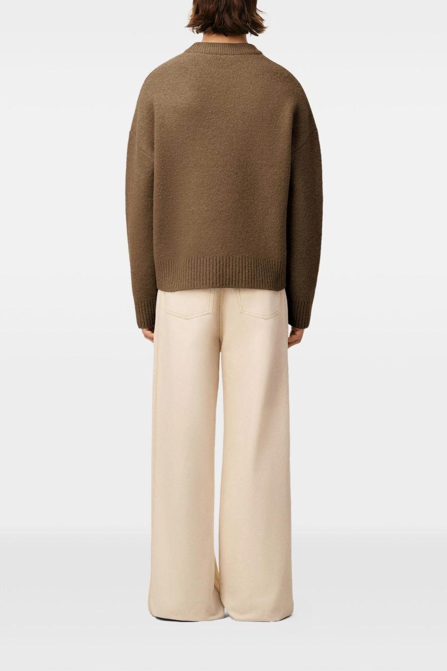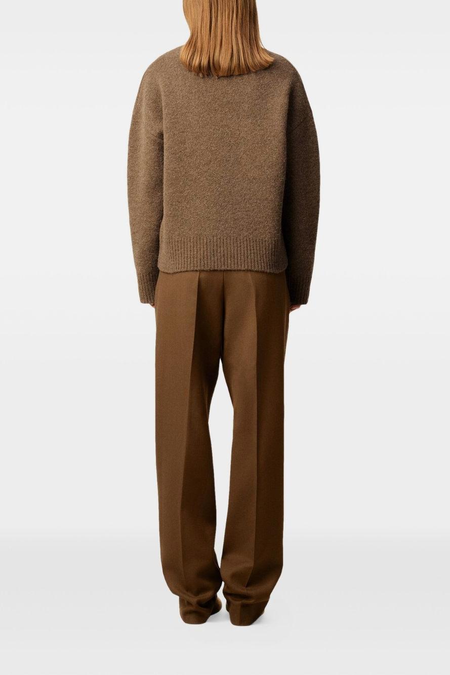 Proposto in marrone nocciola, presenta cuciture intrecciate, girocollo, maniche lunghe e finiture a coste su orlo e polsini. Un modello dal fascino intramontabile, perfetto per donare un tocco elegante e rilassato ai look quotidiani.