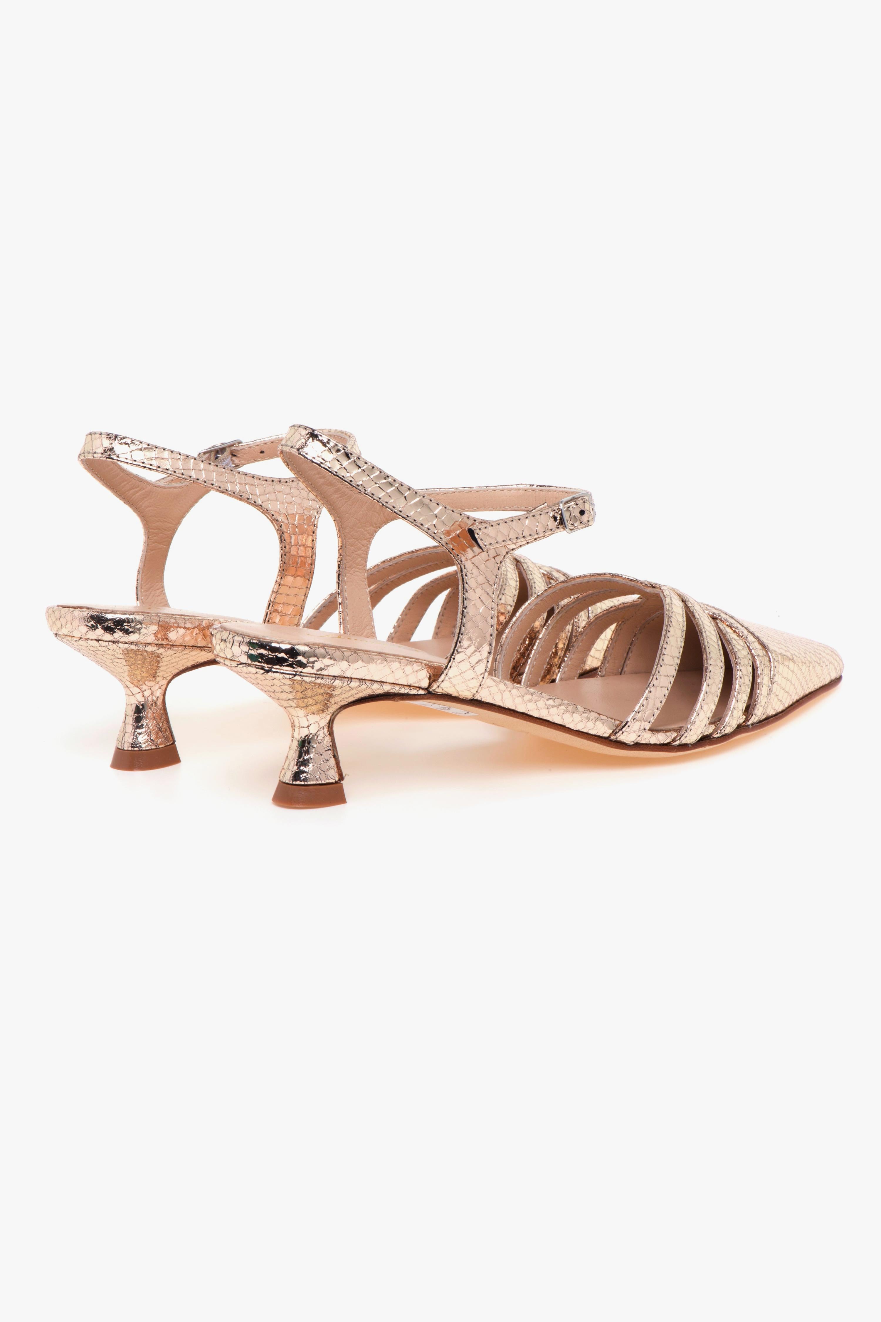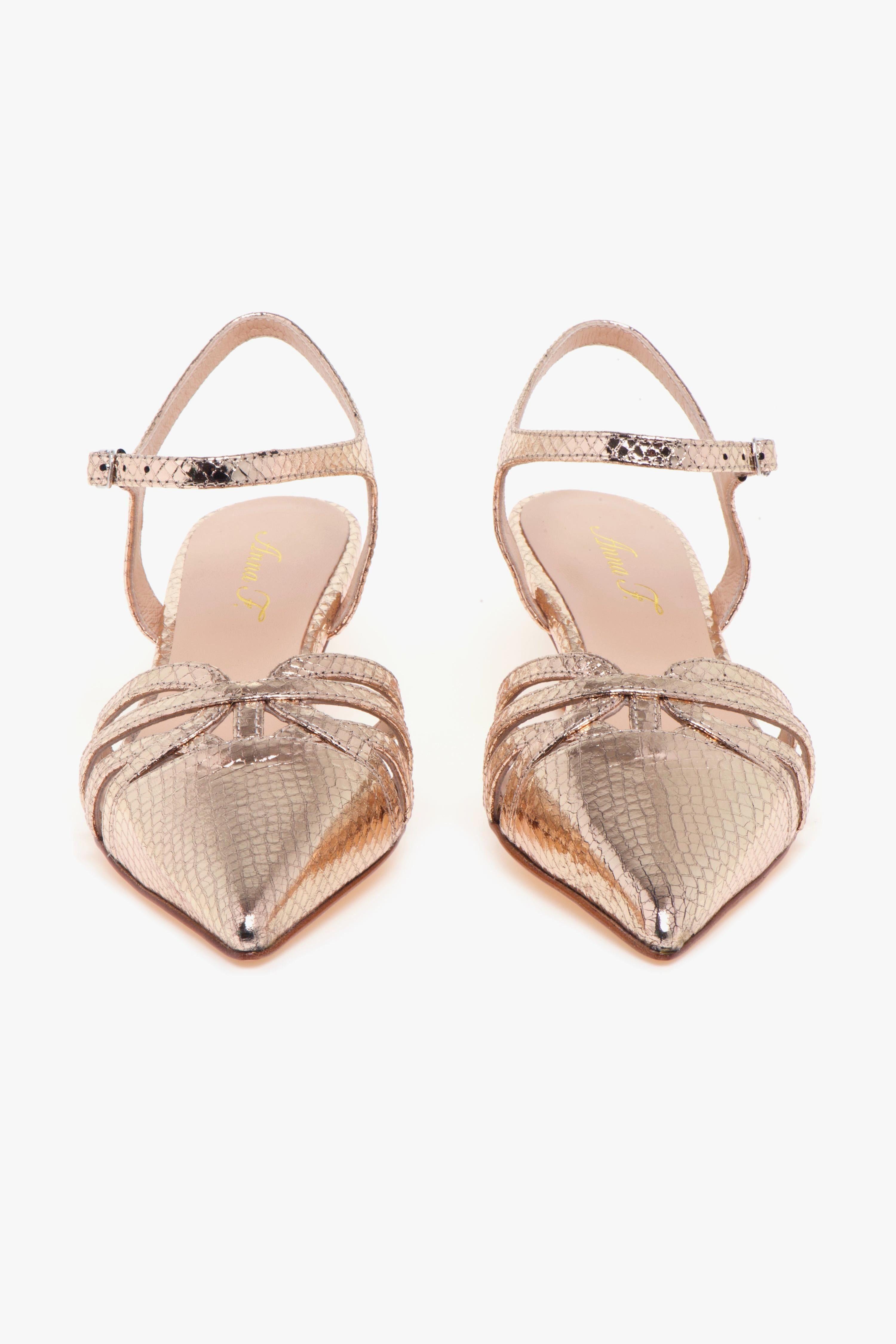 Un equilibrio impeccabile tra eleganza classica e fascino moderno per questo sandalo slingback ANNA F., proposto in pelle laminata con raffinata stampa rettile color platino. La punta chiusa dona struttura e sobrietà alla silhouette, mentre il cinturino regolabile alla caviglia assicura una calzata confortevole e ben definita. Il tacco da 55 mm garantisce stabilità e slancio, rendendolo ideale per accompagnare con stile le giornate più dinamiche. La qualità artigianale emerge nei materiali pregiati, dalla fodera al sottopiede in pelle, fino alla suola in cuoio, simbolo dell’eccellenza Made in Italy.Perfetto da indossare con abiti a tubino o completi estivi in lino per un look sofisticato e luminoso, ideale anche per occasioni speciali.# Tomaia in pelle laminata stampa rettile. # Cinturino regolabile. # Fodera in pelle. # Sottopiede in pelle.# Suola in cuoio. # Made in Italy.