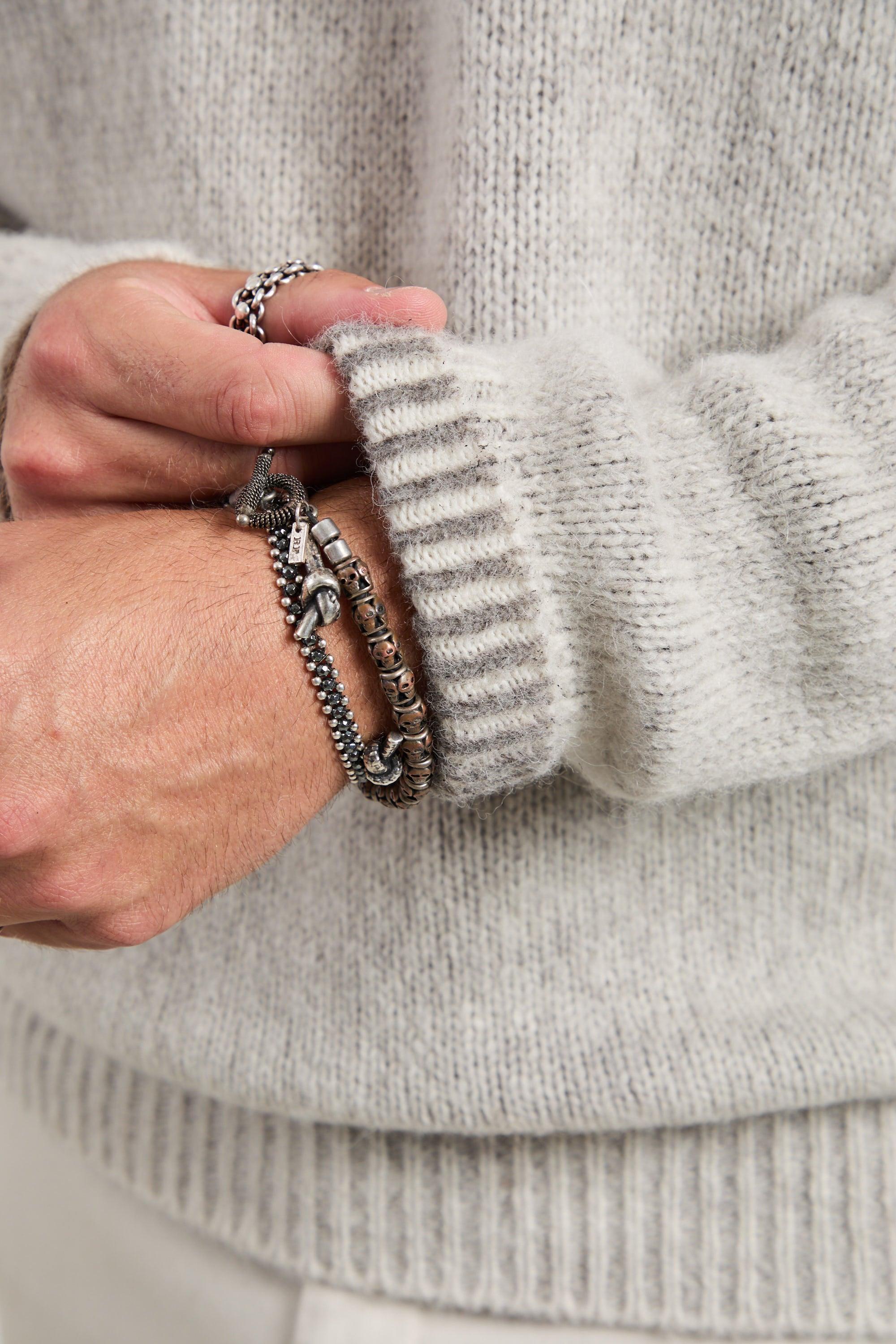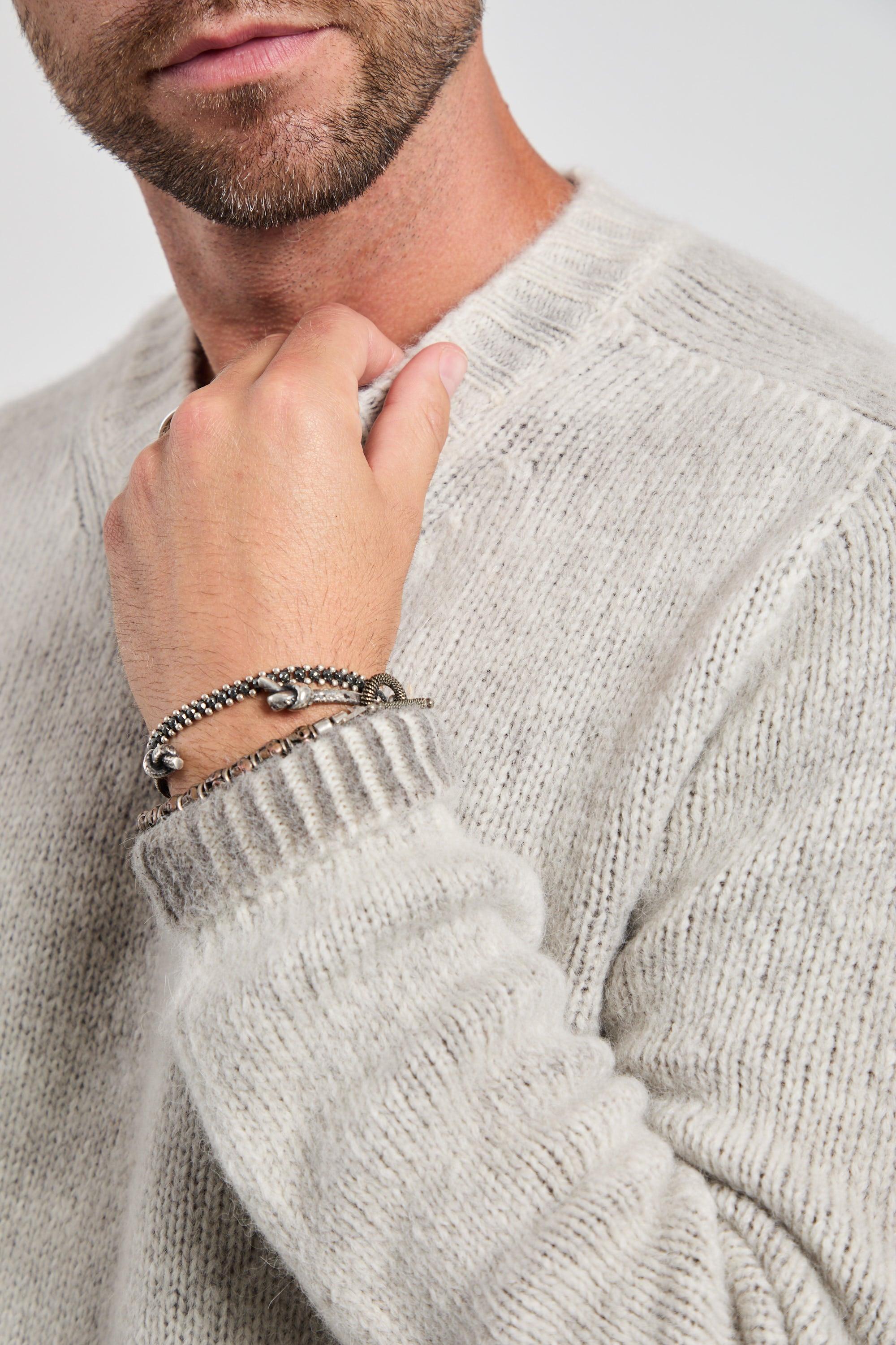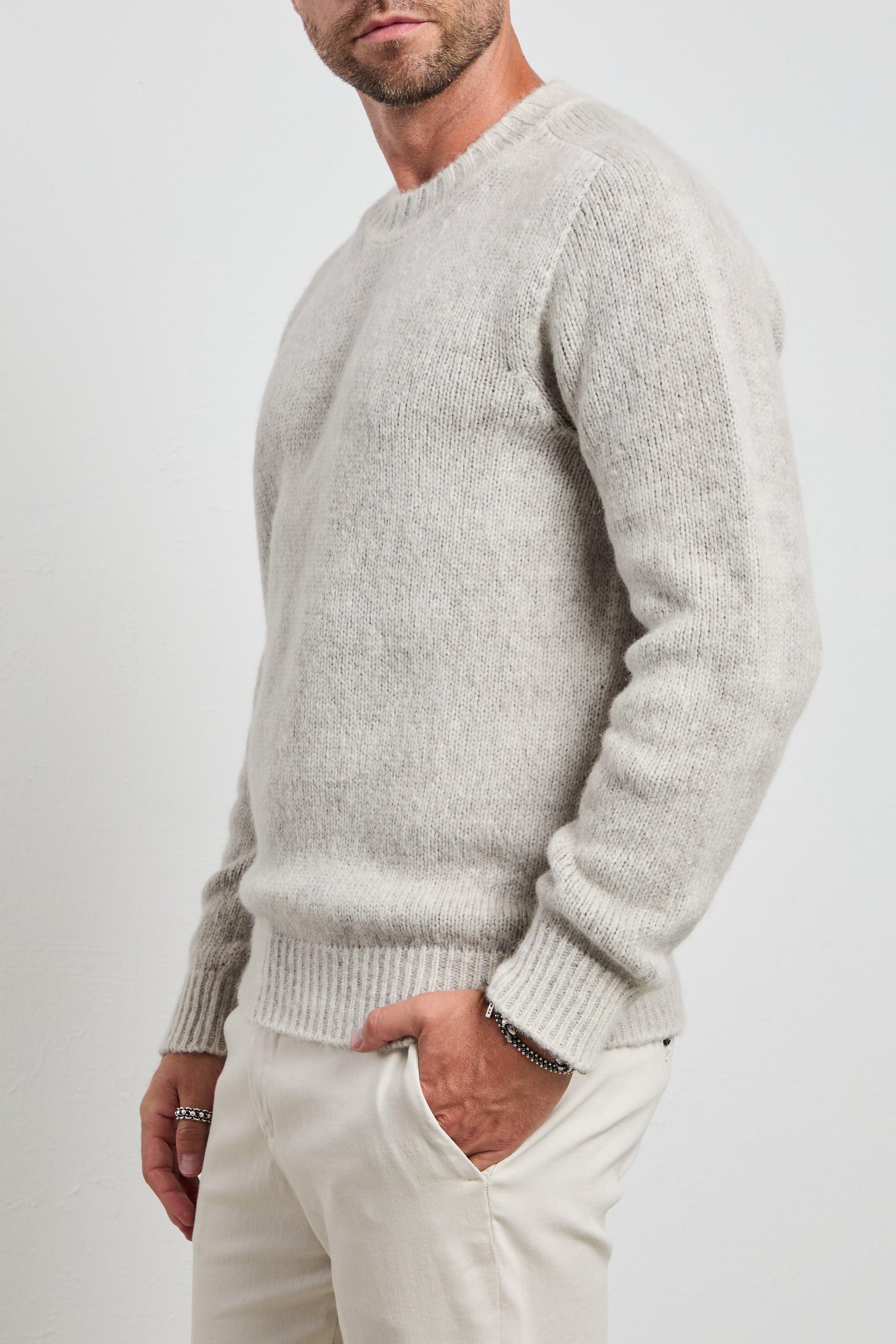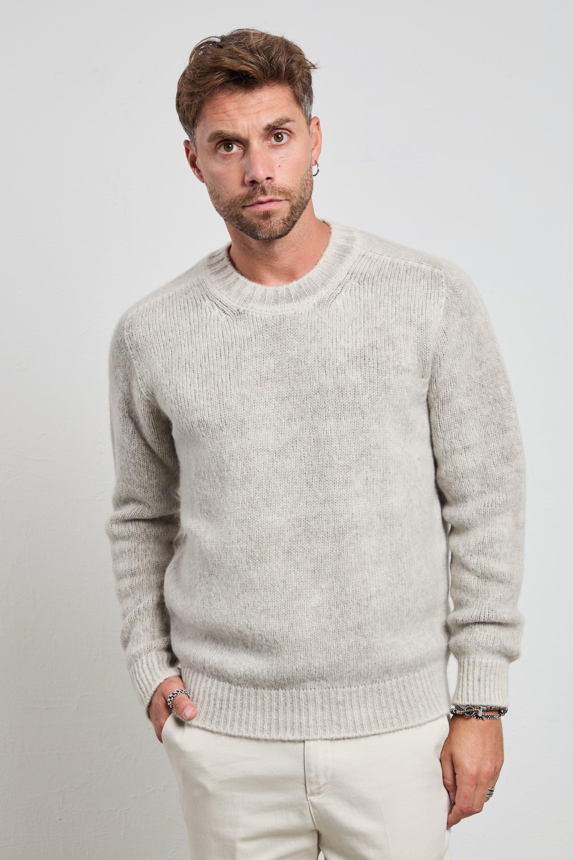 Maglia girocollo a manica lunga, realizzata senza cuciture per un comfort eccezionale. La lavorazione rasata con fondi e polsi a costa larga dona al capo un aspetto pulito e contemporaneo. Ogni pezzo è stampato a mano con speciali tecniche artigianali ad aerografo: il colore ghiaccio si diffonde dall’interno verso l’esterno creando sfumature irregolari e uniche. Questo processo rende ogni maglia un capo esclusivo e reversibile, con una mano particolarmente morbida e piacevole al tatto. Versatile e raffinata, questa maglia si presta a molteplici abbinamenti: perfetta con pantaloni in lana o denim scuro per un look casual sofisticato, oppure con chino e cappotto in tono neutro per uno stile urbano elegante. Può essere indossata anche sotto una giacca in pelle o un bomber per un contrasto contemporaneo e dinamico. Modello: girocollo in Alpaca Seamless a manica lunga, lavorazione senza cuciture Vestibilità: morbida Vita: lunghezza e caduta del capo pensate per aderire in modo fluido sul corpo Polsi e fondo: a coste elasticizzati Colore: ghiaccio Composizione: 72% alpaca, 25% poliammide, 3% elastan Fondo e polsi: fondo dritto, polsi e fondo rifiniti a costa larga Taglia indossata in foto: 52 Made in Italy