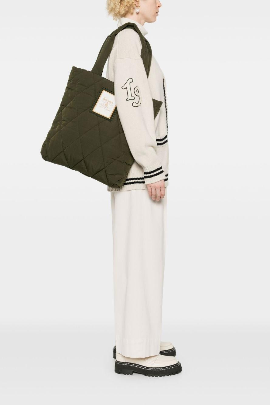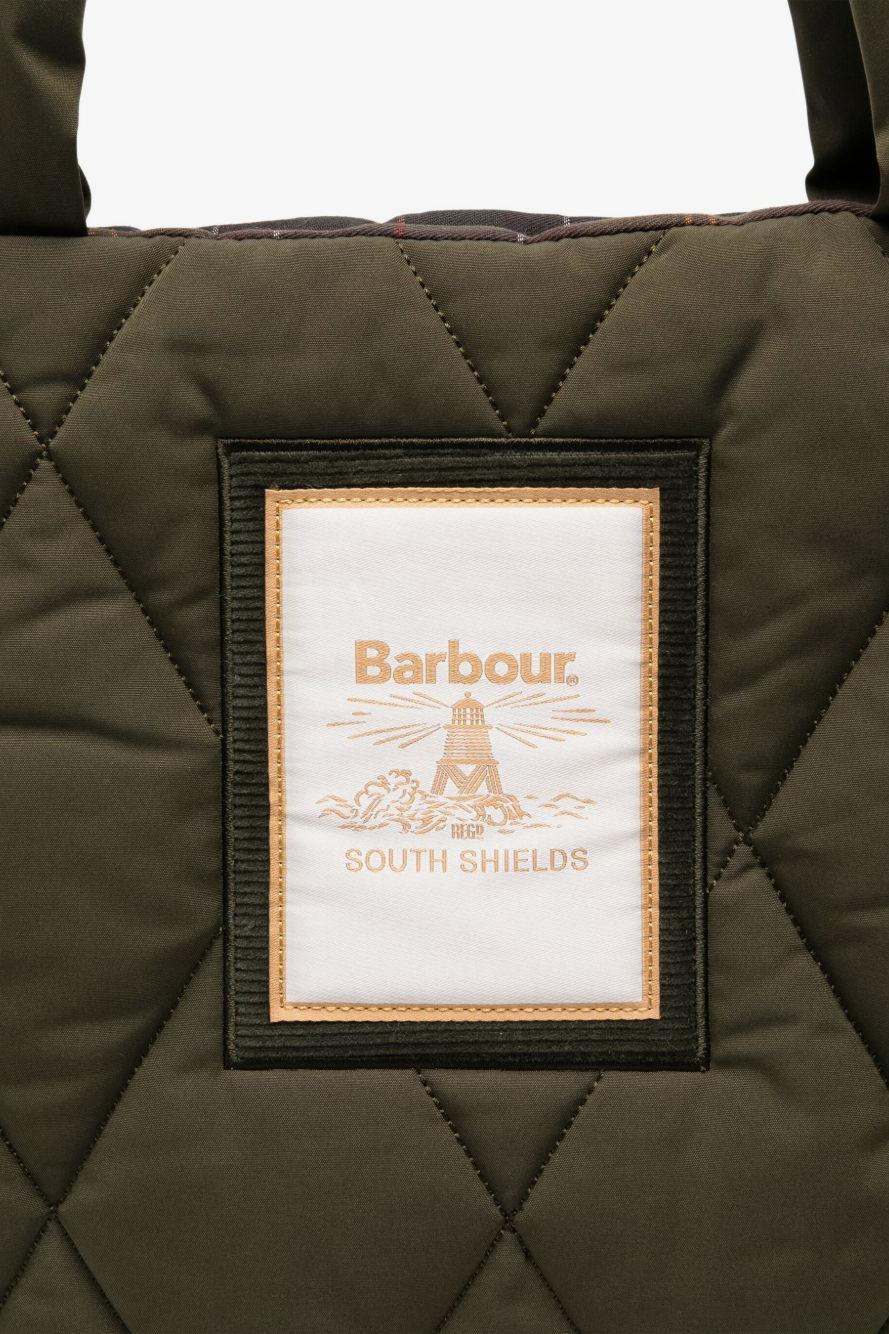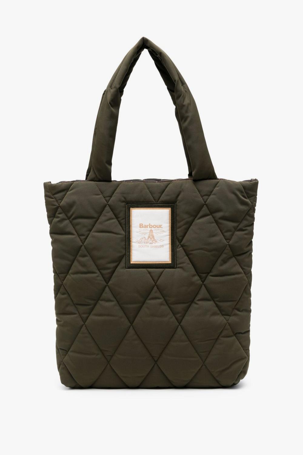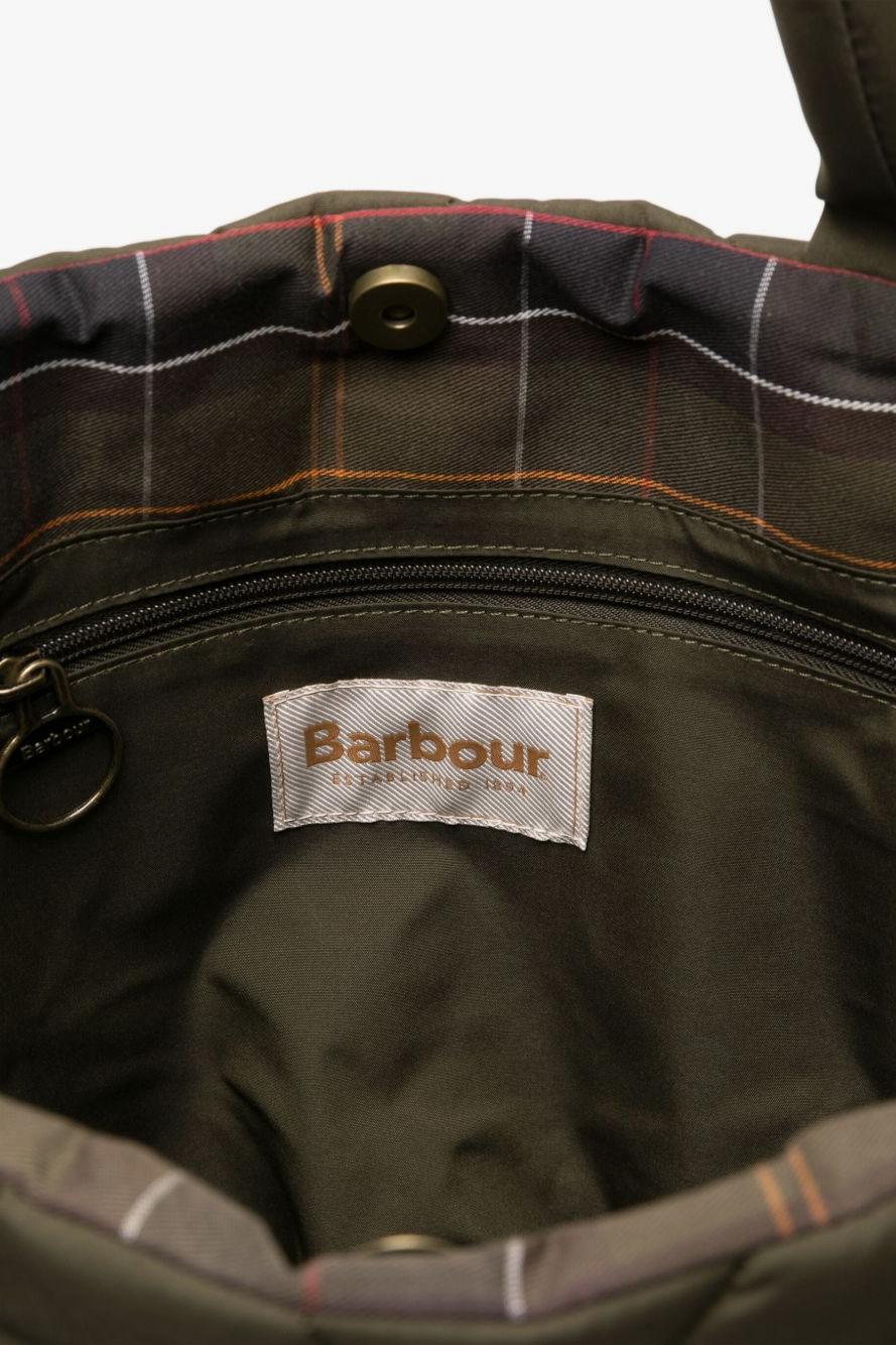 Proposta in verde scuro, presenta una finitura in rilievo con trapuntatura a diamante, design imbottito e chiusura magnetica. Dotata di due manici piatti, scomparto unico e tasca interna con zip, è arricchita dall’applicazione frontale con logo Barbour e dal dettaglio interno con logo che ne sottolineano l’autenticità.