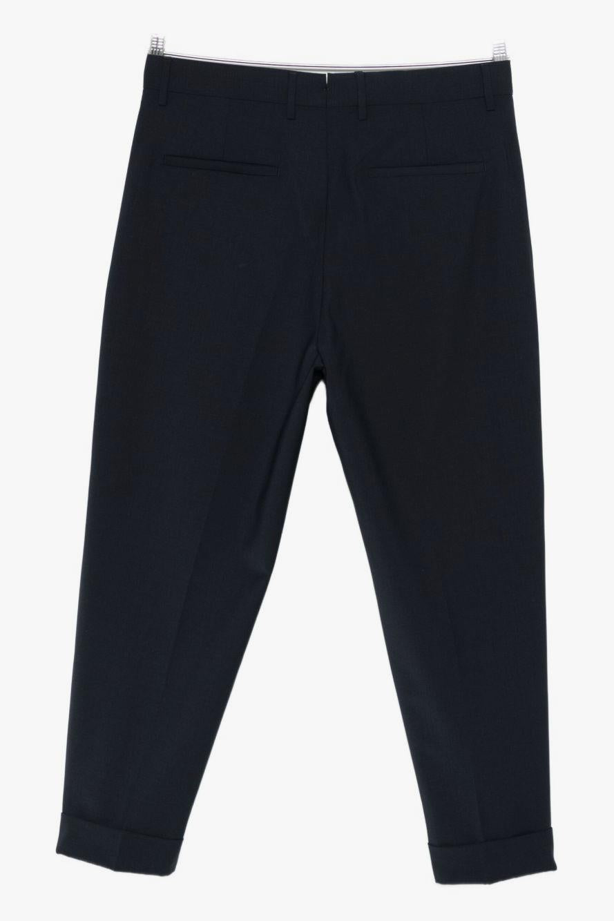 Eleganza discreta e sartorialità italiana si fondono nei pantaloni Chiaia firmati Berwich, realizzati in un pregiato mix di lana, poliestere ed elastan che assicura comfort e vestibilità impeccabile.Il colore blu navy dona al modello un’eleganza senza tempo, ideale per outfit formali o look business casual.La chiusura a bottoni, i passanti in vita e le pieghe frontali valorizzano la linea classica, mentre l’orlo con risvolto aggiunge un tocco raffinato di stile sartoriale.