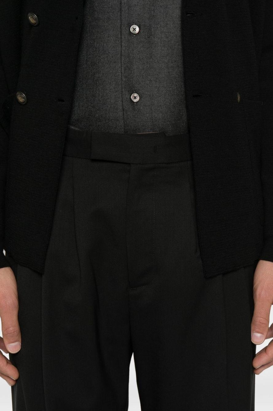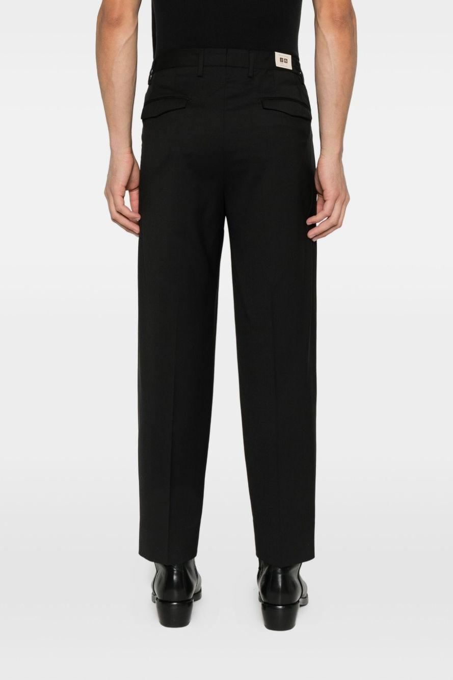 Proposti in nero, presentano inserti laterali elasticizzati che garantiscono una calzata comoda e adattabile, una chiusura frontale con bottoni e passanti per cintura per uno stile classico e versatile. Le tasche laterali e i dettagli plissettati aggiungono un tocco sartoriale distintivo, mentre la fodera in cotone 100% assicura traspirabilità e comfort durante l’intera giornata.