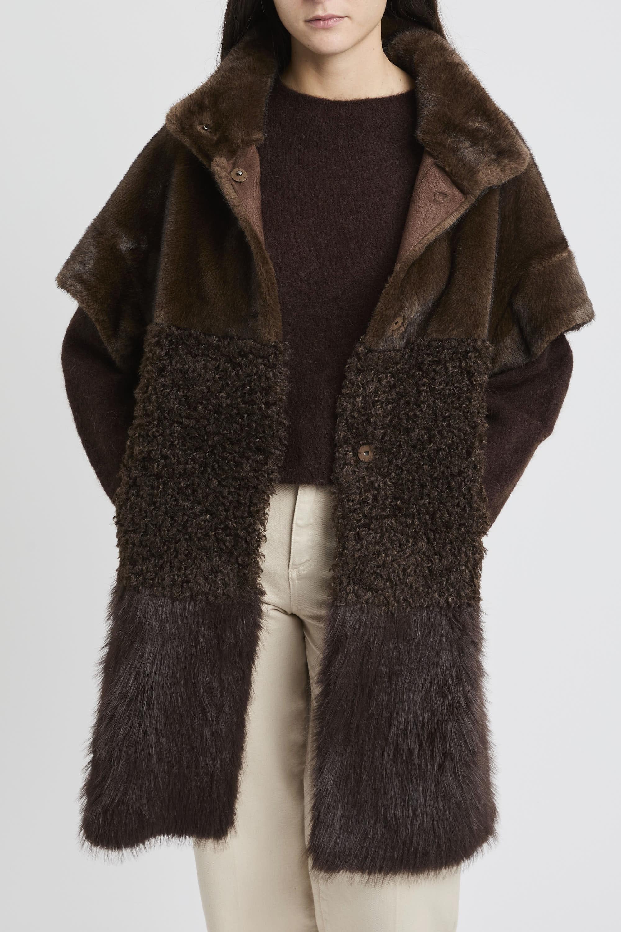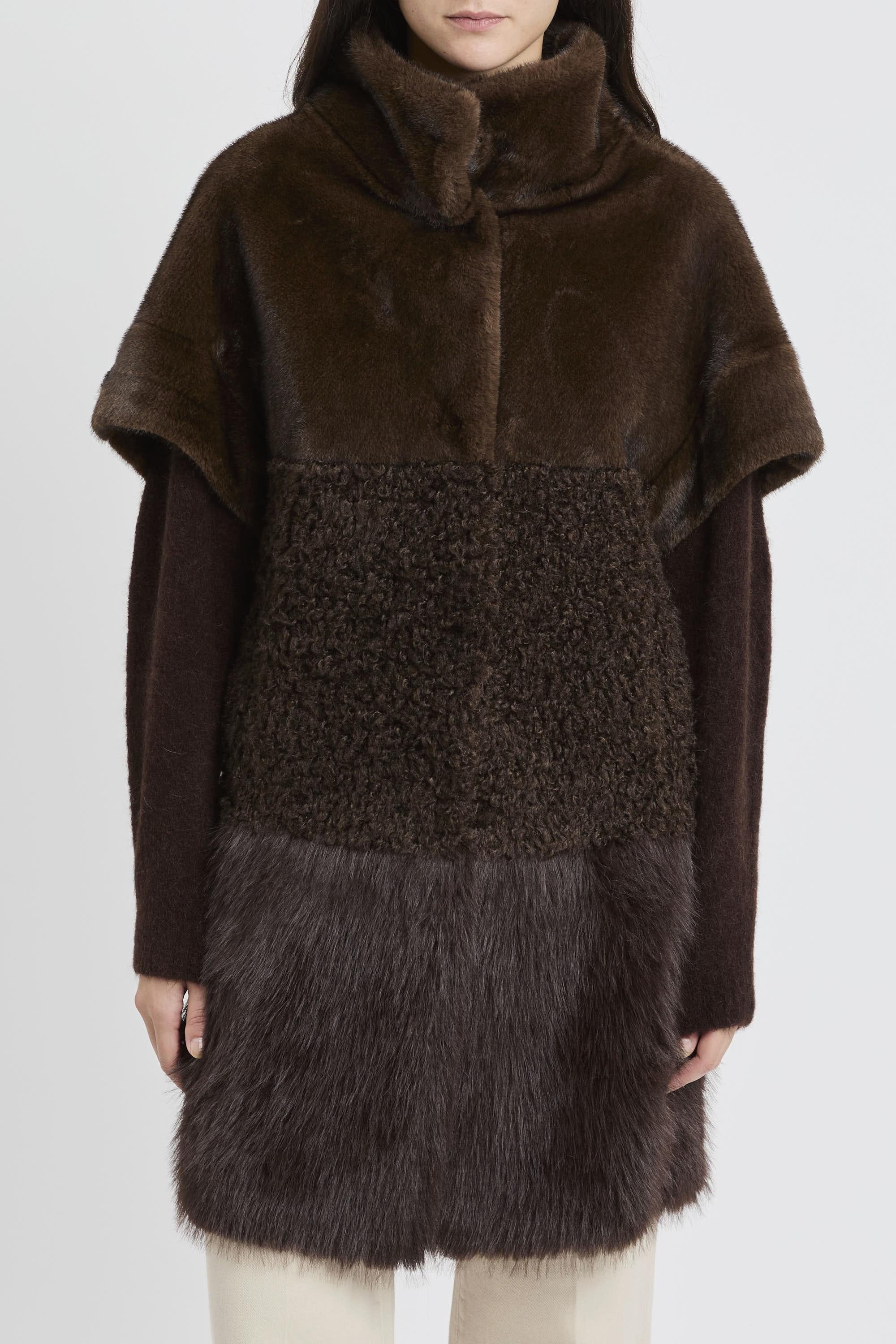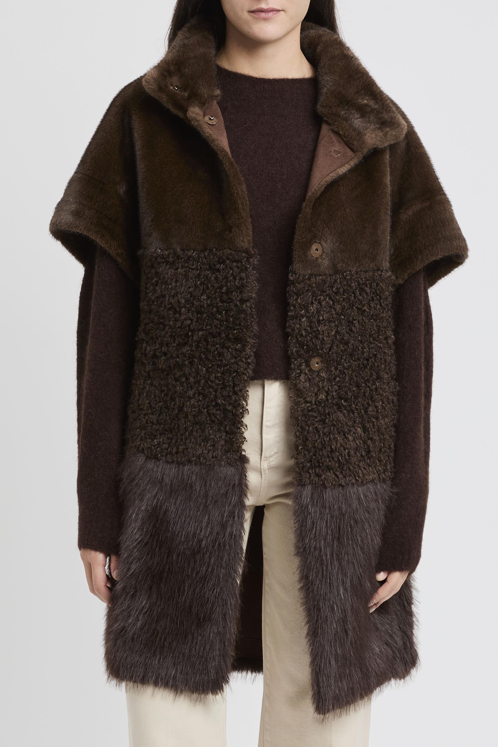 Ecopelliccia Bully a manica corta dal carattere contemporaneo: l’accostamento di due pellicce sintetiche differenti crea una texture materica ricca di movimento, estremamente soffice al tatto. Il collo alto protegge dal freddo e definisce il design, mentre la chiusura con bottoni mantiene il profilo pulito.Le tasche a filo frontali completano un capospalla versatile, ideale per aggiungere volume e calore con leggerezza.Caratteristiche principali:# Ecopelliccia Bully a manica corta.# Mix di due tipologie di pelliccia sintetica per effetto texturizzato.# Collo alto.# Chiusura con bottoni.# Tasche a filo frontali.# Composizione esterna: 100% poliestere.# Fodera: 100% poliestere.