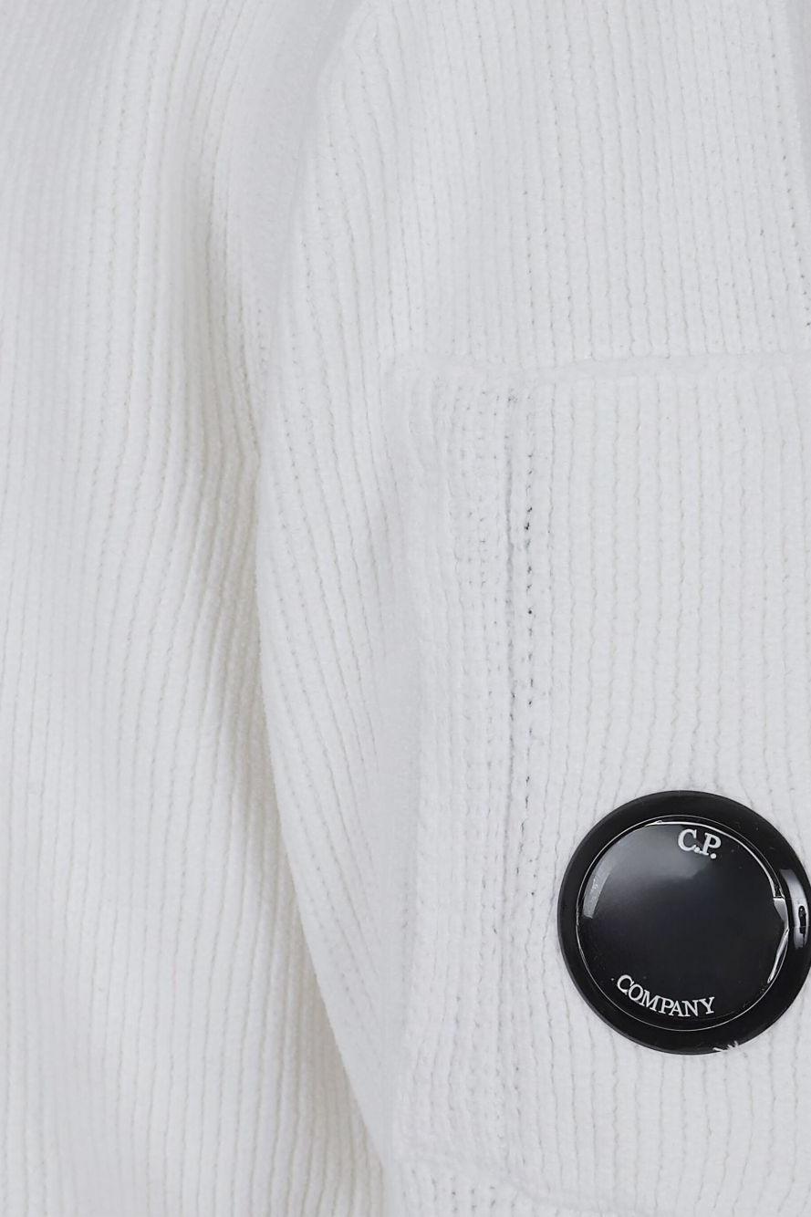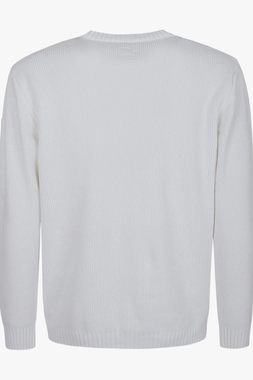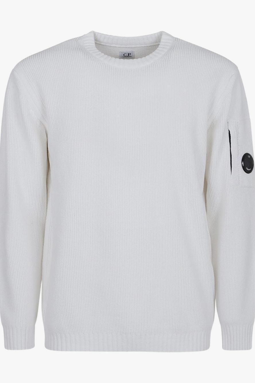 Proposto in bianco, è caratterizzato da un girocollo classico, maniche lunghe e dal distintivo motivo Lens sulla manica, simbolo inconfondibile dell’estetica C.P. Company.