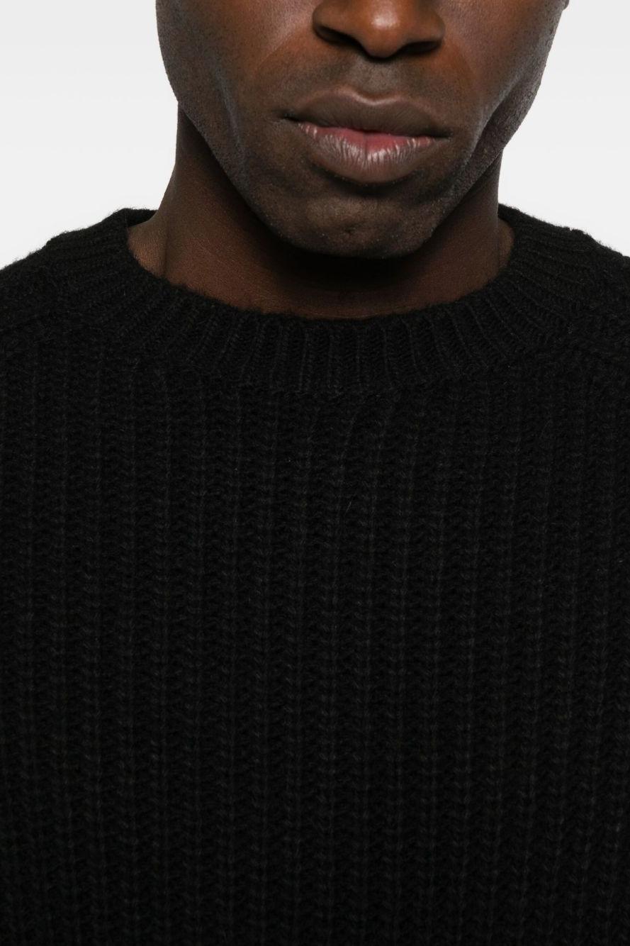 Proposto in nero, presenta lavorazione a maglia a coste, girocollo classico, maniche lunghe e applicazione frontale con logo, dettaglio distintivo del brand. Il design essenziale e la texture strutturata lo rendono ideale per look casual e contemporanei.
