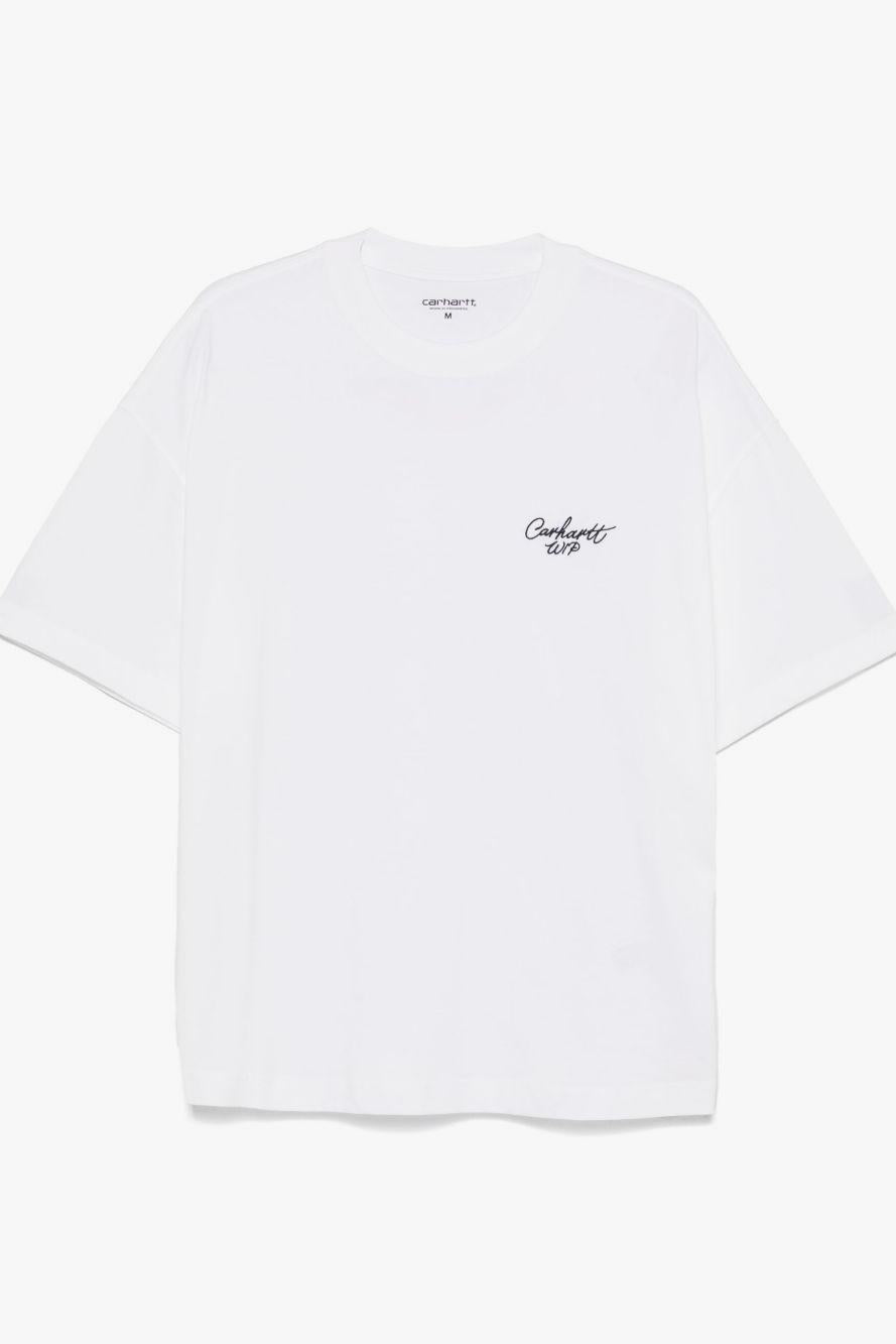 Proposta in bianco, presenta girocollo classico, maniche corte e il caratteristico logo Carhartt WIP Signature Script stampato sul petto, per un tocco distintivo e contemporaneo. Un modello versatile, perfetto per completare look casual e streetwear.