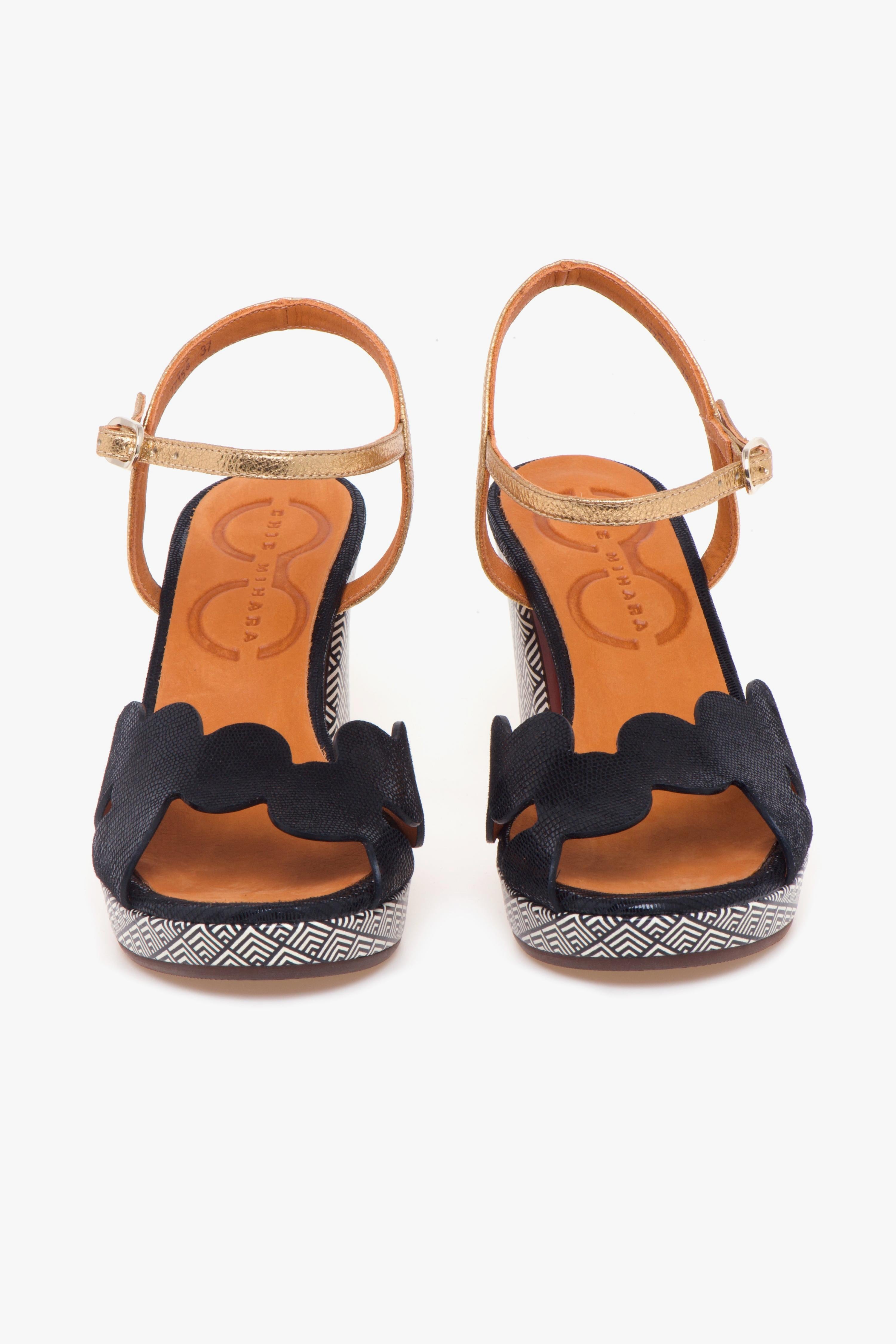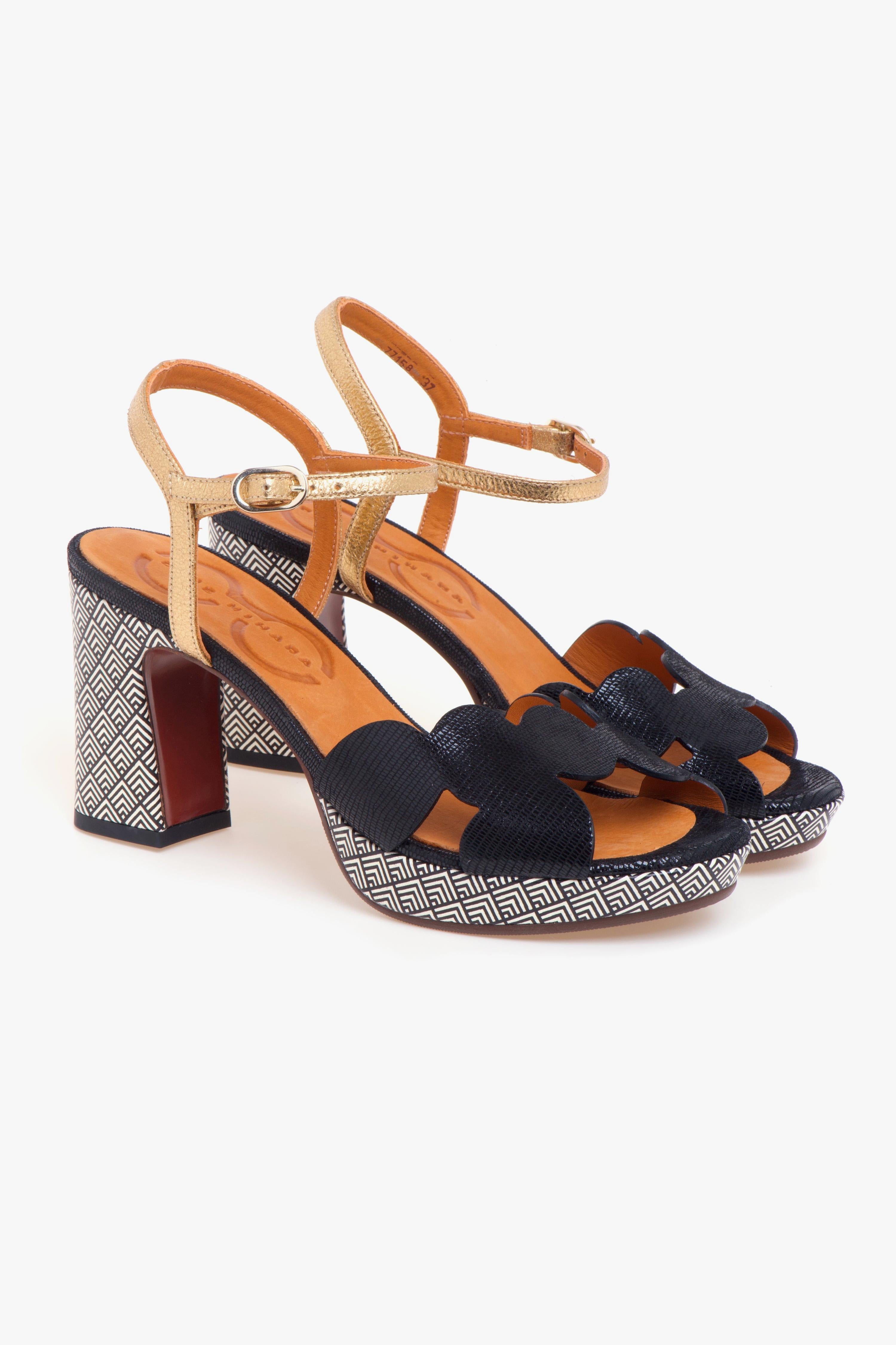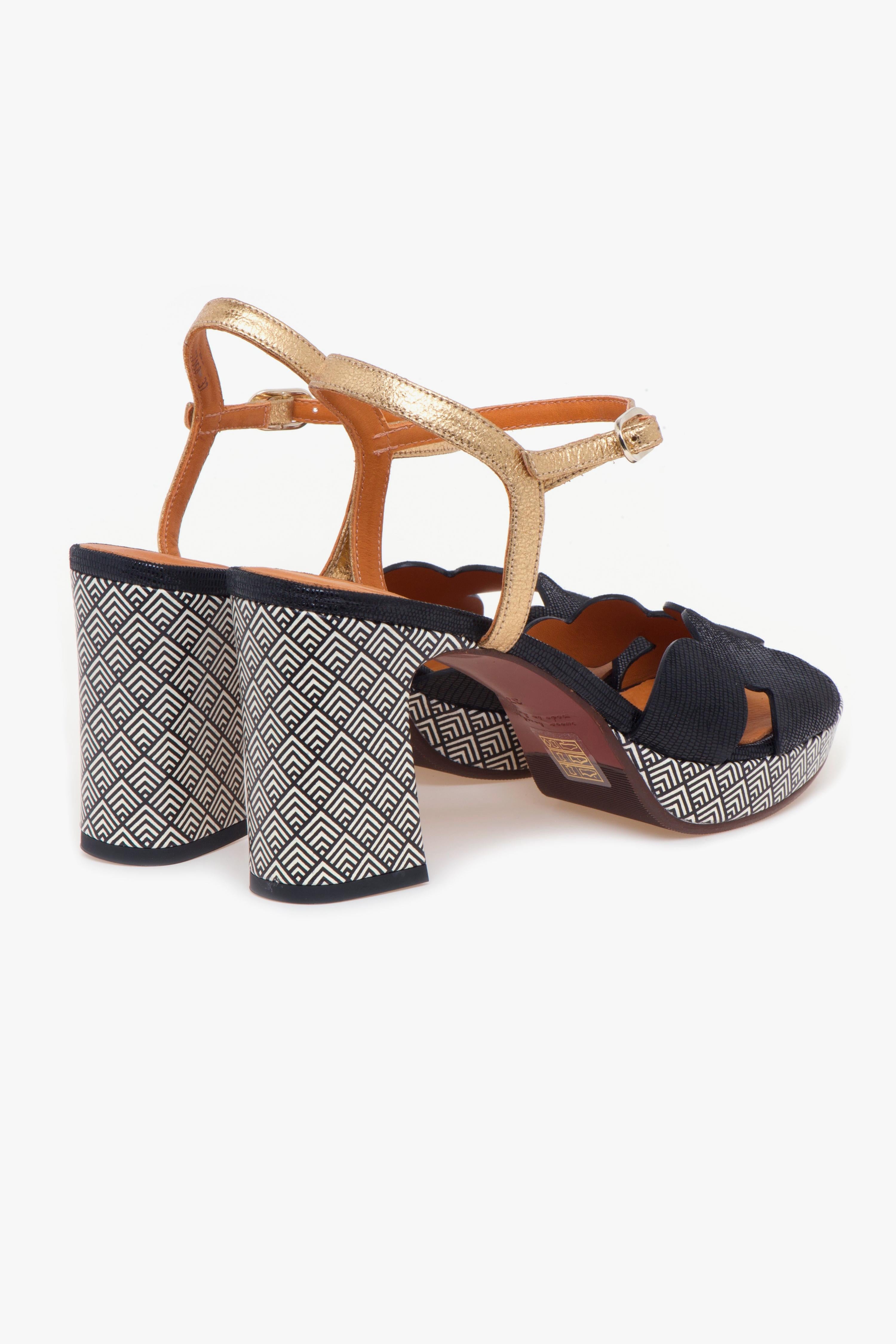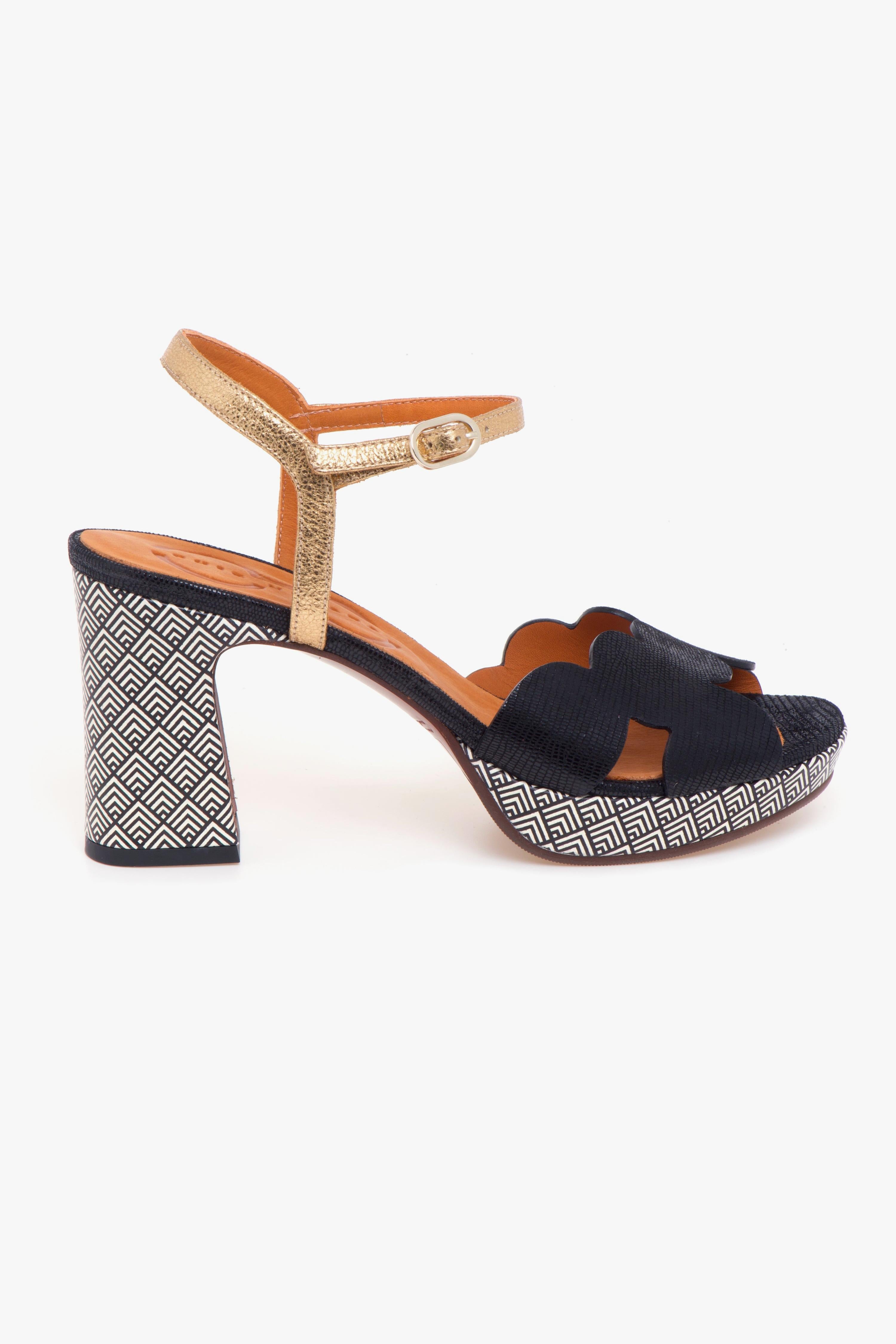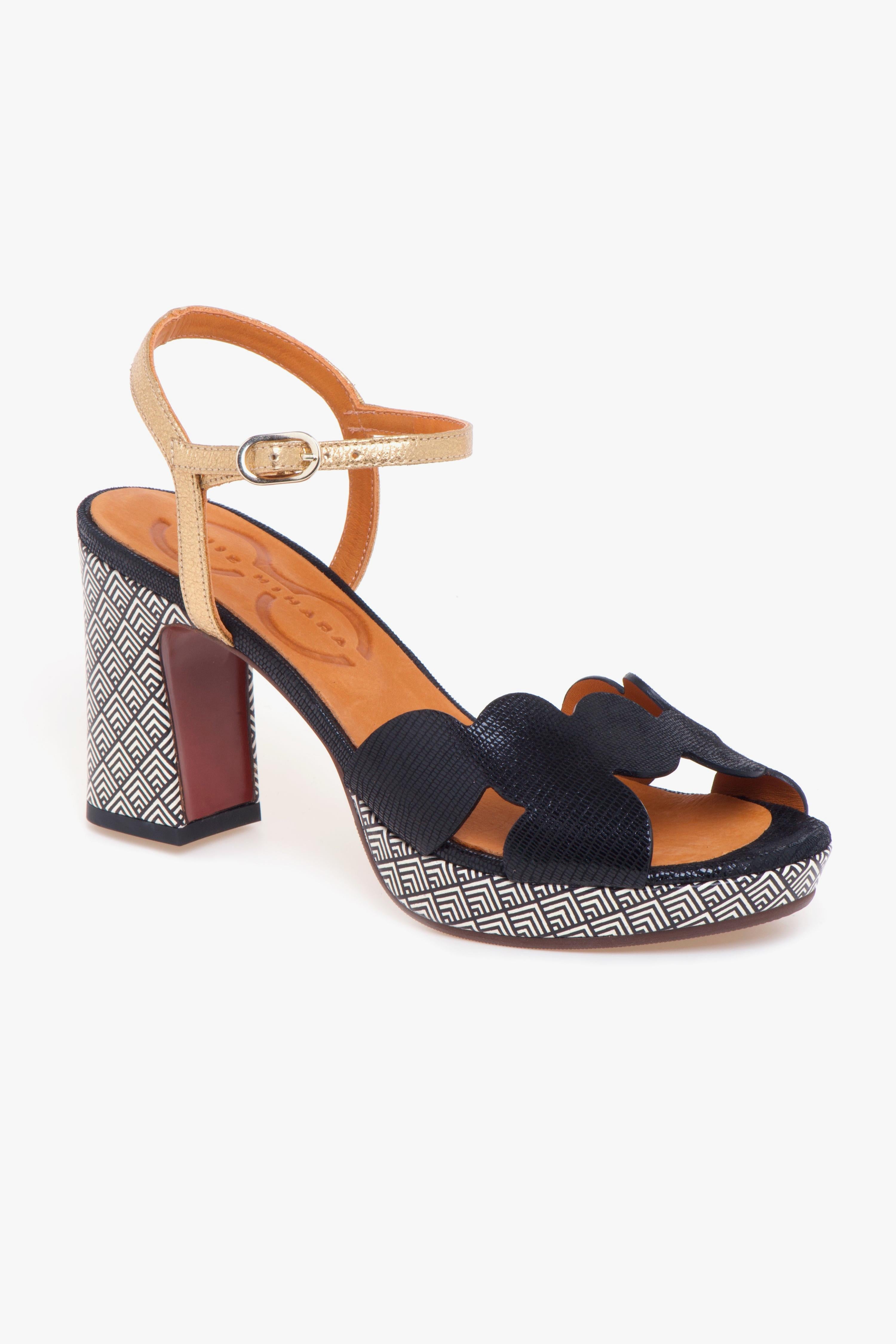 Sandalo Chie Mihara in pelle, dall’equilibrio impeccabile tra originalità e raffinatezza. La tomaia si distingue per la fascia in pelle effetto rettile nera, dal taglio asimmetrico realizzata con una sequenza di elementi tondeggianti che richiamano la geometria del cerchio. Il cinturino in pelle laminata con fibbia regolabile aggiunge un dettaglio luminoso e femminile, completando la silhouette con eleganza.Tacco da 85 mm e plateau da 15 mm sono entrambi rivestiti in pelle con stampa geometrica dalla grafica black & white: un contrasto visivo deciso che esprime il carattere audace e moderno tipico delle creazioni Chie Mihara. L’altezza è ben bilanciata dal plateau, rendendo la calzata confortevole anche nelle occasioni che richiedono più ore in piedi.Ideale per chi ama distinguersi con accessori ricercati ma facili da abbinare, questo sandalo accompagna perfettamente sia un look da giorno dal gusto casual-chic – come un completo in lino o un paio di jeans flare con camicia oversize – sia un abito midi per un aperitivo elegante o un evento serale.# Tomaia in pelle. # Tacco 85 mm. # Plateau 15 mm.# Dislivello 70 mm. # Fodera in pelle. # Sottopiede in pelle. # Suola in gomma.