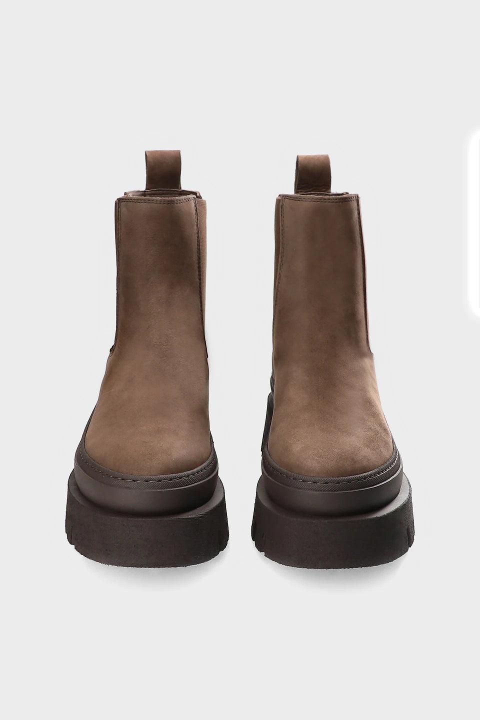 Stivaletti Chelsea alti fino alla caviglia in morbida pelle nabuk. Silhouette robusta. Inserti elastici con dettagli ricamati. Passante posteriore. Logo dorato all'esterno. Punta tonda. Suola platform con profilo distintivo, tacco a blocco e parafango. Stivaletti Chelsea espressivi con elementi robusti e dettagli minimalisti.Dettagli del prodotto- Materiale esterno: morbida pelle nabuk italiana- Soletta interna imbottita e rimovibile in pelle- Suola flessibile, antiscivolo e resistente- Fatto a mano in Portogallo