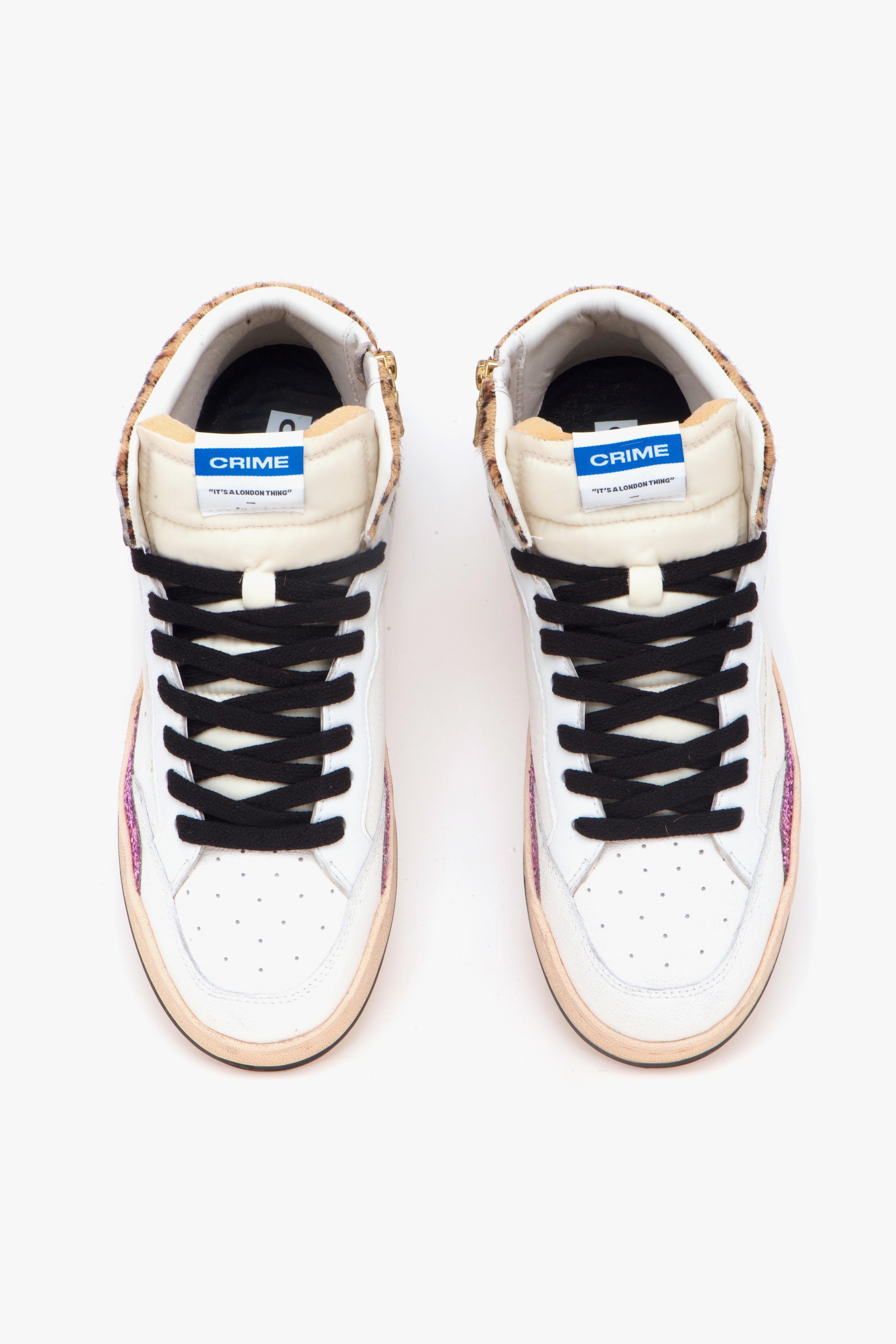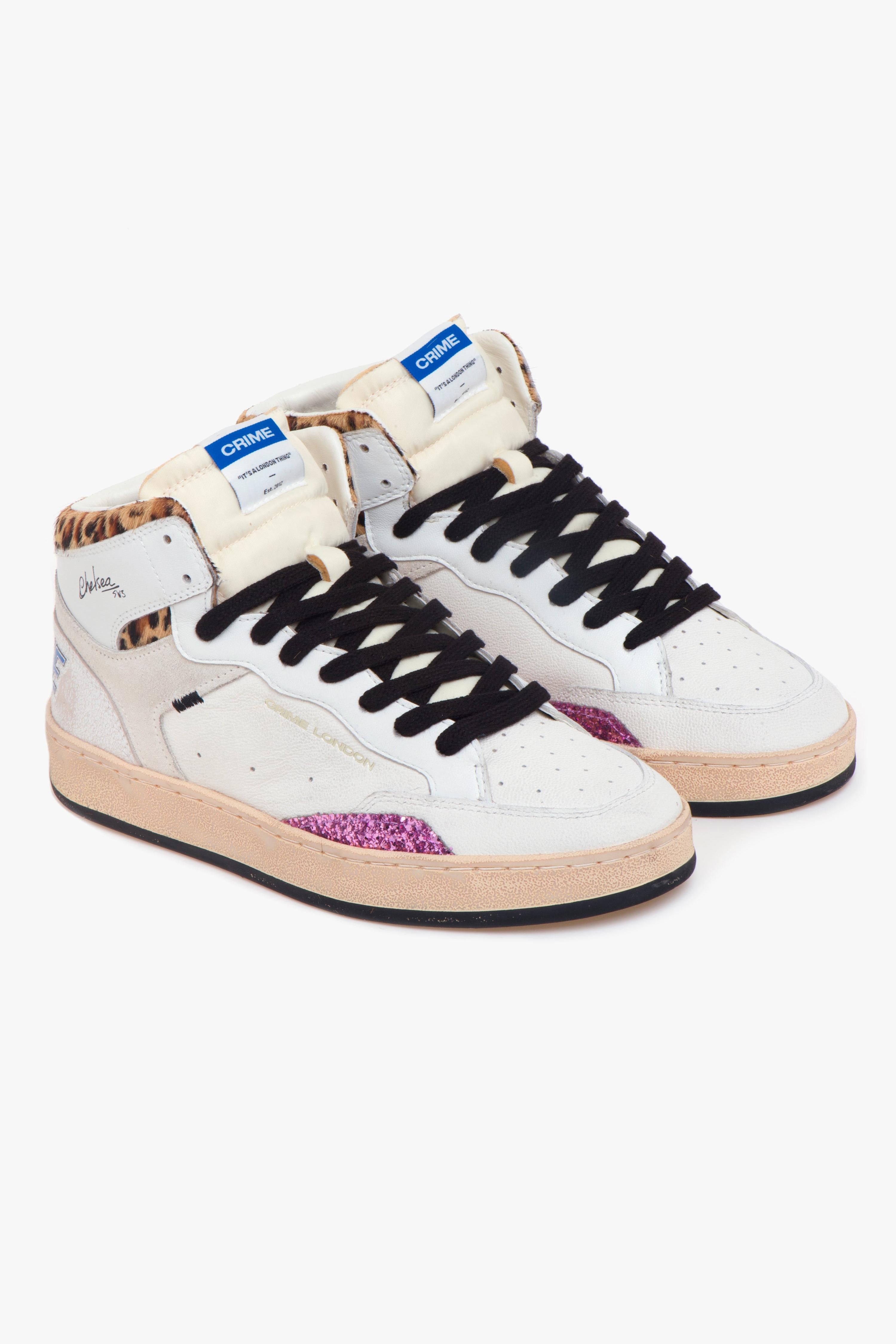 “Chelsea Hi” di Crime London eleva il DNA basket in una versione high-top femminile e attuale. La tomaia in pelle bianca, lavorata con texture diverse, è impreziosita da inserti in cavallino maculato e glitter viola per un equilibrio tra luce e carattere. Il tallone in pelle cracklè tono su tono dialoga con il maxi lettering “Crime” in contrasto azzurro lucido, dettaglio grafico che firma la silhouette. La suola in gomma beige effetto vintage con battistrada nero supporta l’uso quotidiano; all’interno, fodera in tessuto e sottopiede estraibile in pelle assicurano traspirabilità e praticità per tutta la giornata.Caratteristiche principali: # Modello donna Crime London “Chelsea Hi”# Profilo high-top con ispirazione basket contemporanea.#Tomaia in pelle bianca con texture differenziate.# Inserti in cavallino maculato e glitter viola.# Tallone in pelle cracklè tono su tono.# Maxi lettering “Crime” in finitura azzurro lucido.# Suola in gomma beige effetto vintage.# Battistrada nero.# Fodera in tessuto.# Sottopiede estraibile in pelle.