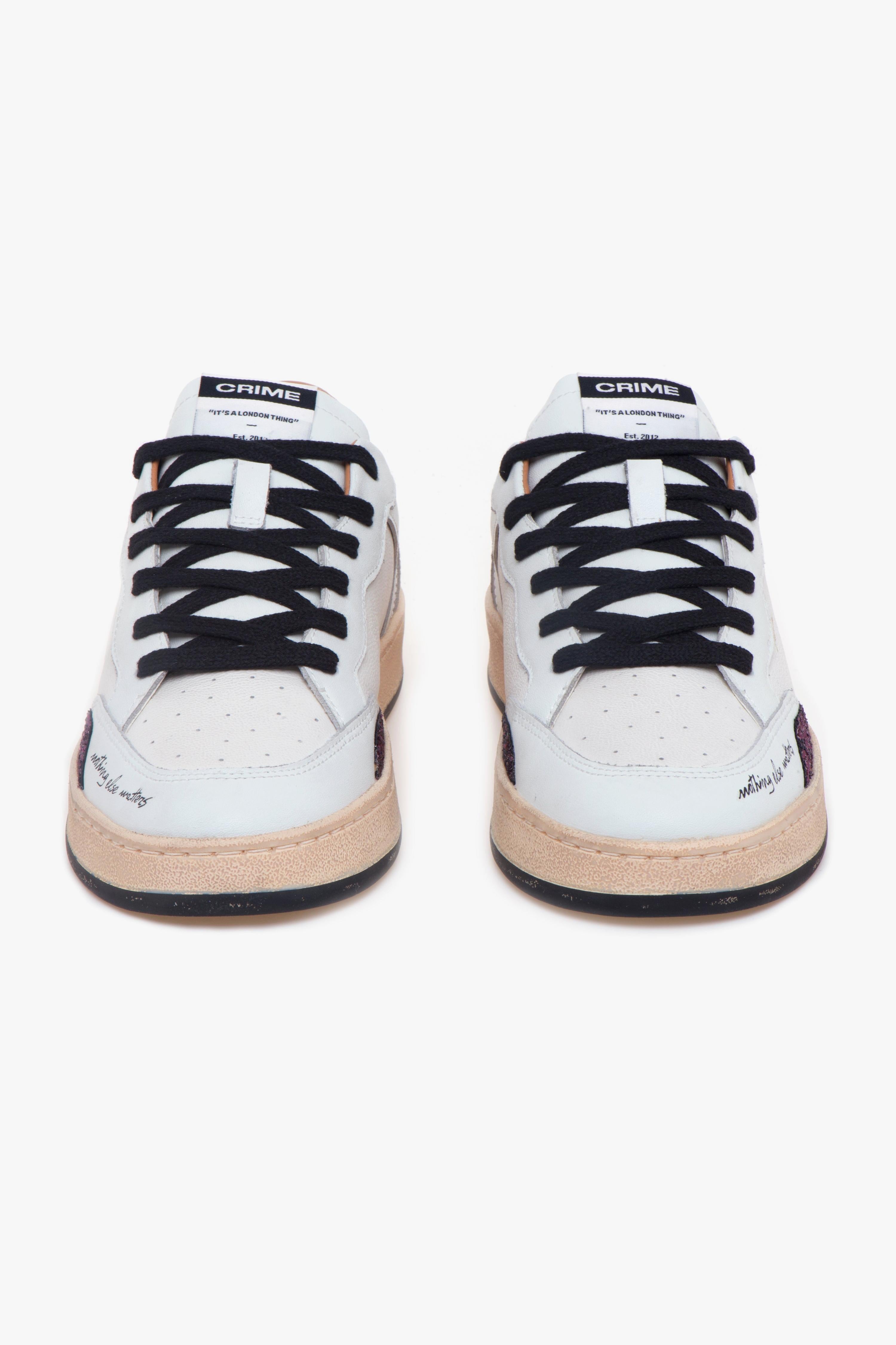 "Chelsea" di Crime London porta il DNA basket in una versione femminile e attuale: la tomaia in pelle bianca abbinata ad inserti in glitter viola, talloncino in camoscio beige e rinforzo tallone in pelle cracklè, creano un contrasto ricercato ma equilibrato. Il maxi lettering “Crime” sul retro, in finitura platino, aggiunge un accento grafico discreto e riconoscibile. La suola in gomma beige effetto vintage con battistrada nero sostiene la camminata quotidiana, mentre fodera in tessuto e sottopiede estraibile in pelle assicurano traspirabilità e praticità nell’uso di ogni giorno.Consiglio di stile: ideale con denim dritto o cargo chiaro e T-shirt essenziale; per un tocco urbano-chic, completare con blazer o bomber e accessori in tonalità platino che richiamano il dettaglio sul tallone.Caratteristiche principali:# Modello donna Crime London “Chelsea”.# Ispirazione basket rivisitata in chiave contemporanea.# Tomaia in pelle bianca con inserti in glitter viola.# Talloncino in camoscio beige e tallone in pelle cracklè.# Maxi lettering “Crime” sui talloni in color platino.# Suola in gomma beige effetto vintage.# Battistrada nero con logo Crime in rilievo.# Fodera in tessuto.# Sottopiede estraibile in pelle.