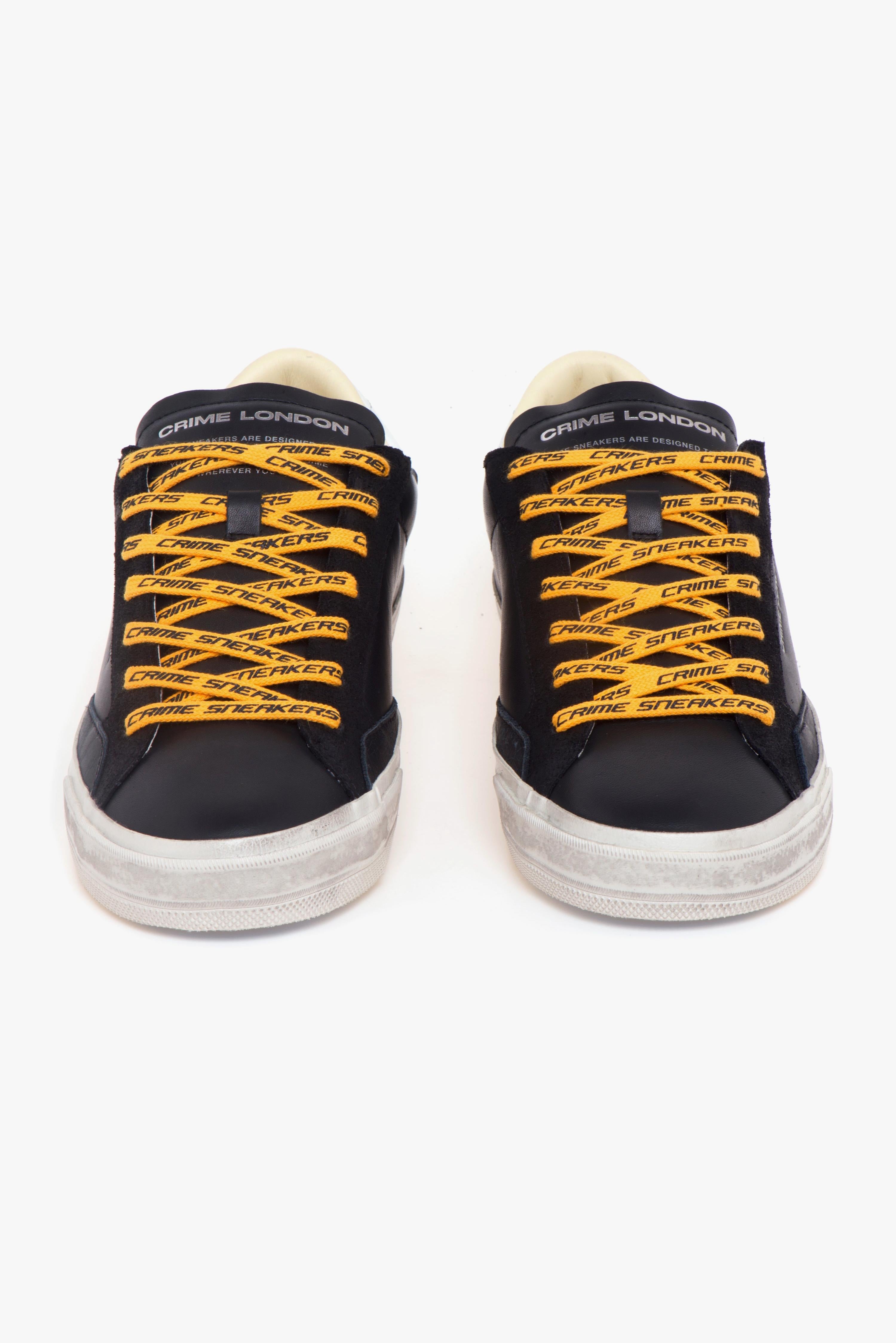Crime London aggiorna uno dei modelli più iconici del brand con la nuova versione della sneaker "Distressed".Rimane l’estetica essenziale della tomaia ma è stata aggiornata la suola in gomma che ora presenta un design tutto nuovo con una decorazione realizzata a mano lungo il profilo in colore a contrasto.La tomaia alterna camoscio e pelle nera tono su tono per un gioco di texture raffinato; il talloncino in pelle bianca illumina il profilo, mentre i lacci arancio personalizzati “Crime Sneaker” introducono un accento grafico deciso.il battistrada infine è in color ottanio dando un ulteriore cenno di colore alla scarpa.L'interno è curato e presenta una fodera in pelle/tessuto e un sottopiede estraibile in pelle, pensati per comfort e praticità nel quotidiano.Caratteristiche principali: # Modello Crime London “Distressed 2.0”.# Tomaia in camoscio e pelle nera tono su tono.# Talloncino in pelle bianca a contrasto.# Lacci arancio con logo “Crime Sneaker”.# Nuova suola in gomma con patina effetto vintage realizzata a mano.# Profilo suola dipinto a mano.# Battistrada color ottanio.# Fodera in pelle e tessuto.# Sottopiede estraibile in pelle.# Pensata per un uso quotidiano confortevole.