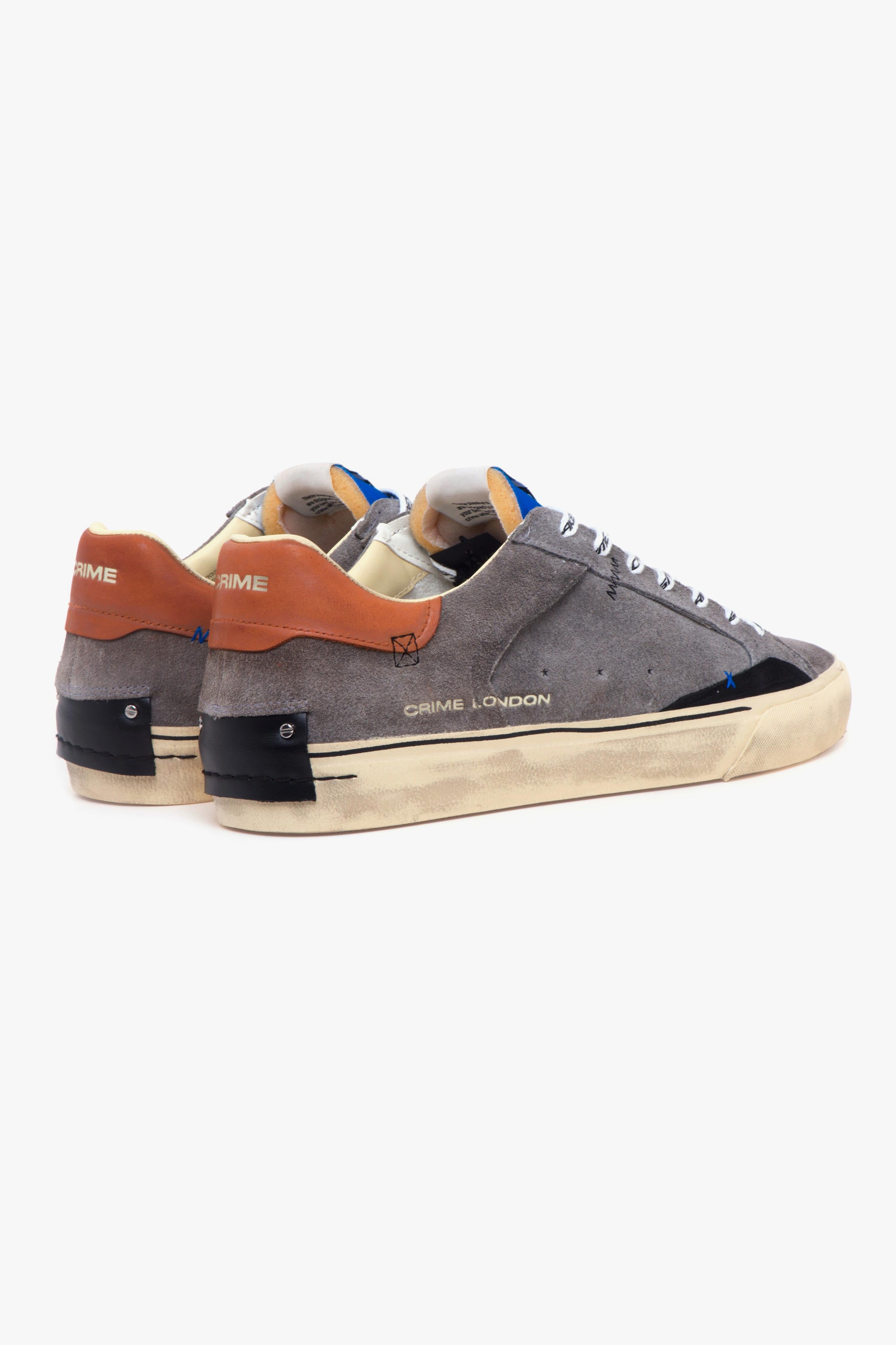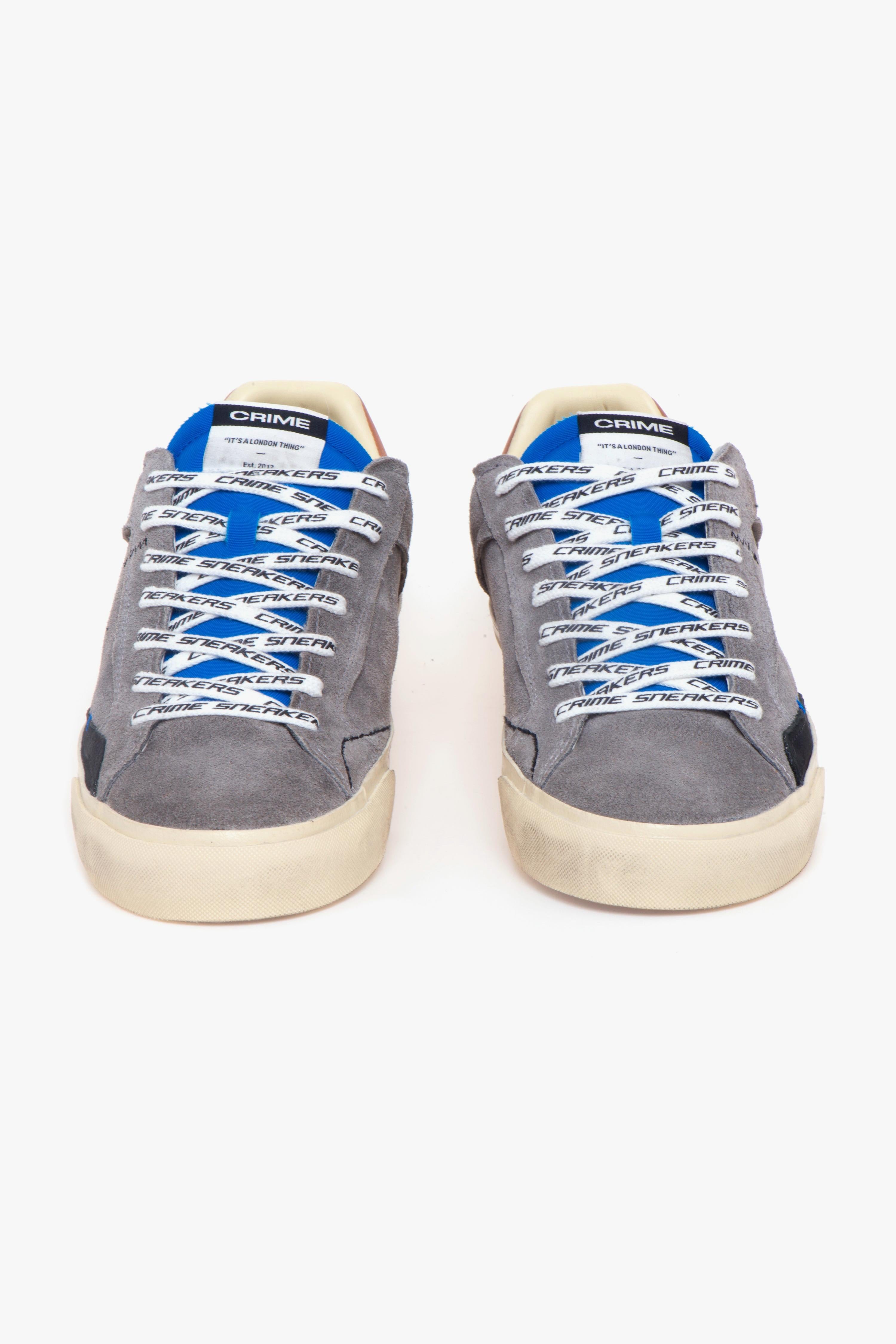 Sneaker Crime London in camoscio dal carattere giovane e dinamico: il grigio della tomaia dialoga con il talloncino in pelle color cuoio e con la linguetta in tessuto tecnico bluette, per un contrasto pulito e contemporaneo. Le piccole impunture bluette e il logo laterale stampato in argento aggiungono un tocco grafico discreto, mentre il fondo a cassetta effetto vintage con battistrada bluette garantisce personalità e buona aderenza. L'interno in pelle e tessuto insieme al sottopiede estraibile in pelle e alla suola in gomma rendono questa scarpa estremamente confortevole e versatile per un uso quotidiano. Caratteristiche principali: # Tomaia in camoscio grigio.# Talloncino in pelle color cuoio.# Linguetta in tessuto tecnico bluette.# Impunture bluette e logo laterale argento Crime London.# Fondo a cassetta con look effetto vintage.# Battistrada bluette per un tocco di stile anche nella suola. # Fodera in pelle e tessuto.# Sottopiede estraibile in pelle.# Suola in gomma.# Comoda e adatta all’uso quotidiano