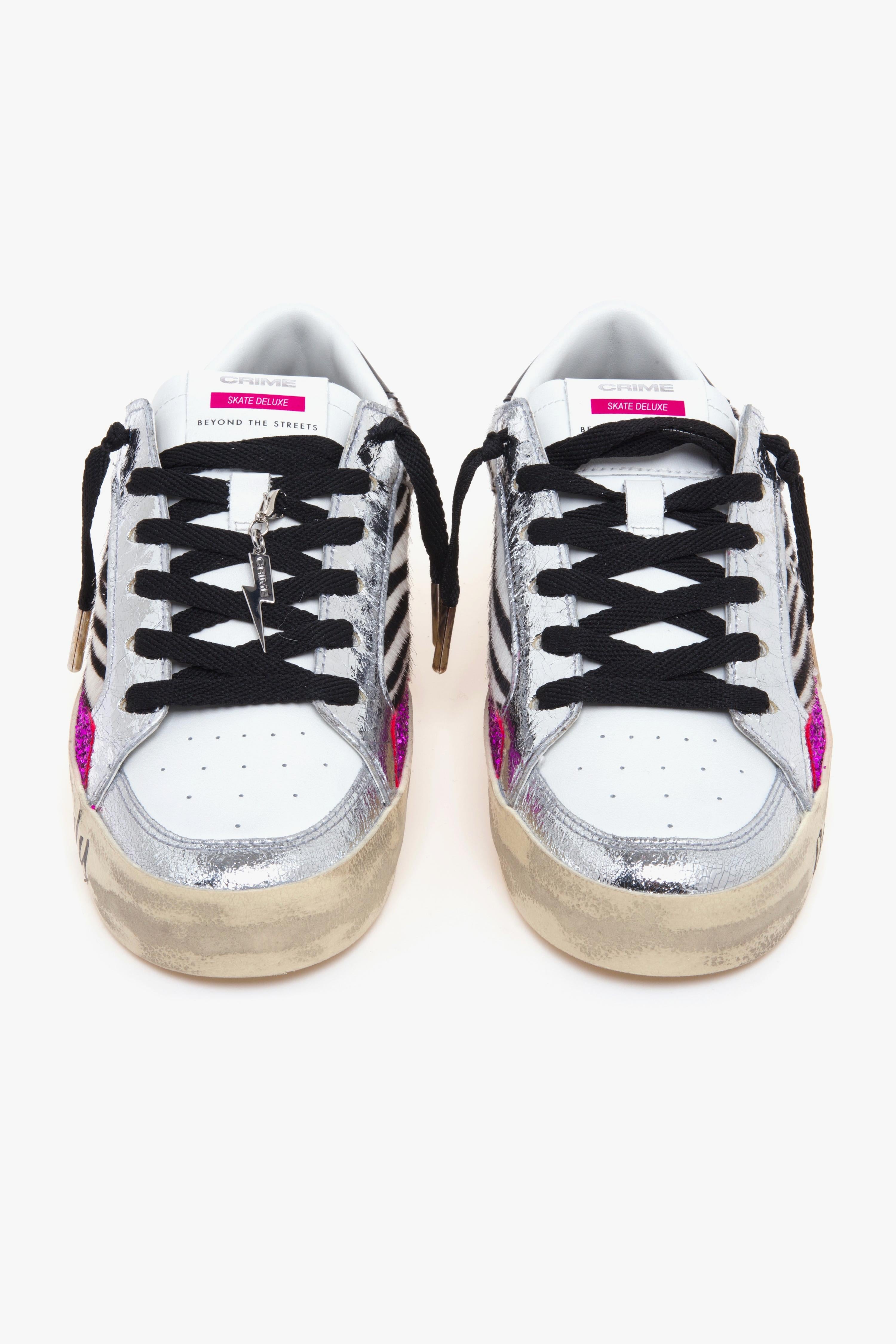Skate Deluxe di Crime London interpreta lo spirito sporty-chic con un mix materico dal forte carattere. La tomaia in cavallino zebrato è valorizzata da inserti in pelle bianca e argento, mentre i dettagli in glitter fuxia aggiungono punti luce mirati. La suola in gomma effetto vintage, con bordo nero dipinto a mano, sottolinea l’attitudine artigianale; sul fianco spicca la scritta “One night only” realizzata a mano, per un tocco esclusivo. Interno curato con fodera in pelle e tessuto e sottopiede estraibile in pelle, pensato per accompagnare la routine quotidiana con comfort e praticità.Caratteristiche principali: # Modello donna Crime London “Skate Deluxe”.# Look sporty-chic con richiami basket rétro.# Tomaia in cavallino zebrato con inserti in pelle bianca e argento.# Dettagli in glitter fuxia.# Suola in gomma effetto vintage con profilo nero dipinto a mano.# Fodera in pelle e tessuto.# Sottopiede estraibile in pelle.# Versatile e confortevole per tutti i giorni.