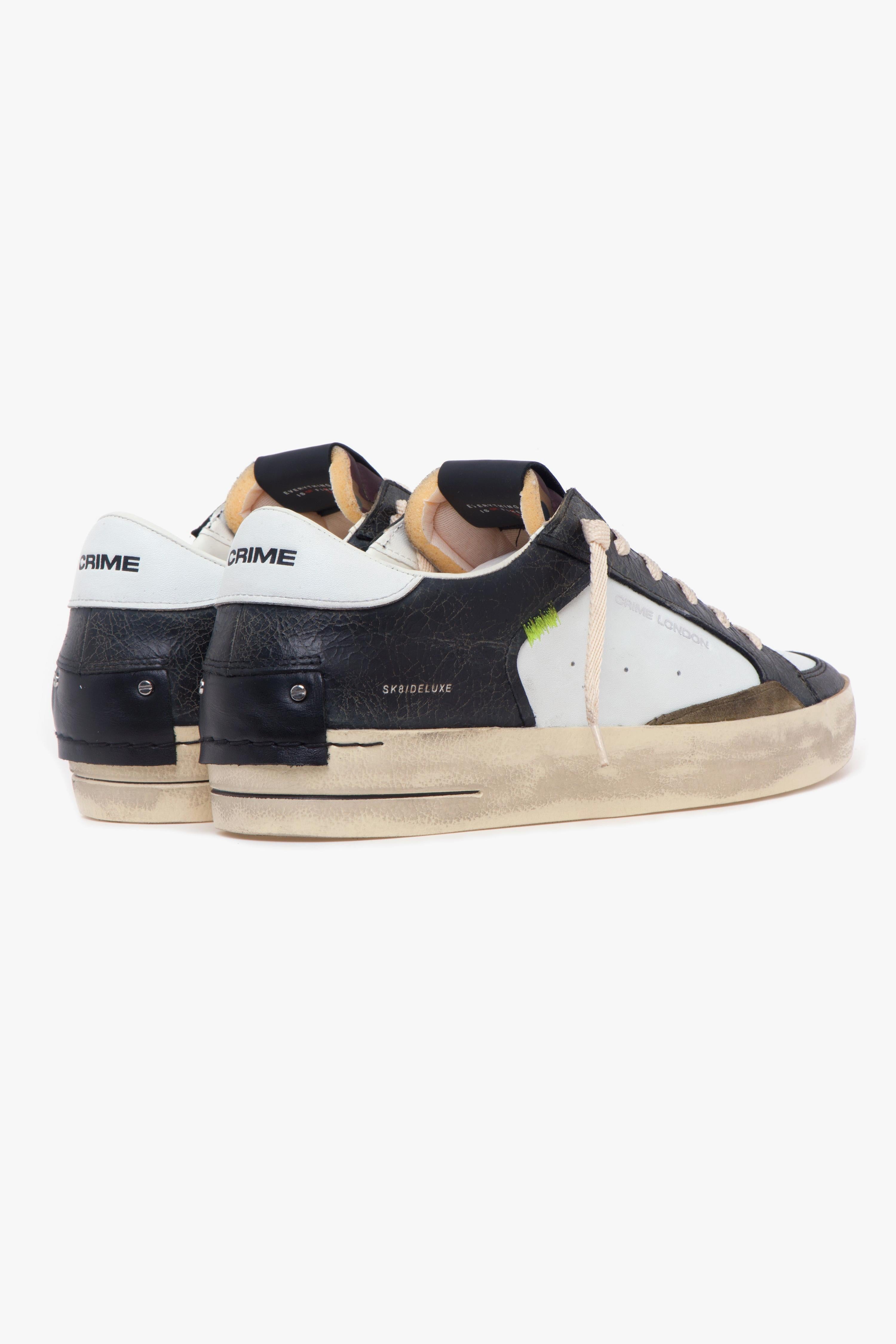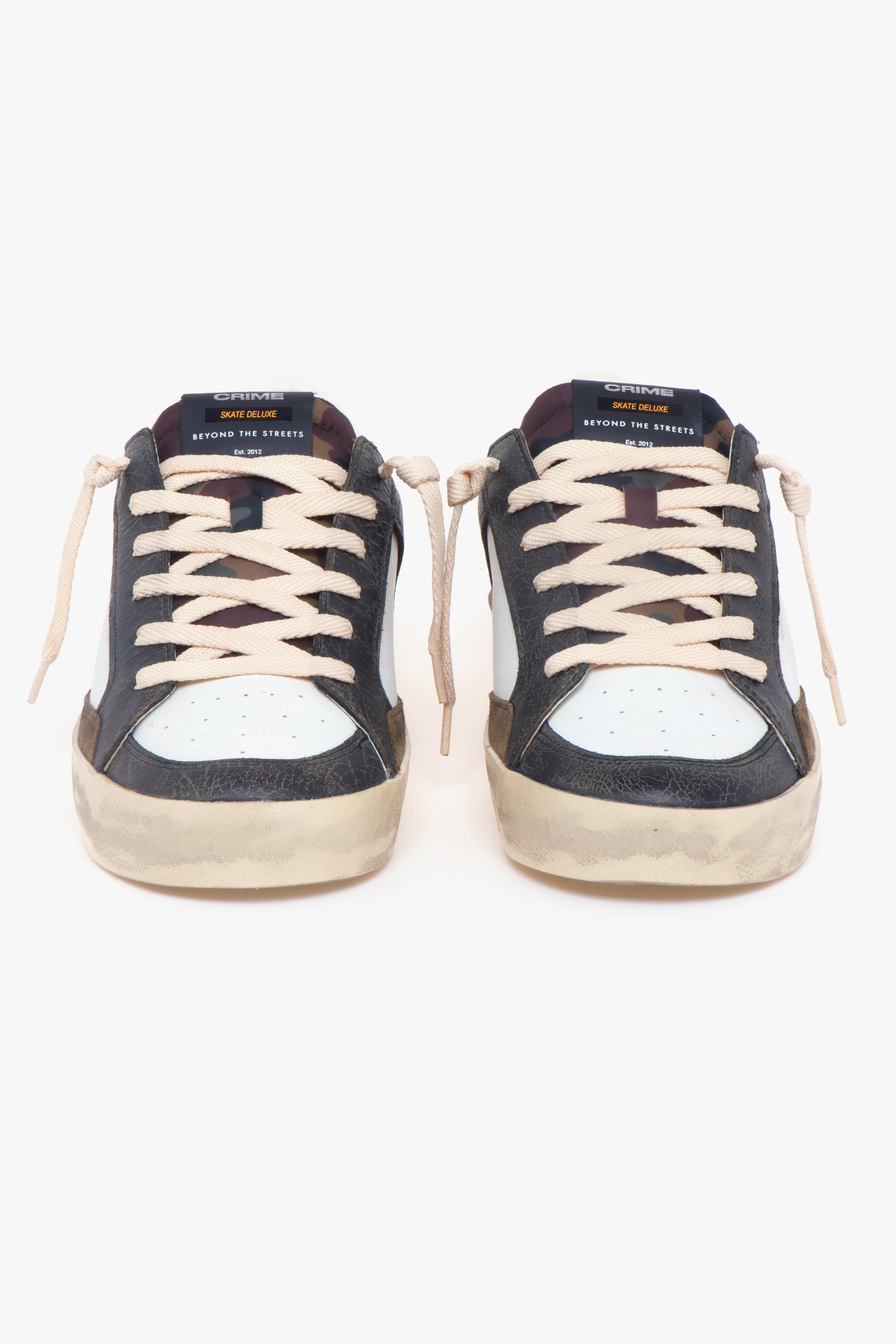 Skate Deluxe di Crime London interpreta lo spirito sporty-chic con un richiamo alle basketball shoes d’archivio. La tomaia in pelle bianca dialoga con inserti in pelle cracklè, che donano un equilibrato effetto used senza rinunciare a pulizia e carattere. La suola a cassetta in gomma, rifinita con profilo nero dipinto a mano, enfatizza il look vintage, mentre il battistrada color militare assicura aderenza su base urbana. All’interno, fodera in pelle e tessuto e sottopiede estraibile in pelle completano una calzata pratica e confortevole, pensata per accompagnare la giornata dal tempo libero agli spostamenti in città. La linguetta in tessuto con stampa camouflage chiude il design con un tocco grafico discreto.Caratteristiche principali: # Modello uomo Crime London “Skate Deluxe”.# Look sporty-chic ispirato al basket rétro.# Tomaia in pelle bianca con inserti in pelle cracklè (effetto used).# Linguetta in tessuto con stampa camouflage.# Suola a cassetta in gomma effetto vintage con profilo nero dipinto a mano.# Battistrada color militare per maggiore grip.# Fodera in pelle e tessuto.# Sottopiede estraibile in pelle.# Versatile e confortevole per l’uso quotidiano.