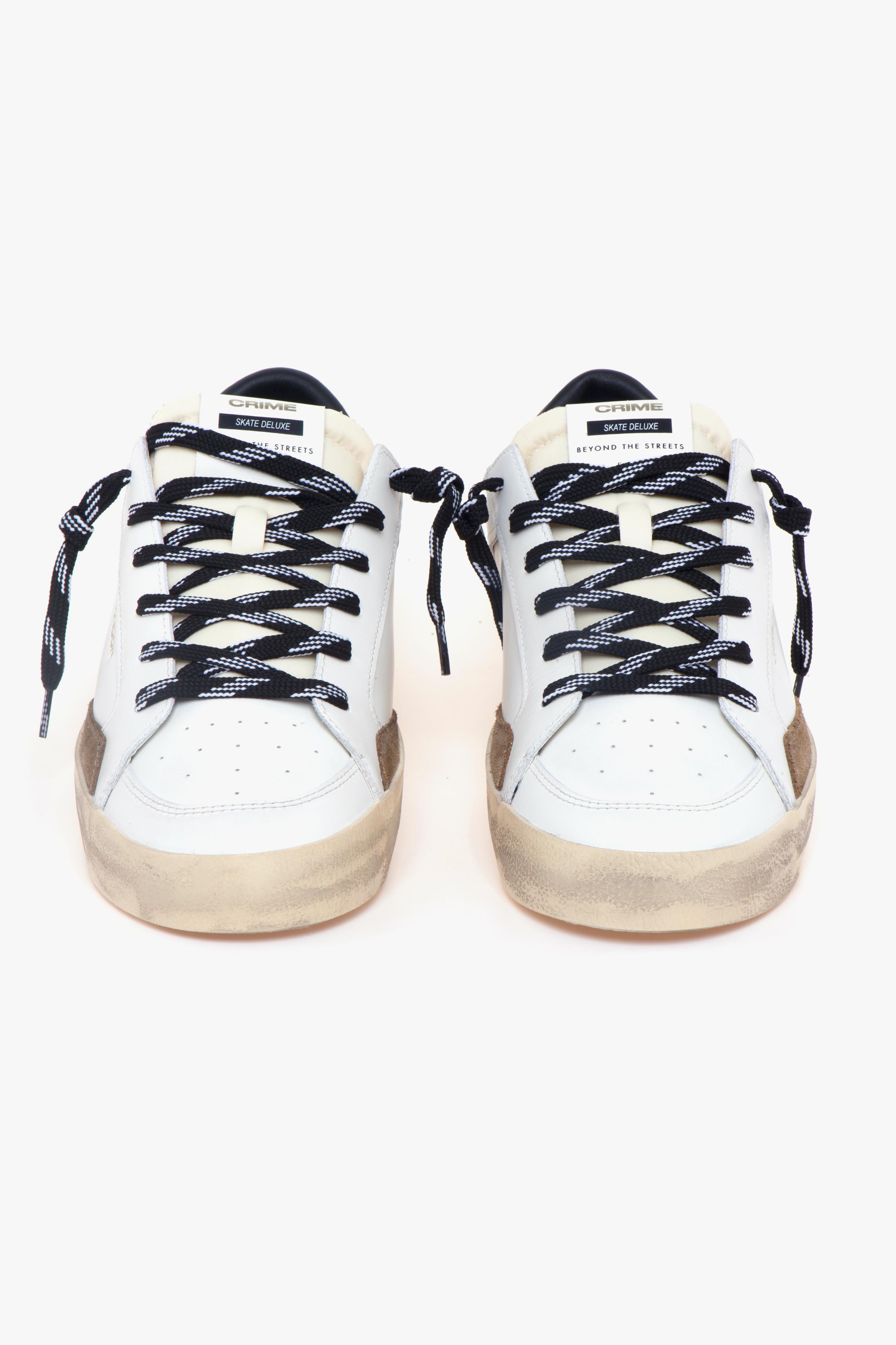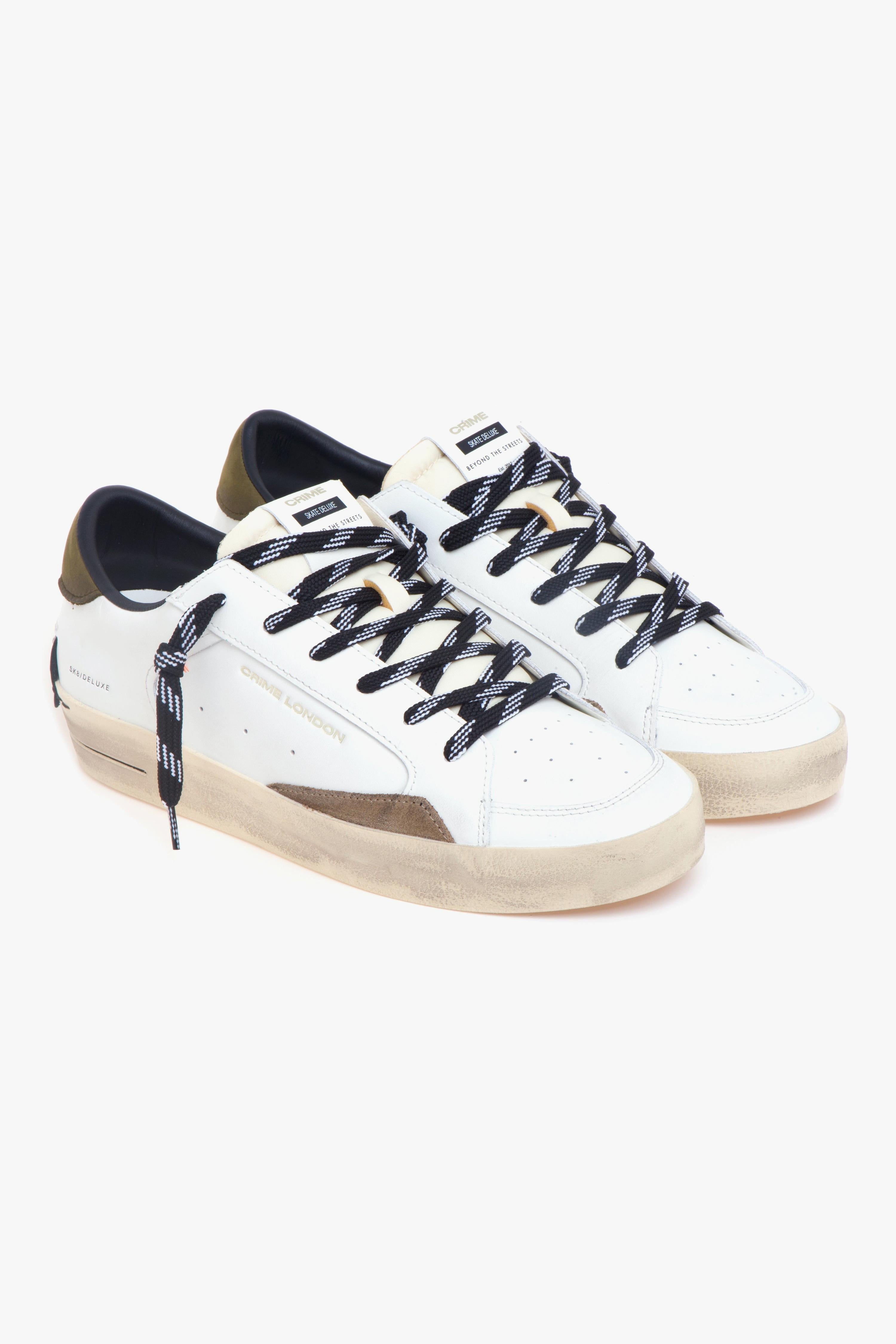 Skate Deluxe di Crime London interpreta lo spirito sporty-chic con richiami alle basketball shoes d’archivio. La tomaia in pelle bianca è arricchita con inserti in camoscio verde militare e un talloncino in pelle a effetto vintage, per un ritmo cromatico equilibrato e di carattere.La suola in gomma, rifinita dal profilo nero dipinto a mano, accentua il look heritage.L'interno è curato con fodera in pelle/tessuto e sottopiede estraibile in pelle per un comfort pratico nel quotidiano. Caratteristiche principali: # Tomaia in pelle bianca con inserti in camoscio verde militare.# Talloncino in pelle effetto vintage.# Linguetta in tessuto beige. # Suola a cassetta in gomma effetto vintage.# Profilo della suola nero dipinto a mano.# Battistrada color miele.# Fodera in pelle e tessuto.# Sottopiede estraibile in pelle.# Calzata confortevole e adatta all’uso quotidiano.