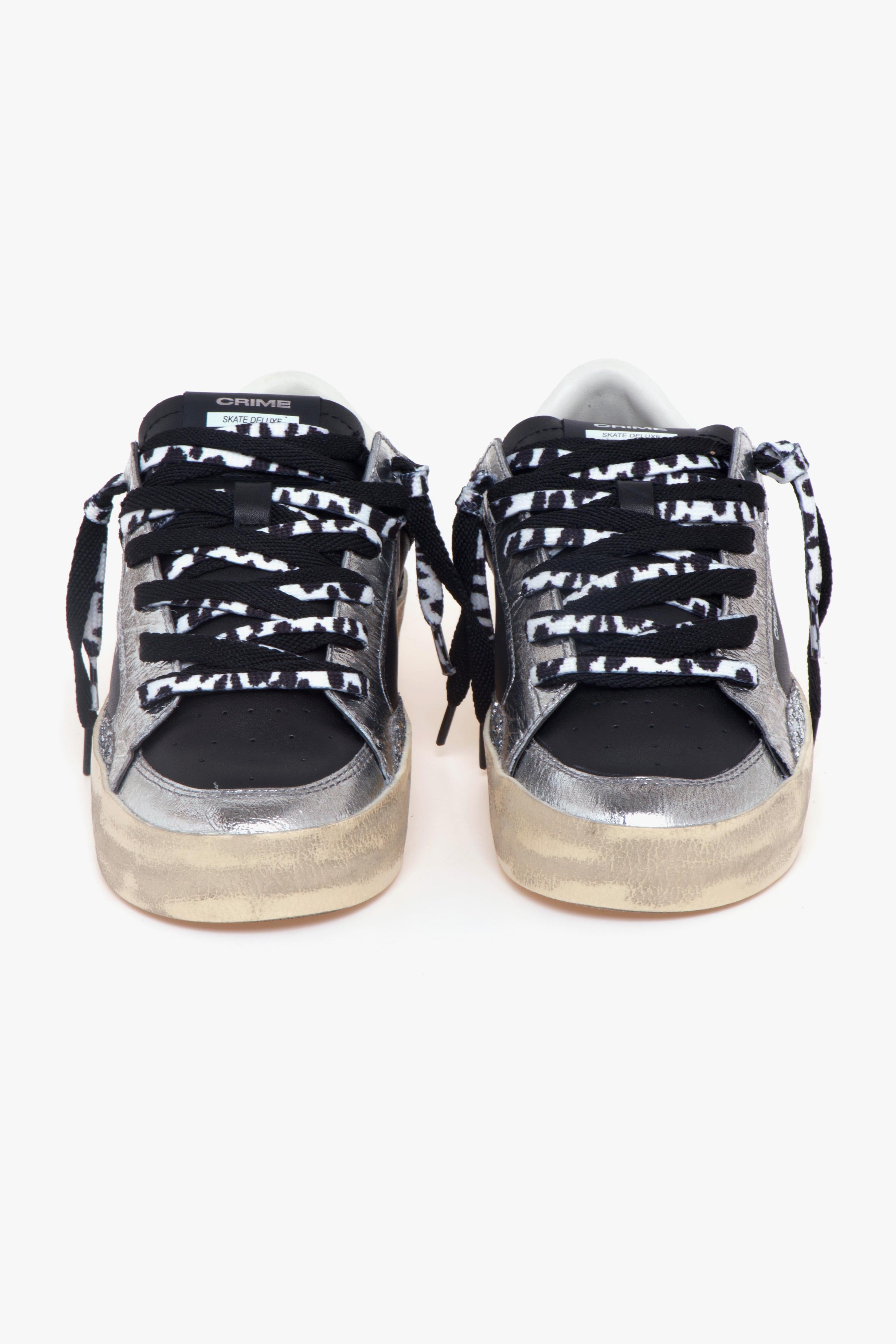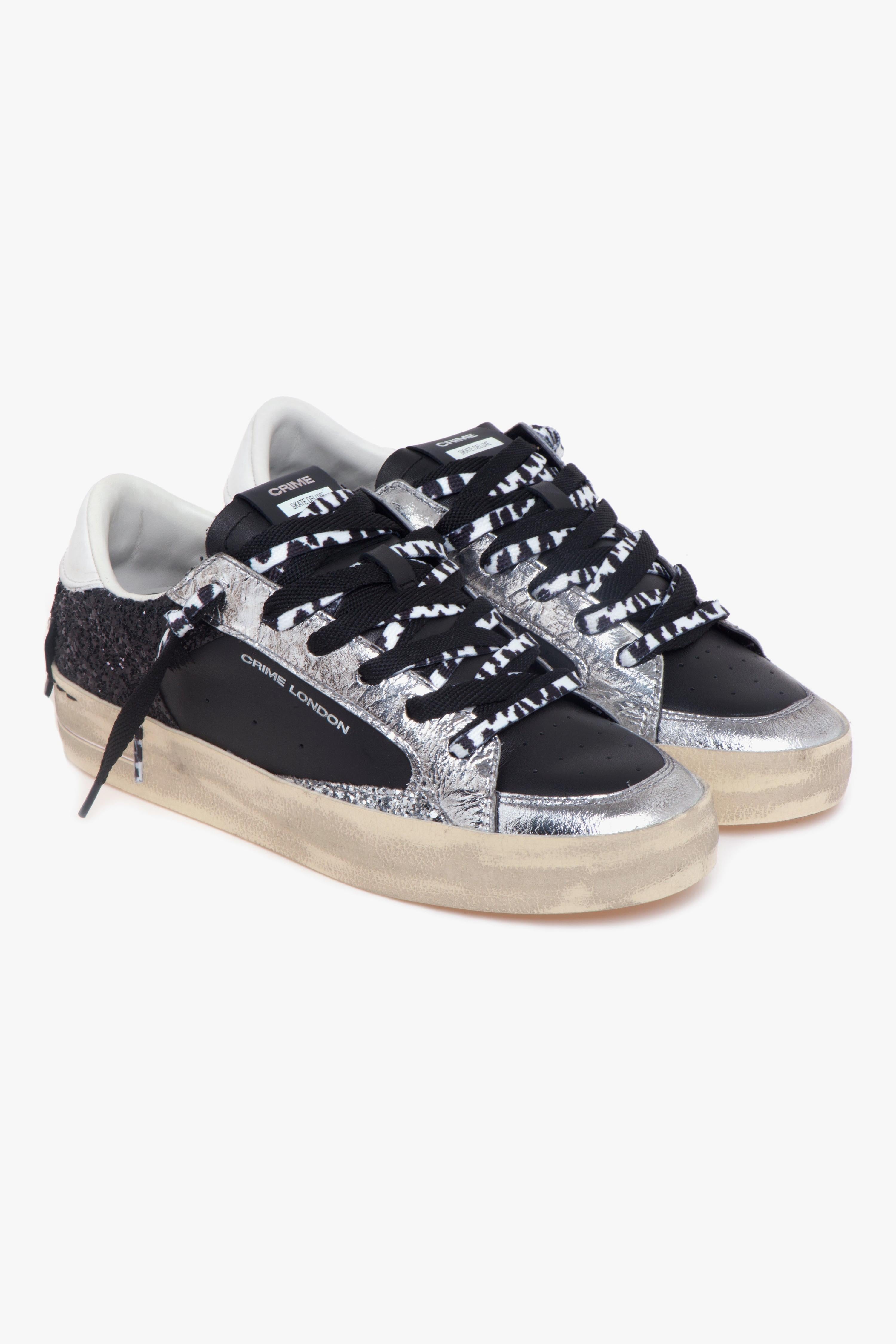 Skate Deluxe di Crime London declina il mood sporty-chic con riferimenti alle basketball shoes d’archivio. La tomaia in pelle nera è animata da inserti in glitter tono su tono e tocchi metallizzati argento, per una luminosità misurata. La suola in gomma effetto vintage è rifinita da un profilo argento dipinto a mano, mentre il battistrada color miele garantisce trazione e durata nell’uso quotidiano. I lacci in tessuto maculato black-white aggiungono un accento grafico deciso. All’interno, fodera in pelle e tessuto e sottopiede estraibile in pelle assicurano comfort e praticità per tutta la giornata.Caratteristiche principali: # Modello donna Crime London “Skate Deluxe”.# Look sporty-chic con richiami basket rétro.# Tomaia in pelle nera con inserti in glitter e dettagli metallizzati.# Lacci maculati black-white.# Suola in gomma effetto vintage con profilo argento dipinto a mano.# Battistrada color miele.# Fodera in pelle e tessuto.# Sottopiede estraibile in pelle.# Versatile e confortevole per l’uso quotidiano