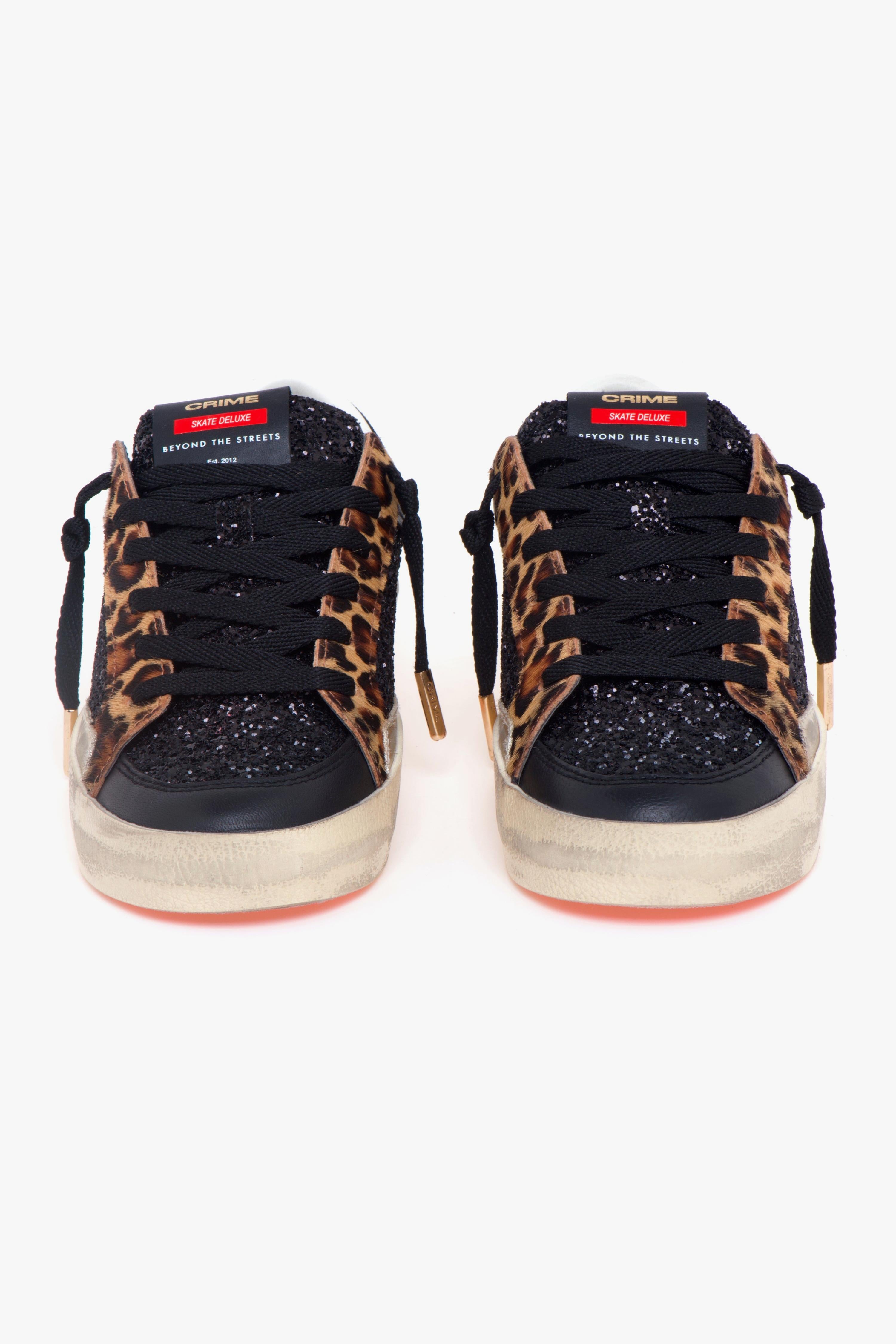 Skate Deluxe di Crime London declina il mood sporty-chic con richiami alle basketball shoes d’archivio. La tomaia in pelle nera è movimentata da inserti in glitter tono su tono e da dettagli in cavallino maculato che aggiungono texture e personalità. La suola in gomma effetto vintage, rifinita da un profilo nero dipinto a mano, evidenzia il carattere artigianale; il battistrada rosso introduce un tocco cromatico deciso. All’interno, fodera in pelle e tessuto e sottopiede estraibile in pelle assicurano comfort e praticità per l’uso quotidiano.Caratteristiche principali: # Modello donna Crime London “Skate Deluxe”.# Look sporty-chic con richiami basket rétro.# Tomaia in pelle nera con inserti in glitter tono su tono.# Dettagli in cavallino maculato.# Suola in gomma effetto vintage con profilo nero dipinto a mano.# Battistrada rosso.# Fodera in pelle e tessuto.# Sottopiede estraibile in pelle.# Versatile e confortevole per tutti i giorni.