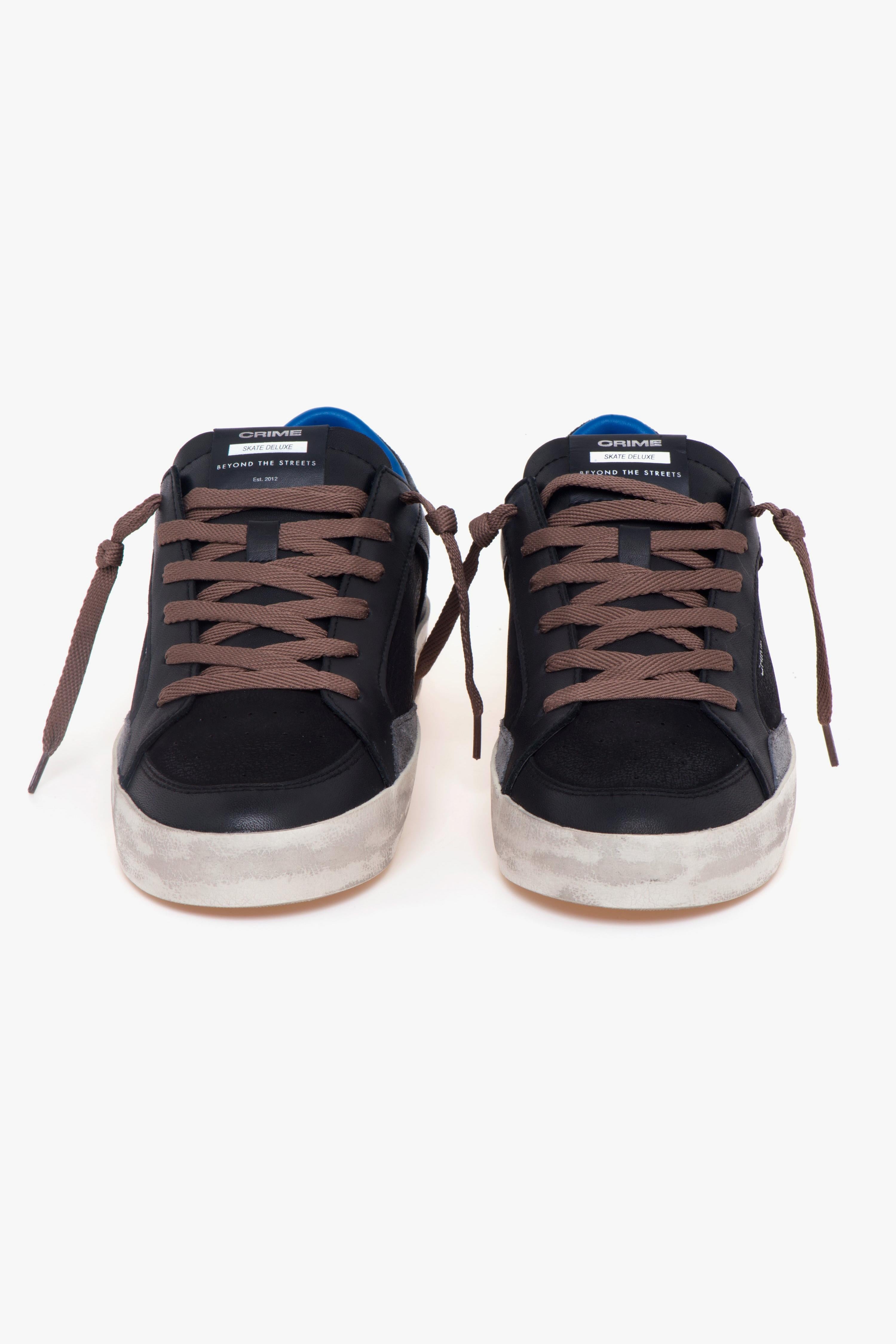 Skate Deluxe di Crime London interpreta lo spirito sporty-chic con un richiamo alle basketball shoes d’archivio.La tomaia in pelle nera alterna due differenti texture per un look più ricercato e moderno. La suola a cassetta in gomma, rifinita con profilo azzurro dipinto a mano, enfatizza il look vintage, mentre il battistrada color miele assicura aderenza sul terreno.All’interno, fodera in pelle e tessuto e sottopiede estraibile in pelle completano una calzata pratica e confortevole, pensata per accompagnare la giornata dal tempo libero agli spostamenti in città.Caratteristiche principali: # Modello uomo Crime London “Skate Deluxe”.# Look sporty-chic ispirato al basket rétro.# Tomaia in pelle nera. # Linguetta in tessuto bordeaux scuro. # Suola a cassetta in gomma effetto vintage con profilo bluette dipinto a mano che riprende il colore della fodera. # Battistrada color miele per maggiore grip.# Fodera in pelle e tessuto.# Sottopiede estraibile in pelle.# Versatile e confortevole per l’uso quotidiano.