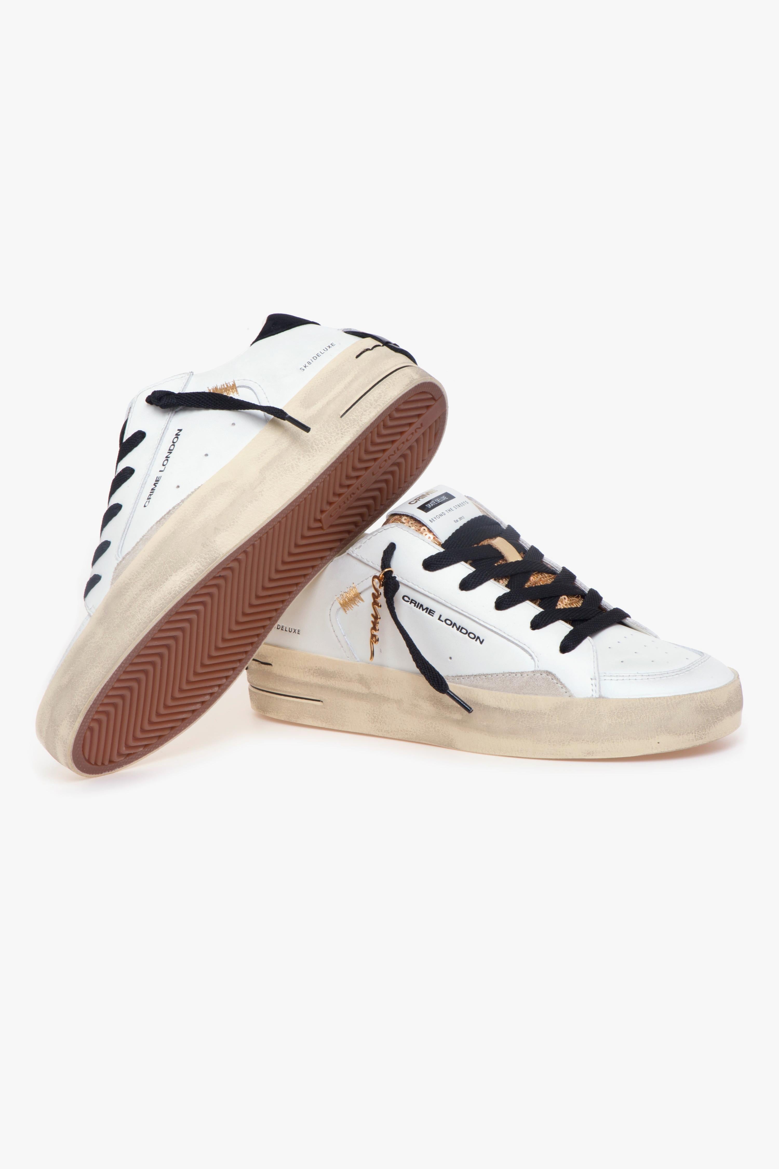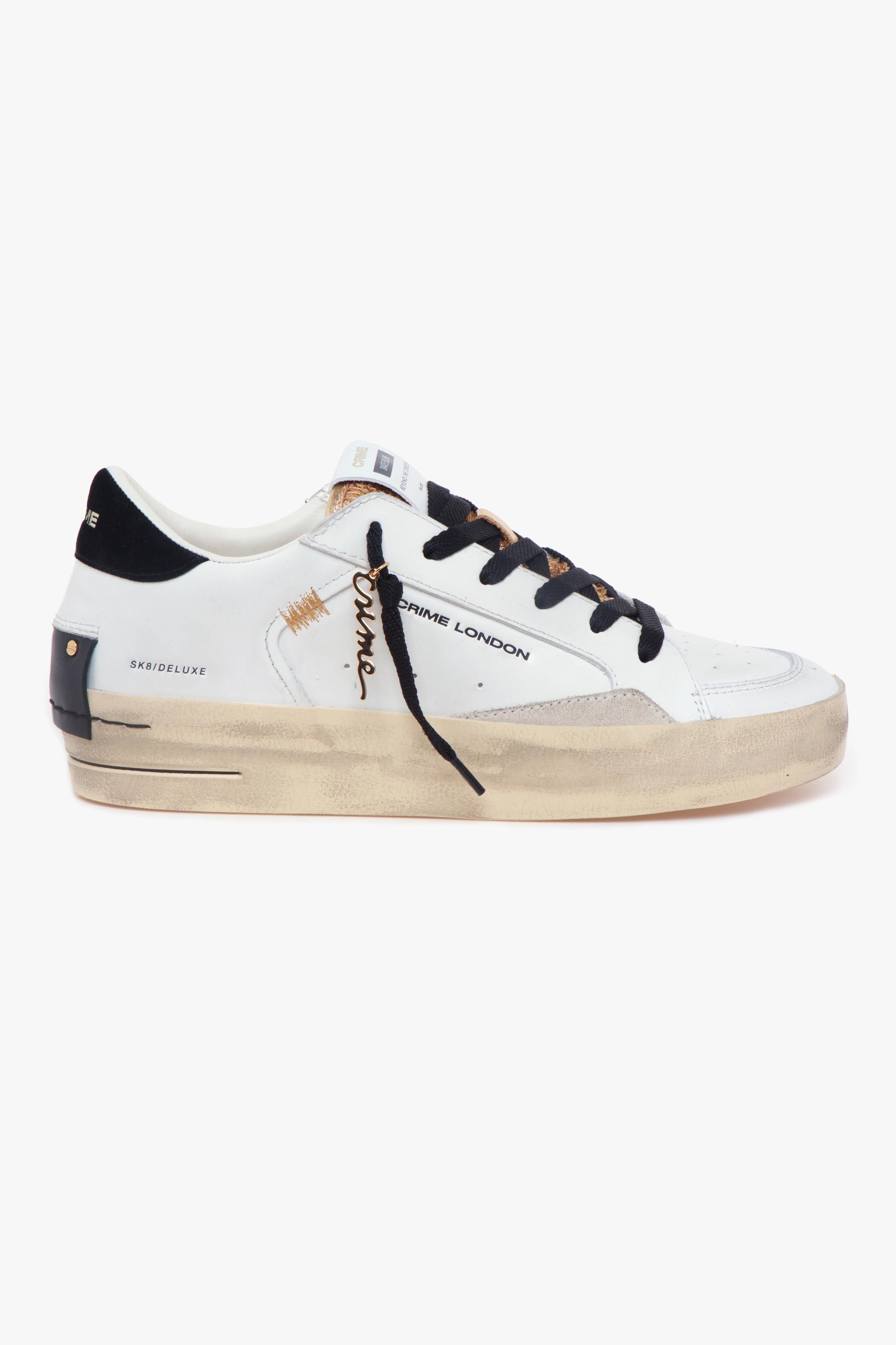 SK8 Deluxe Wedge di Crime London conserva il design pulito della SK8 Deluxe tradizionale e introduce un accenno di altezza extra: la nuova suola, insieme al sottopiede interno, offre un rialzo complessivo di circa 5 mm sul tallone senza alterare la calzata. La tomaia, interamente in pelle bianca, è valorizzata dal talloncino in camoscio nero coordinato ai lacci e da una linguetta con paillettes dorate che aggiunge un punto luce misurato. Interno curato con fodera in pelle e tessuto e sottopiede estraibile in pelle; la suola sfoggia il caratteristico effetto vintage del brand per un look daily-chic.Caratteristiche principali: # Modello donna Crime London “SK8 Deluxe Wedge”.# Look sporty-chic con richiami basket rétro.# Tomaia in pelle bianca.# Talloncino in camoscio nero e lacci neri coordinati.# Linguetta con paillettes dorate.# Suola a cassetta con effetto vintage.# Rialzo integrato nel tallone (~5 mm tra suola e sottopiede).# Fodera in pelle e tessuto.# Sottopiede estraibile in pelle.