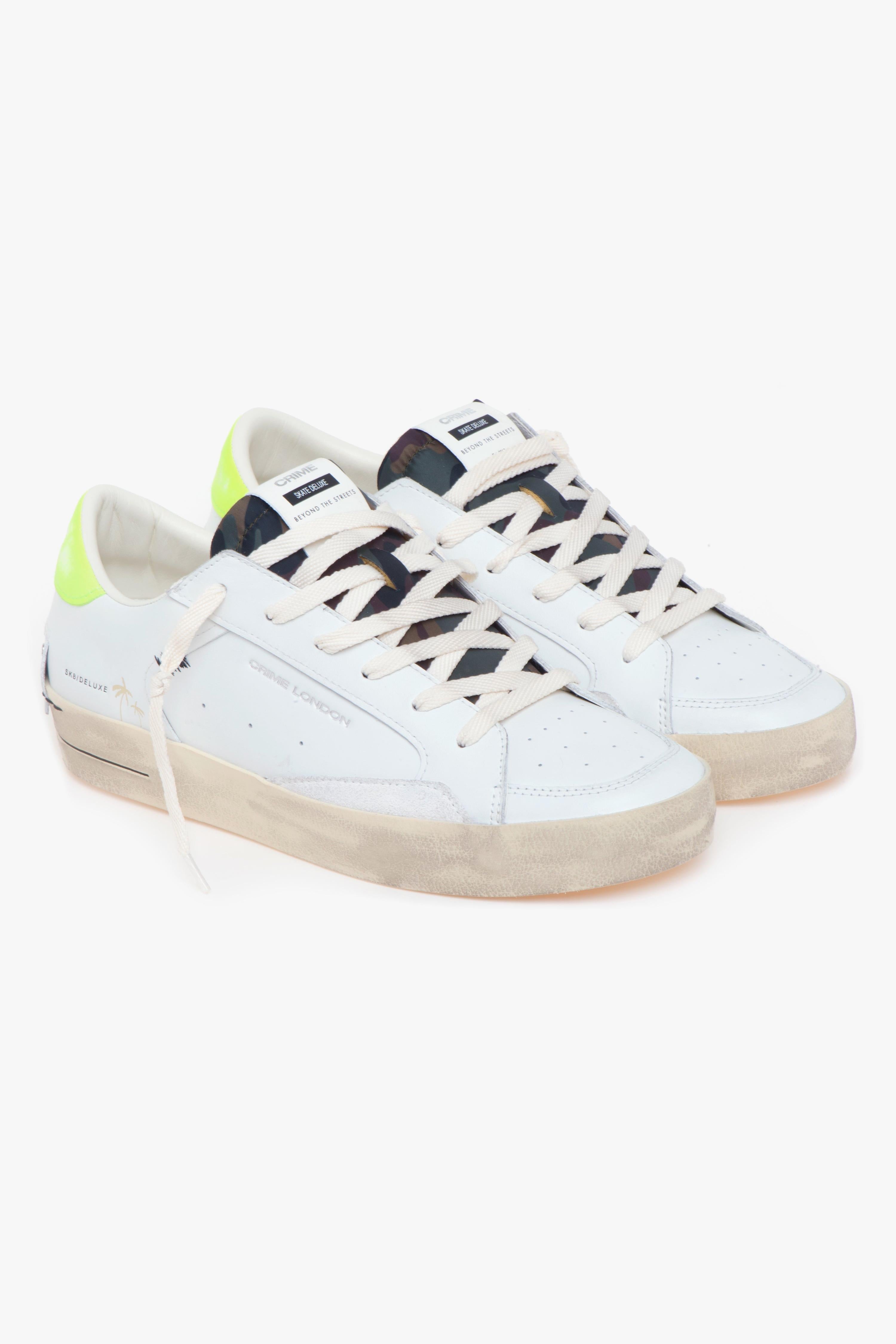 Versatile e confortevole, Skate Deluxe di Crime London è una sneaker in pelle dal look sporty-chic ispirata alle scarpe da basket del passato, ideale per l'uso di tutti i giorni.Si distingue per il talloncino giallo fluo e la linguetta in tessuto camuflage che gli donano uno stile inconfondibile senza eccedere in dettagli troppo vistosi. Completano il look della scarpa la suola a cassetta in gomma effetto vintage con profilo nero dipinto a mano e battistrada miele.Su linguetta e talloncino, infine, sono impressi il logo del brand ed il nome del modello.# Tomaia in pelle e camoscio. # Fodera in tessuto. # Sottopiede estraibile in pelle.# Suola in gomma.