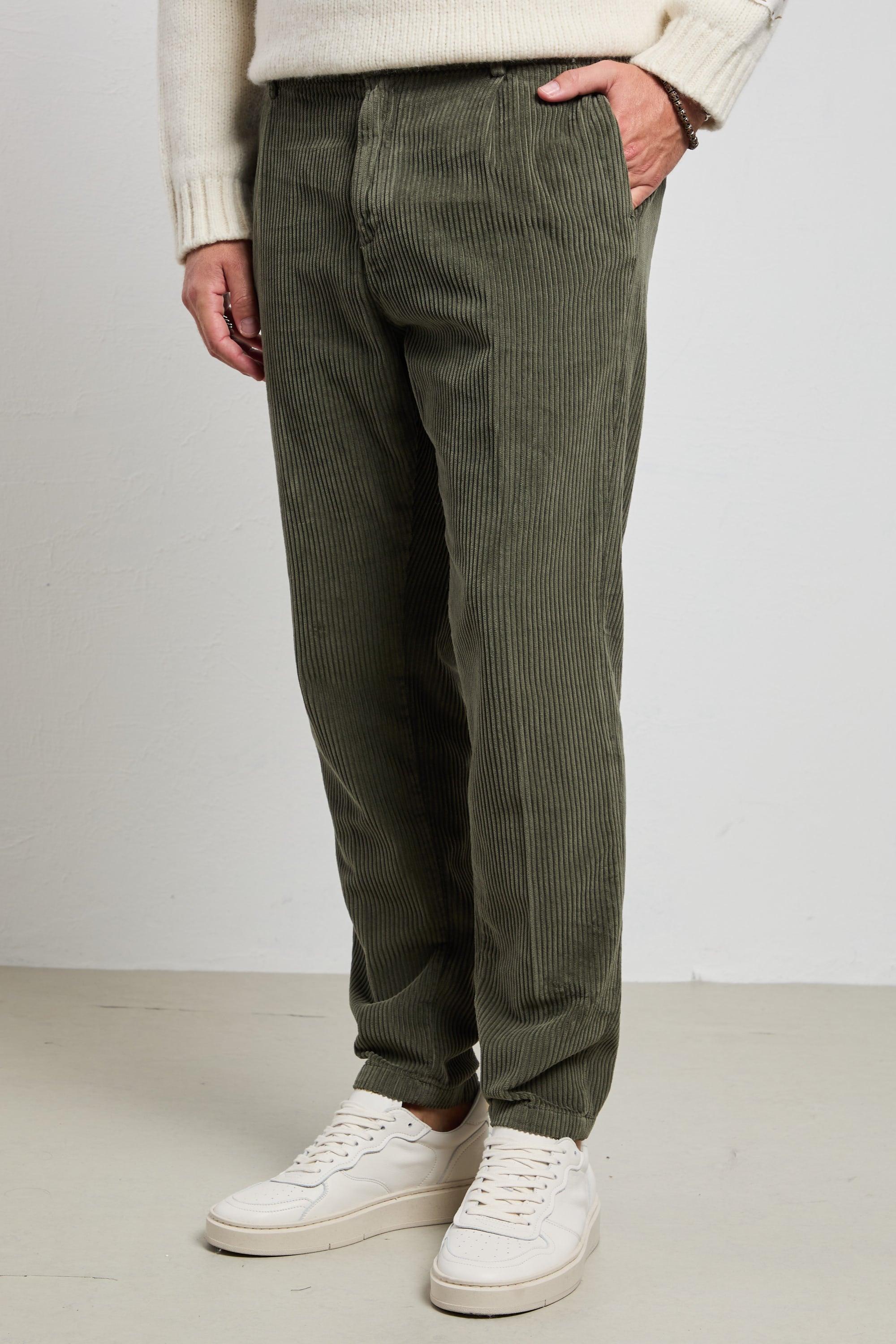 Questo pantalone in velluto a coste dal verde aperto e luminoso è un capo dallo stile sofisticato e casual al tempo stesso. Con una vestibilità tapered ma comoda, è perfetto per chi cerca un look moderno e versatile. Il verde chiaro si abbina facilmente con colori neutri come il bianco, il beige e il grigio. Provalo con una camicia in denim o un giubbotto in pelle per un look informale ma ricercato, oppure con un pullover in cashmere e mocassini per un outfit più elegante. Vestibilità: tapered fit, regular Vita: elastica con coulisse a scomparsa Composizione: 100% cotone Tasche: laterali oblique, posteriori a doppio filetto Fondo: 16 cm Taglia indossata: 48 Chiusura: zip + bottone, con coulisse in vita Colore: verde oliva Logo: discreto, ricamato sul fianco destro Made in Italy