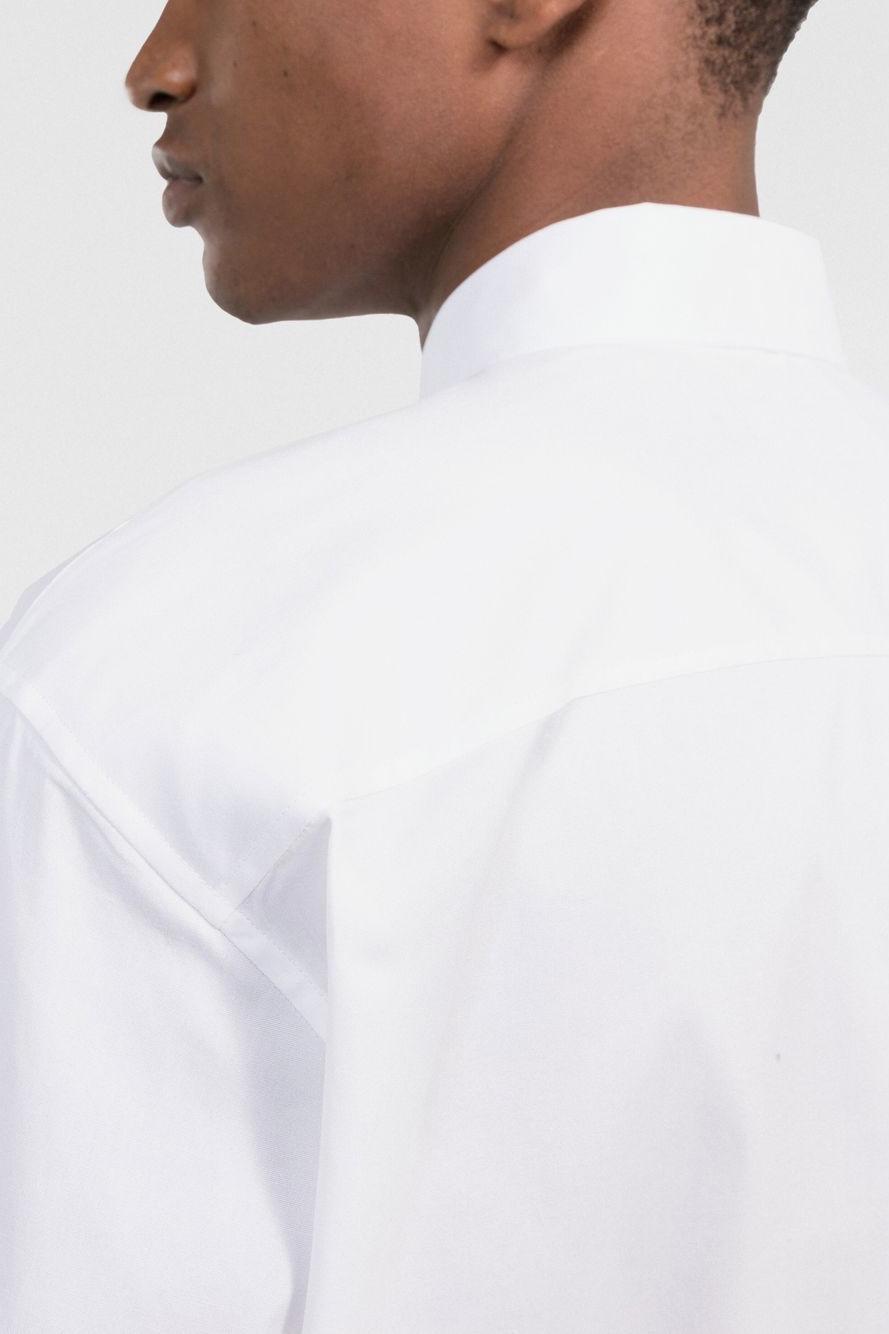 Proposta in bianco, presenta una stampa con logo sul davanti che dona un tocco grafico d’impatto. Il colletto classico, la chiusura frontale con bottoni, le maniche lunghe e l’orlo curvo completano un design versatile e raffinato, perfetto per look casual-chic o outfit più ricercati.