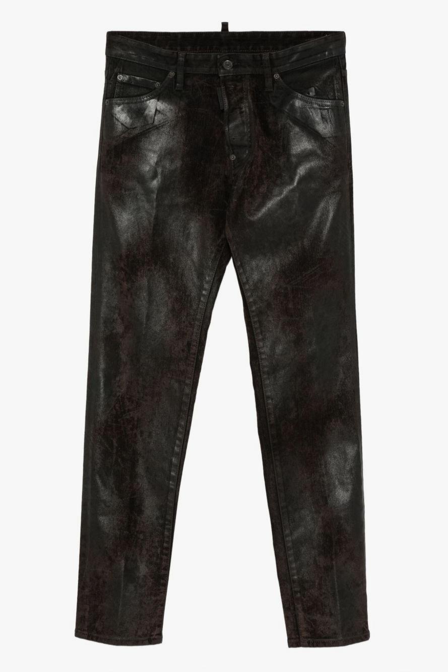 Proposti nella tonalità marrone, presentano un marcato effetto metallizzato che dona al capo un carattere unico e moderno. Il design include la classica costruzione a cinque tasche, la patta con bottoni e una silhouette che valorizza lo stile deciso del modello.