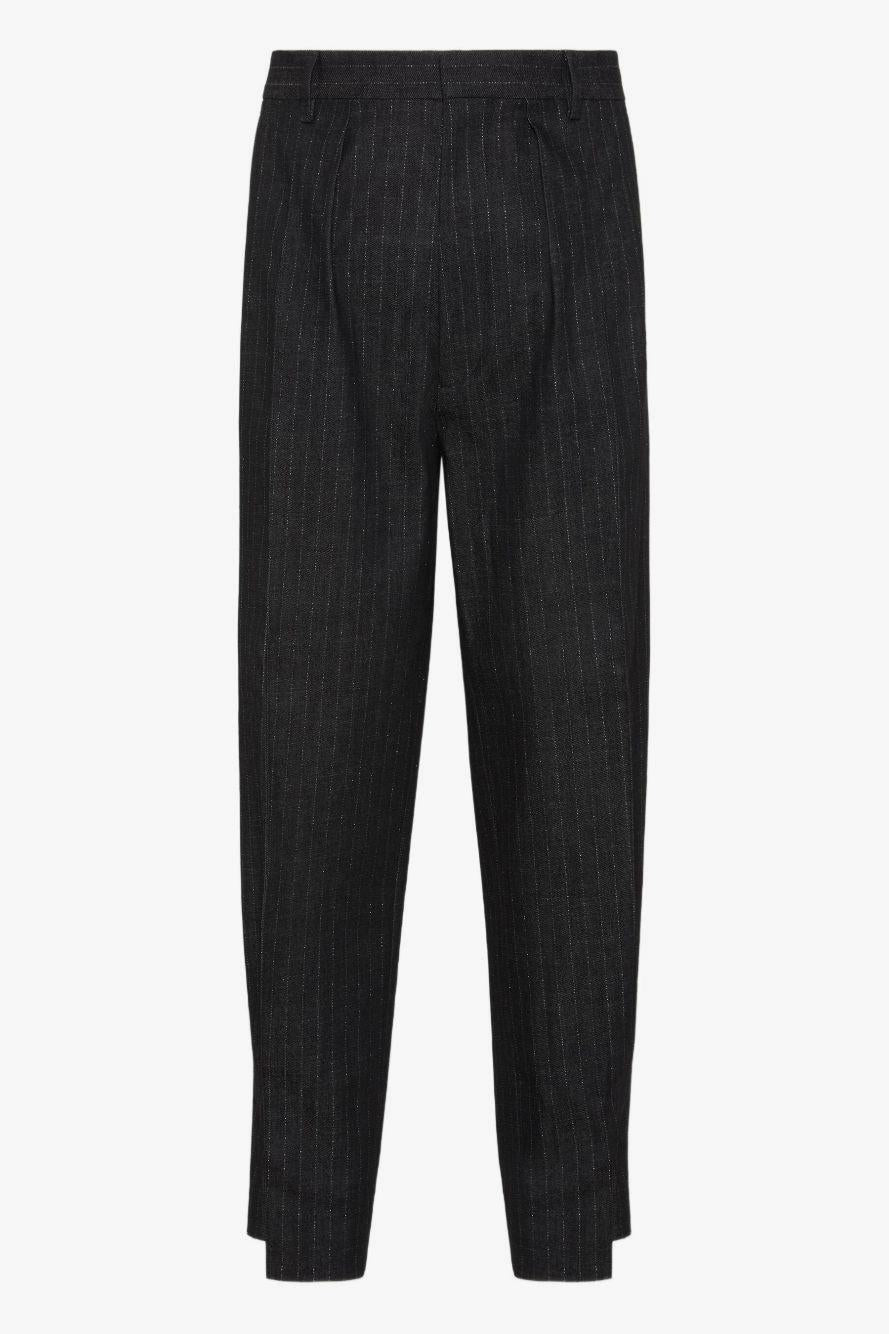 Proposti nel colore nero, presentano un raffinato motivo gessato che slancia la silhouette e dona un tocco classico ma moderno. La chiusura frontale nascosta, i passanti per cintura e le due tasche a filetto posteriori con bottone completano un design pulito e versatile, perfetto per look formali o outfit ricercati dal taglio contemporaneo.