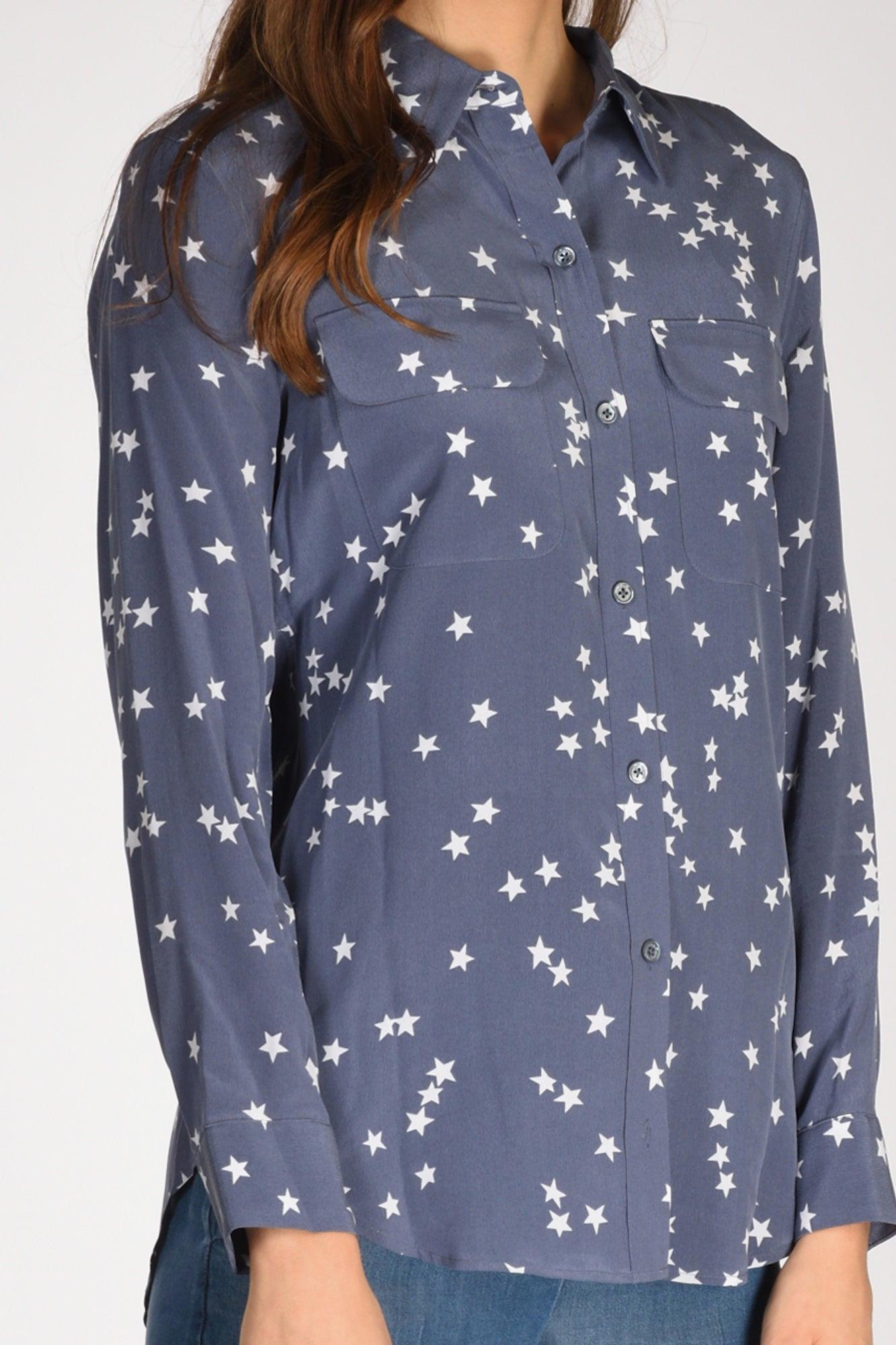 Camicia In Seta Stampa Stelle, Tasche Frontali Applicate Chiuse Da Patta, Chiusura Bottoni A Vista, Manica Lunga Con Polso Rotondo Chiuso Da Un Bottone, Sfondo Piega Centrale Posteriore, Fondo Stondato, Made In Cina, Composizione 100 Seta