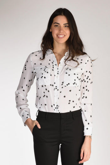 La Camicia Equipment PE24 è un capolavoro di stile e raffinatezza, riflettendo un'estetica contemporanea senza tempo. Confezionata in pura seta dall'effetto opaco, questa camicia presenta una stampa a stelle che aggiunge un tocco di eleganza ludica. Le tasche frontali con patta sono un dettaglio pratico e stiloso, chiuse con cura da bottoni a vista che rimandano alla chiusura centrale della camicia. Ogni manica lunga si conclude con un polso rotondo sigillato da un singolo bottone, mentre la piega centrale sul retro esalta la cadenza del capo.
