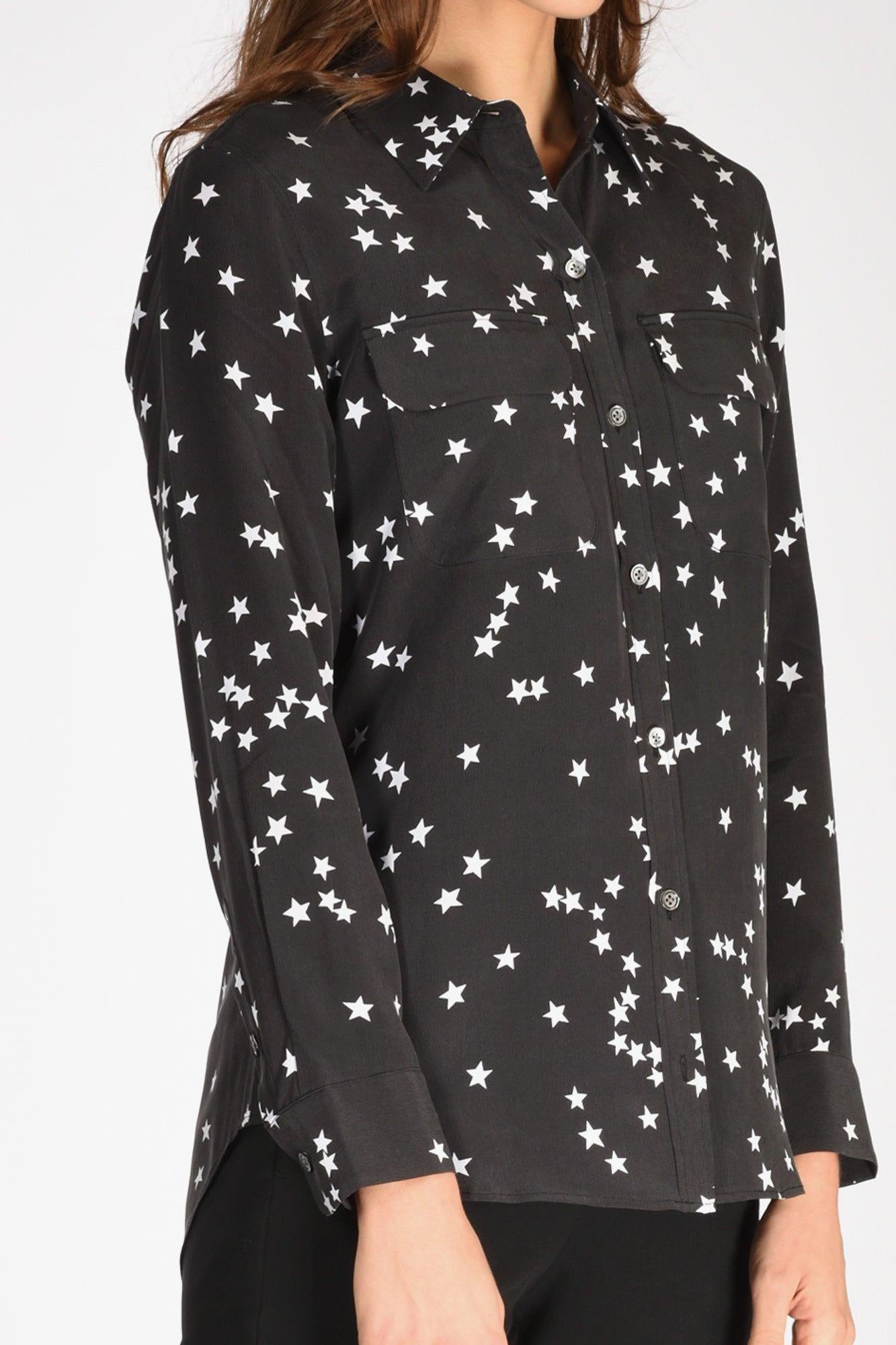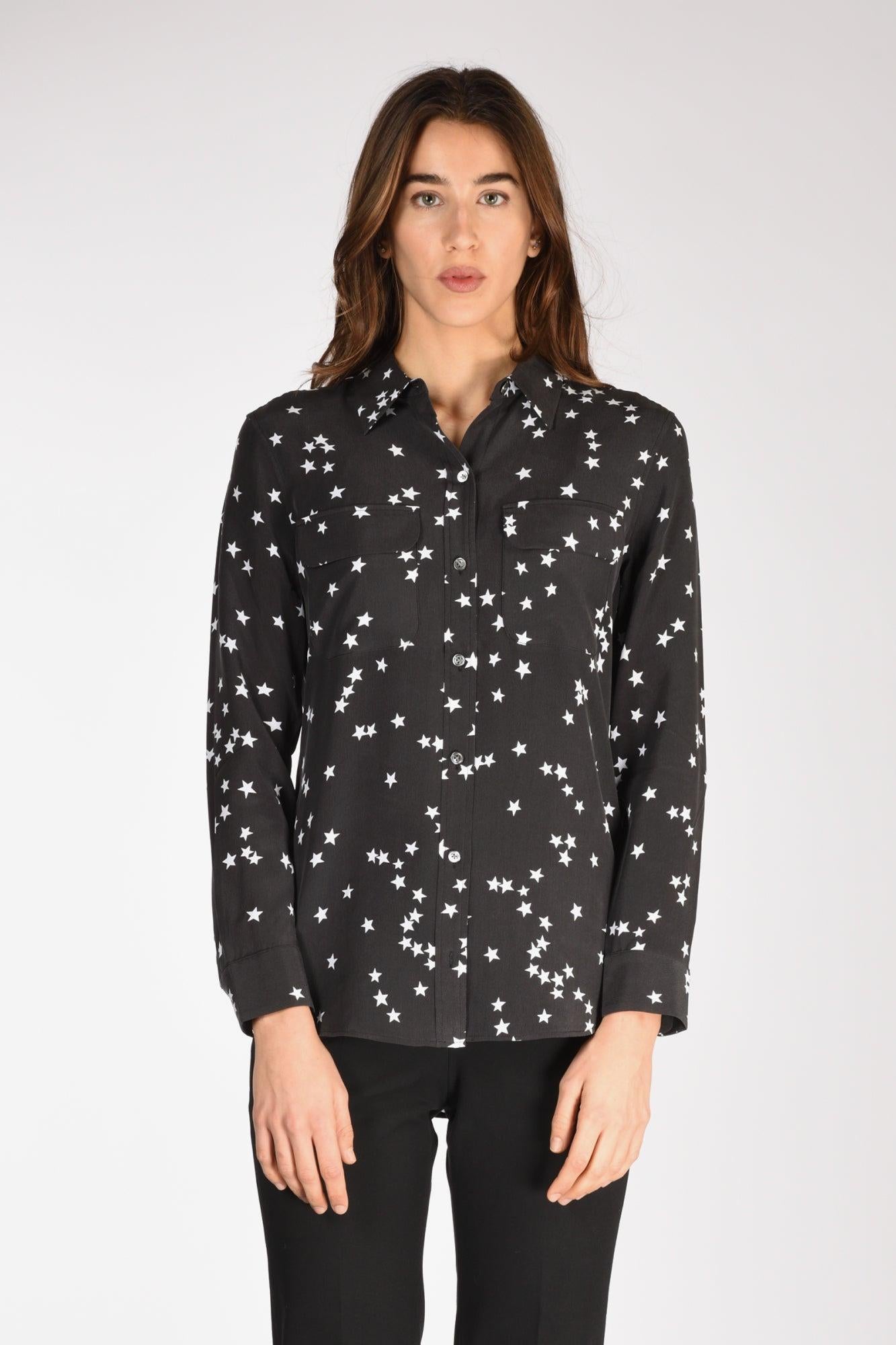 Camicia In Seta Stampa Stelle, Tasche Frontali Applicate Chiuse Da Patta, Chiusura Bottoni A Vista, Manica Lunga Con Polso Rotondo Chiuso Da Un Bottone, Sfondo Piega Centrale Posteriore, Fondo Stondato, Made In Cina, Composizione 100 Seta