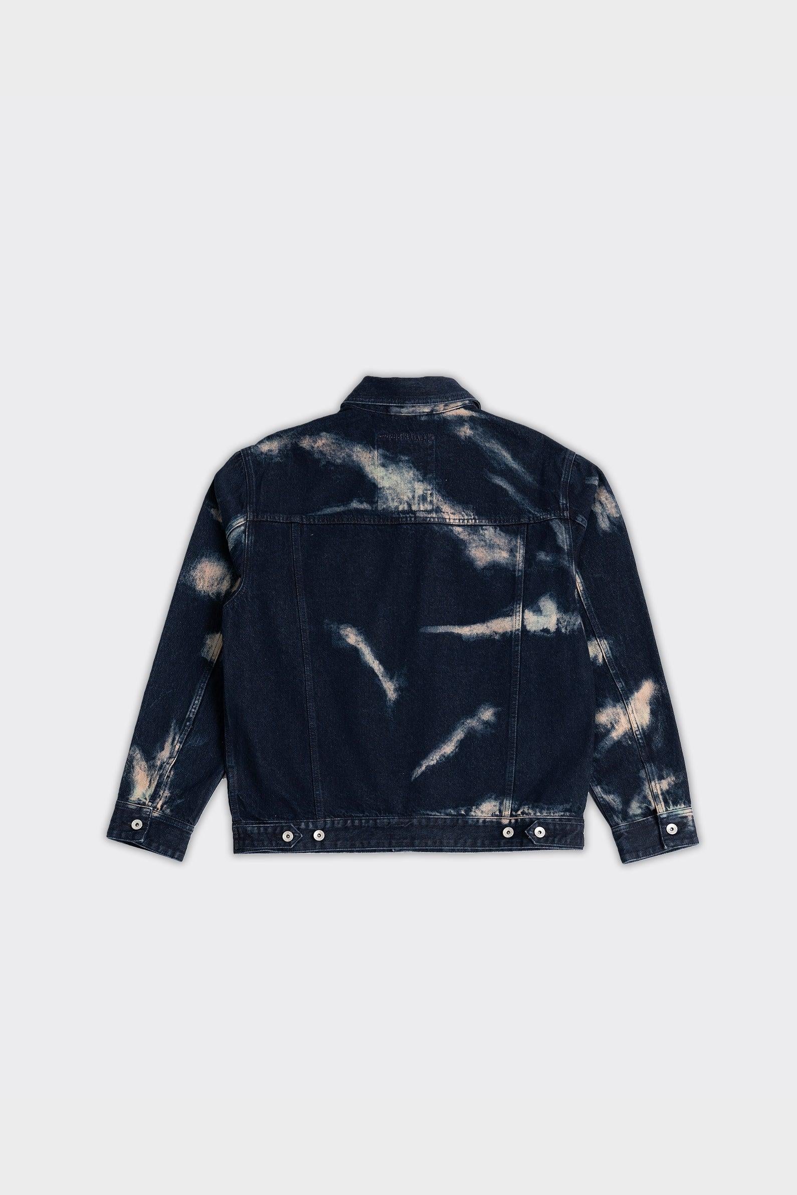 Giacca in denim indigo con effetto tie-dye. Due ricami a forma di gabbiano sui lati anteriori, bottoni metallici sul davanti e polsini.