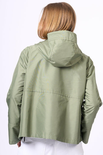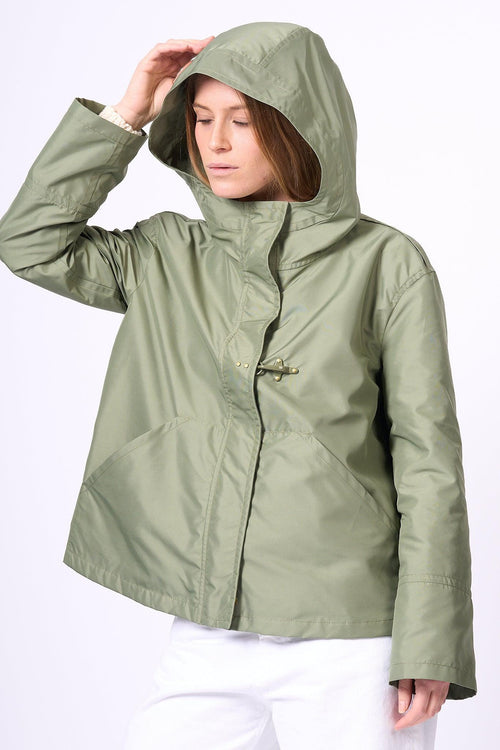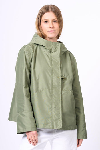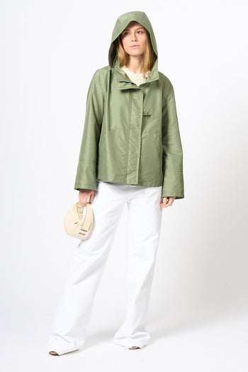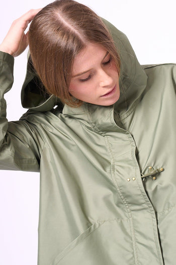 Il design valorizza la silhouette con la sua linea svasata ed è caratterizzato dalla tonalità raffinata del verde salvia, che aggiunge un tocco di eleganza naturale al vostro outfit. La praticità non viene meno, grazie alla chiusura con zip e bottoni a pressione su patta, che rende questo parka semplice da indossare e da regolare a seconda delle esigenze.