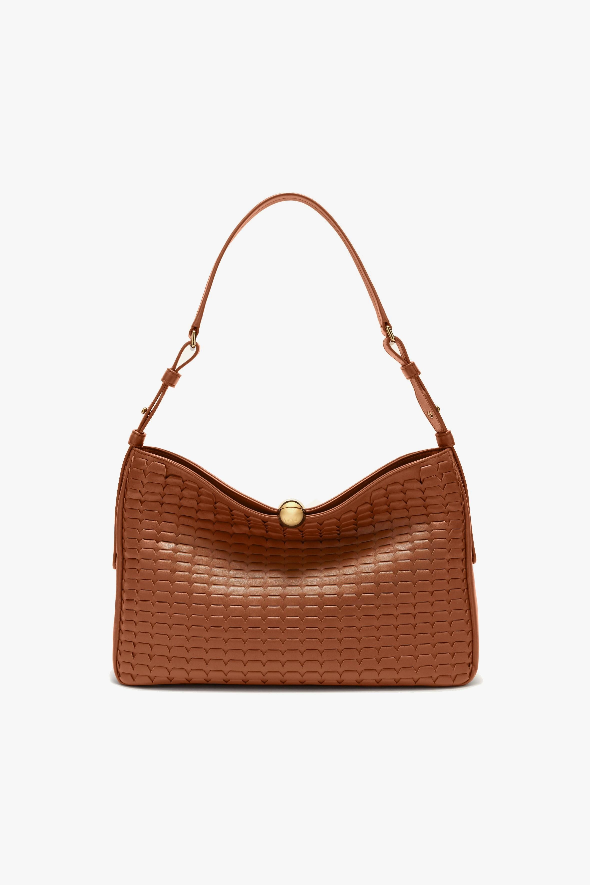 Borsa a spalla Furla Sfera in nappa soft con intagli effetto intreccio sulla parte frontale. Unico scomparto con chiusura a calamita grazie alla sfera dorata che caratterizza tutta la linea Sfera di Furla. All'interno, tasche di servizio di cui una con zip di maggiori dimensioni. # Fodera in tessuto e pelle. # Manico regolabile in lunghezza. # Dimensioni: 37 x 25 x 8 cm.