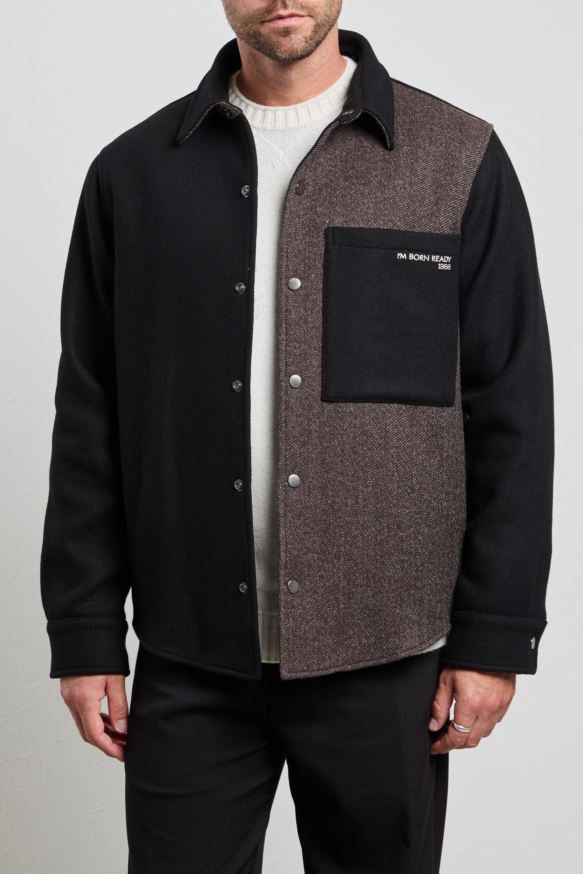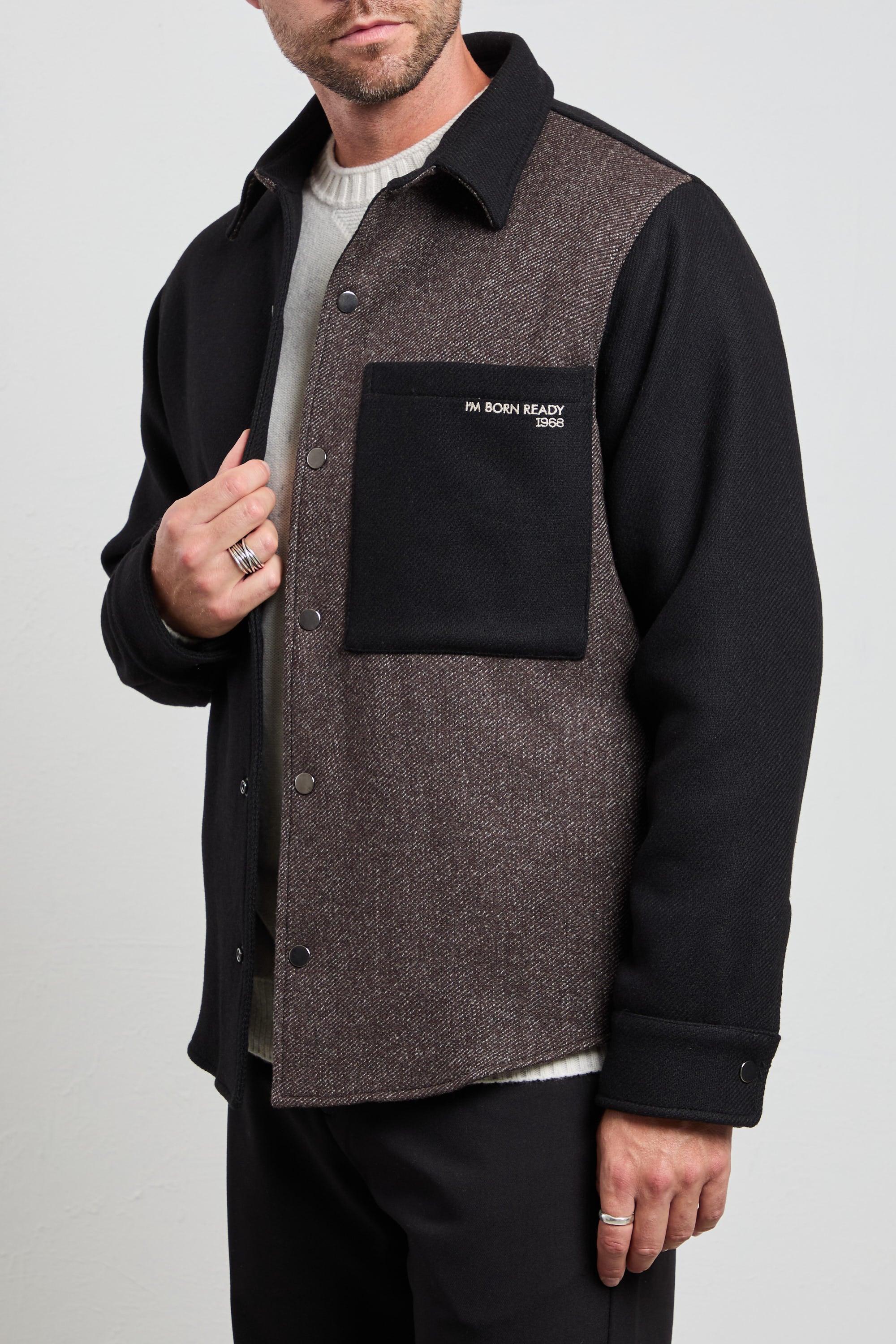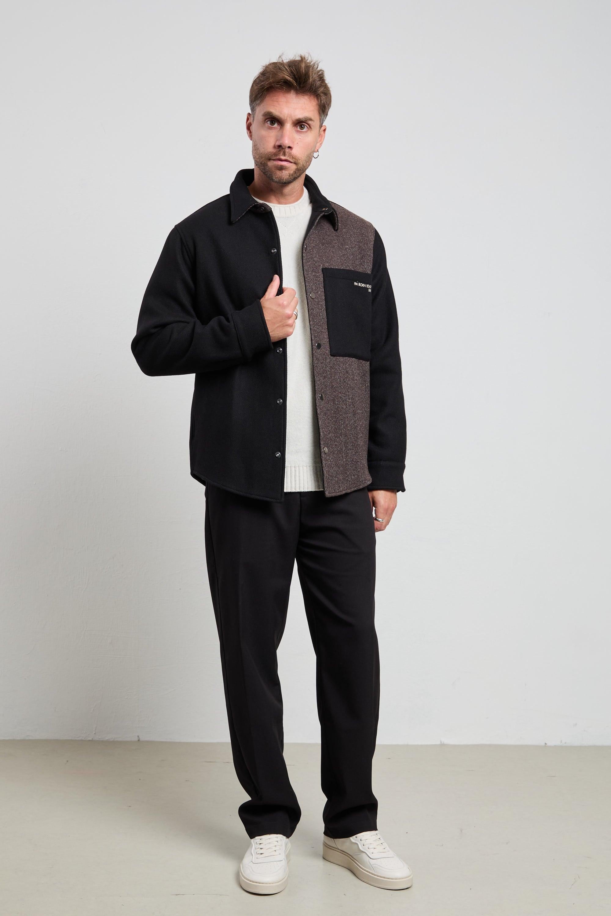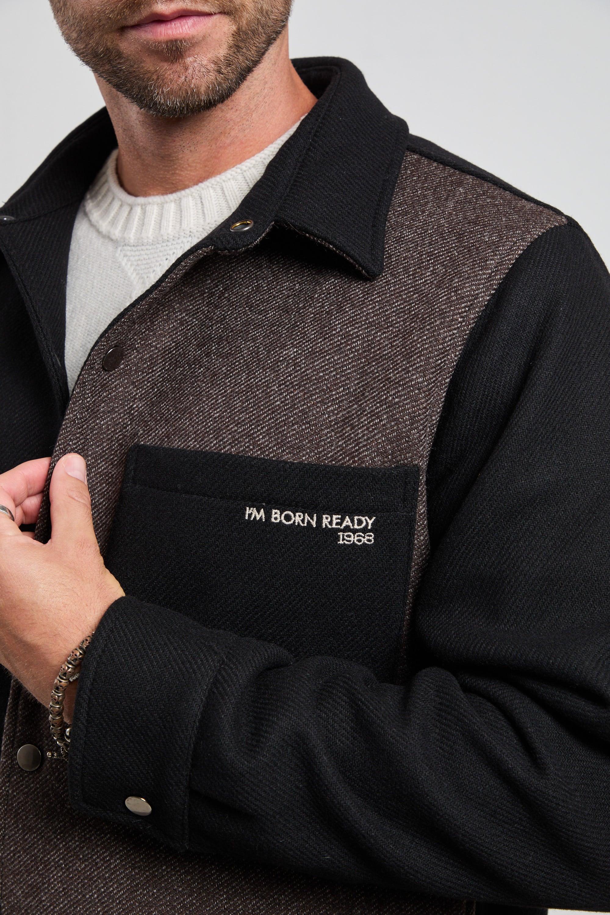 Un’overshirt foderata che gioca con i contrasti: nero e marrone mélange si incontrano in un design contemporaneo con dettagli dal carattere deciso. La texture calda e resistente la rende ideale per i mesi freddi, perfetta sopra un maglione girocollo con jeans neri per un look urbano, oppure con dolcevita e pantaloni sartoriali per un’eleganza ricercata. Vestibilità: comoda (ti consigliamo una taglia in meno) Dettagli: bicolore con tasca applicata e bottoni a pressione, tasca interna Composizione: 50% lana, 50% fibre tecniche, caldo e resistente Taglia indossata: 50 Colore: nero e marrone mélange Loghi: discreta scritta ricamata “I’m Born Ready 1968” sulla tasca Made in Italy