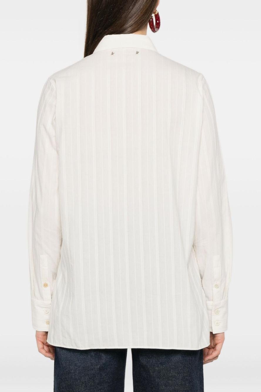 Proposta in beige chiaro con motivo a righe, presenta maniche lunghe, scollo con colletto classico e chiusura frontale con bottoni. Il ricamo decorativo aggiunge un tocco distintivo e sofisticato, perfetto per completare look eleganti o smart casual.