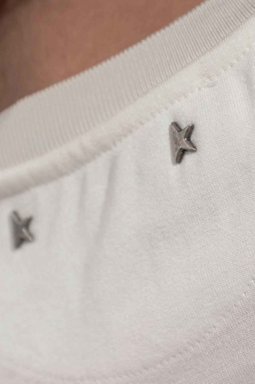 Proposta in bianco, presenta una stampa “The Golden Dreamers” e una decorazione con stelle metalliche, simbolo iconico della maison, per un look luminoso e contemporaneo. Il girocollo e le maniche corte completano un modello versatile, perfetto da indossare con denim o gonne midi per uno stile disinvolto ma ricercato.