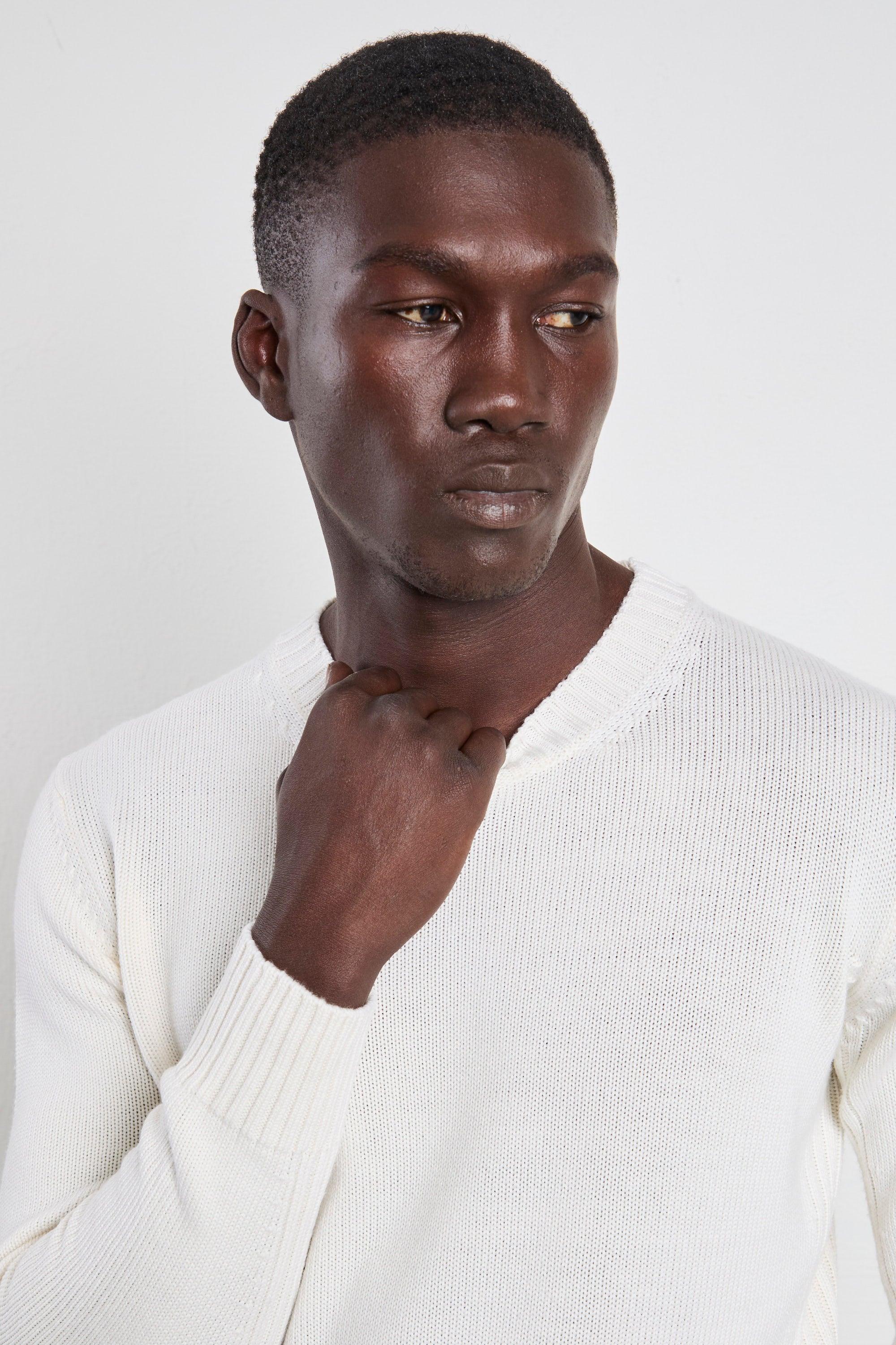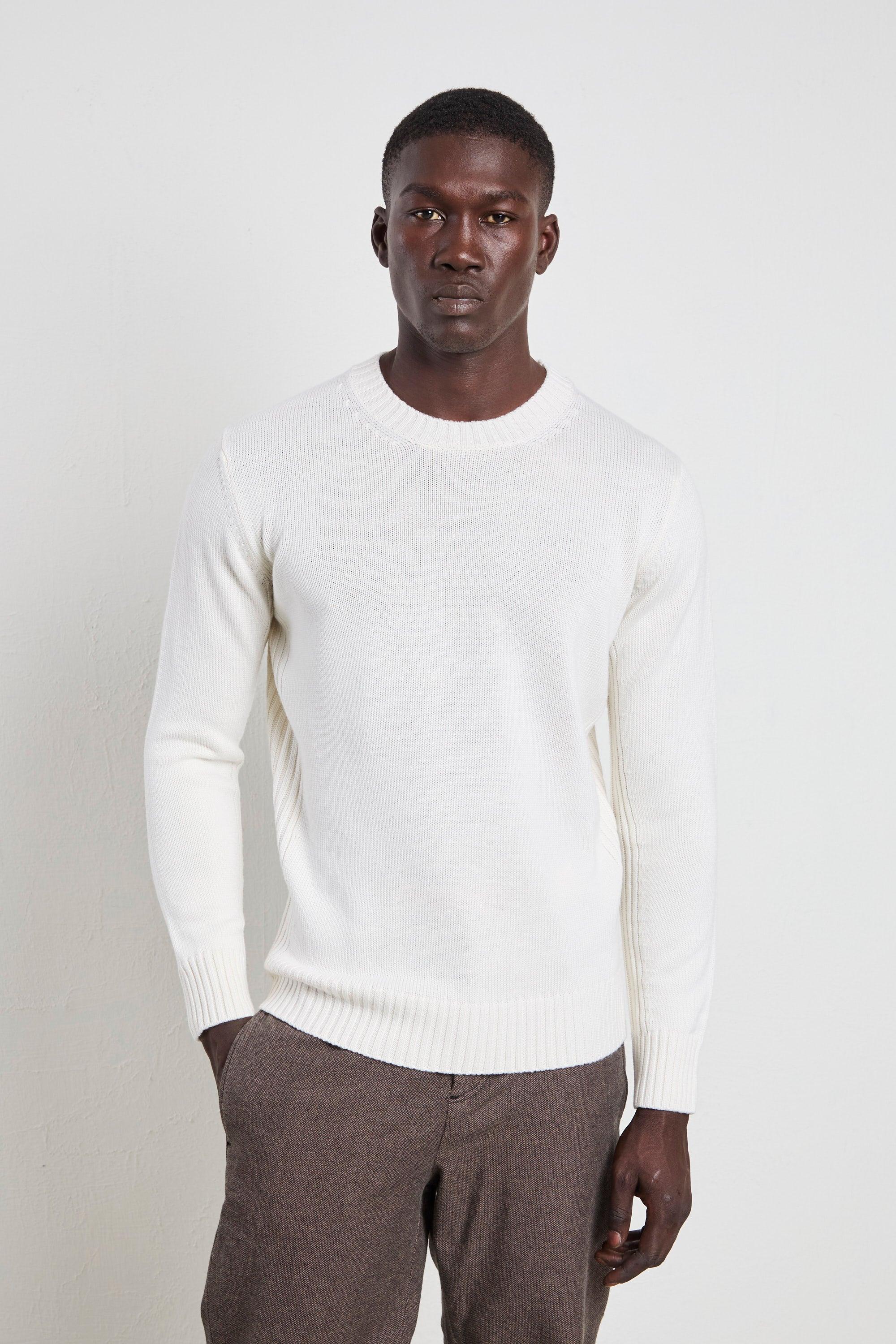 Sofisticata e versatile, la maglia girocollo rasato Kangra in filato medio peso colore panna con righe laterali è ideale per chi desidera unire comfort e stile. La vestibilità regolare valorizza la silhouette, mentre le righe laterali aggiungono un dettaglio moderno e dinamico al capo. Abbinala a pantaloni in lana grigia e mocassini in pelle per un look elegante da ufficio, oppure sotto un parka lungo con jeans scuri e stivaletti per un outfit casual-chic caldo e raffinato.