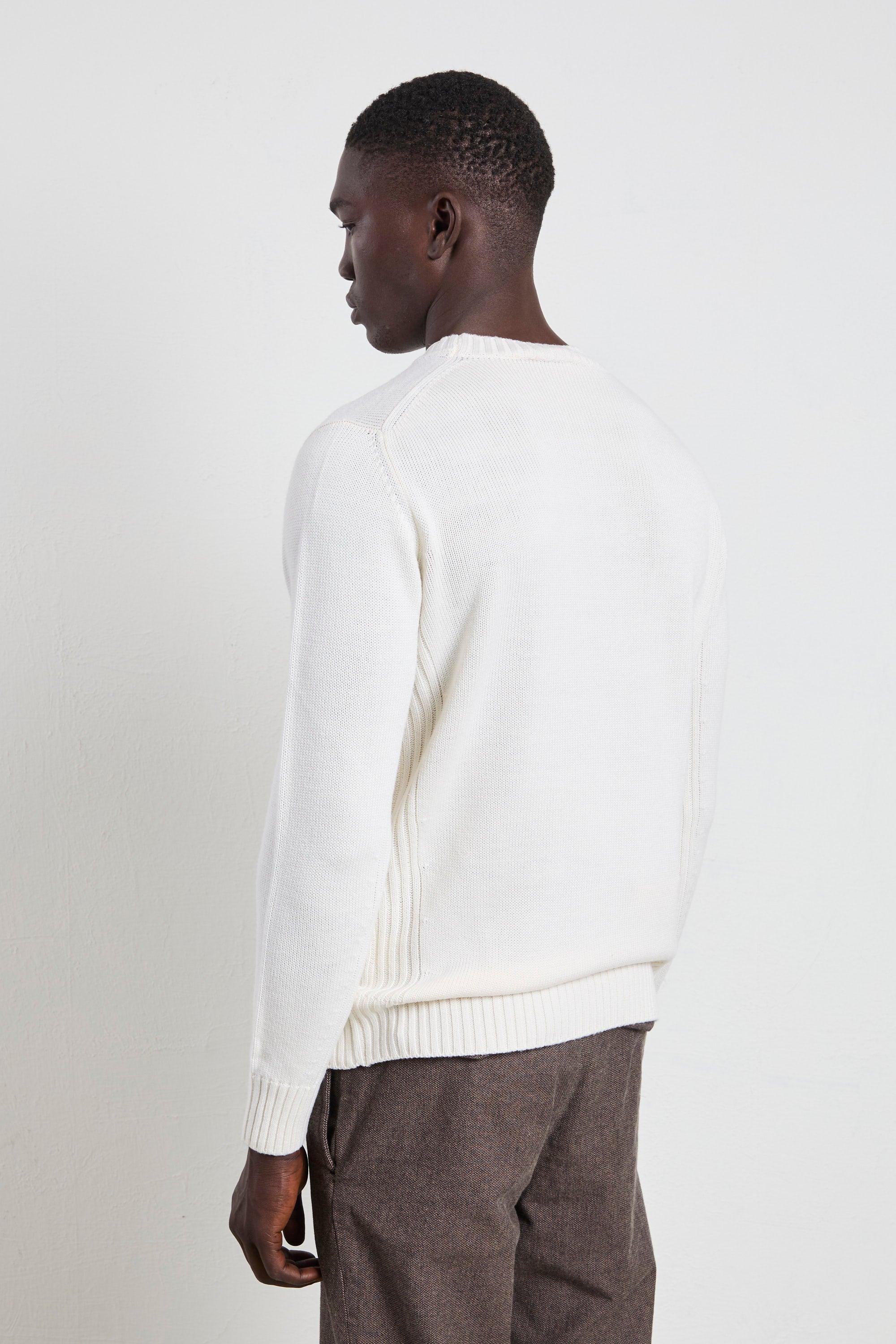• Modello: girocollo rasato con righe laterali• Vestibilità: regolare• Fondo e polsi: a coste elasticizzati• Composizione: 100% lana• Taglia indossata: 50• Made in: Italia• Logo: discreto, non vistoso• Colore: panna