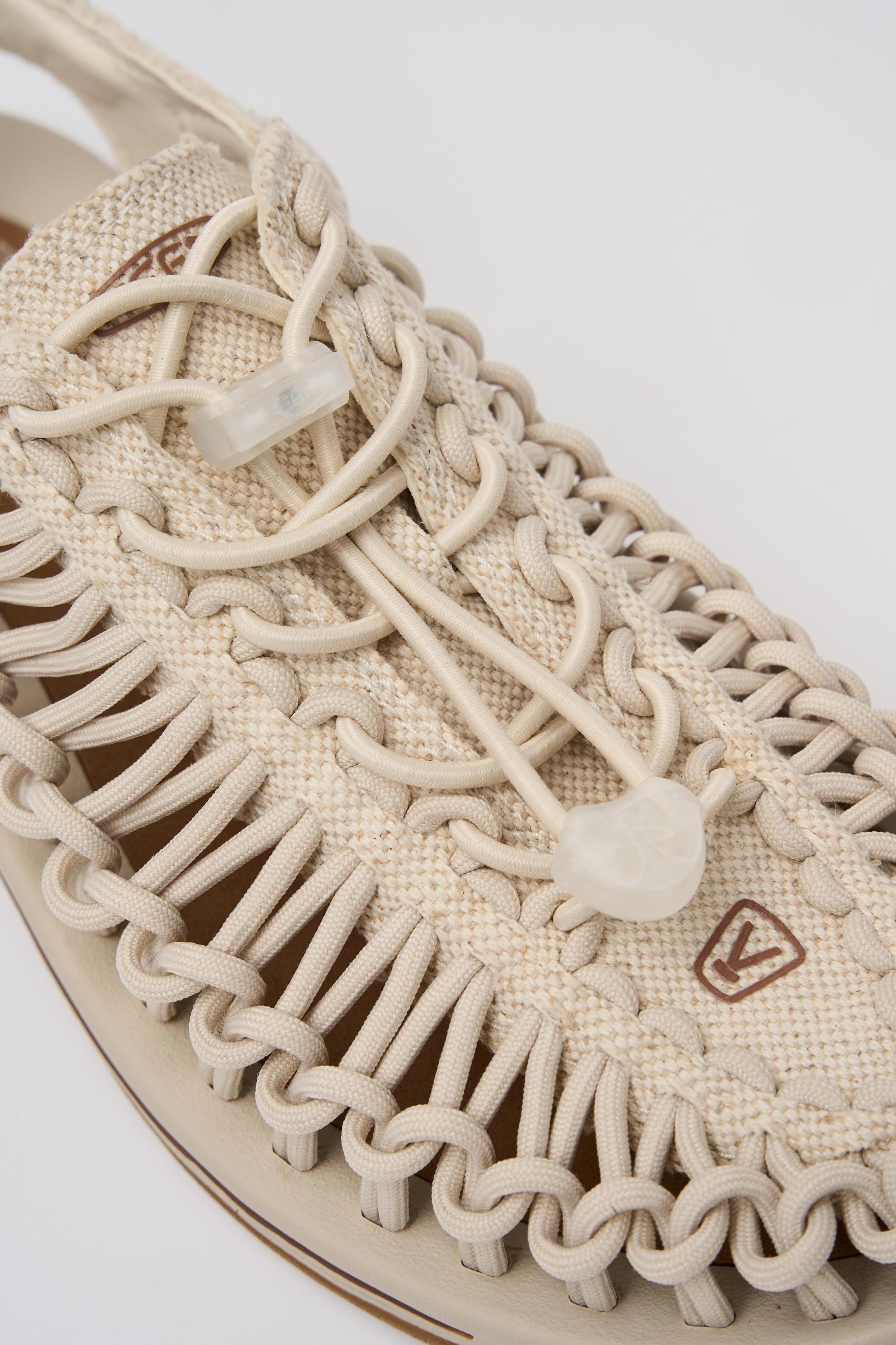 Sandalo modello Uneek di Keen caratterizzato da una tomaia intrecciata a doppia corda, con sistema di allacciatura 'Bungee' e tecnologia Cleansport NXT per il controllo naturale degli odori.L'intersuola leggera e la suola in gomma con design di trazione garantiscono comfort e resistenza, mentre il plantare metatomico è stato progettato per fornire un eccellente supporto all'arco plantare assecondando le curve naturali del piede.