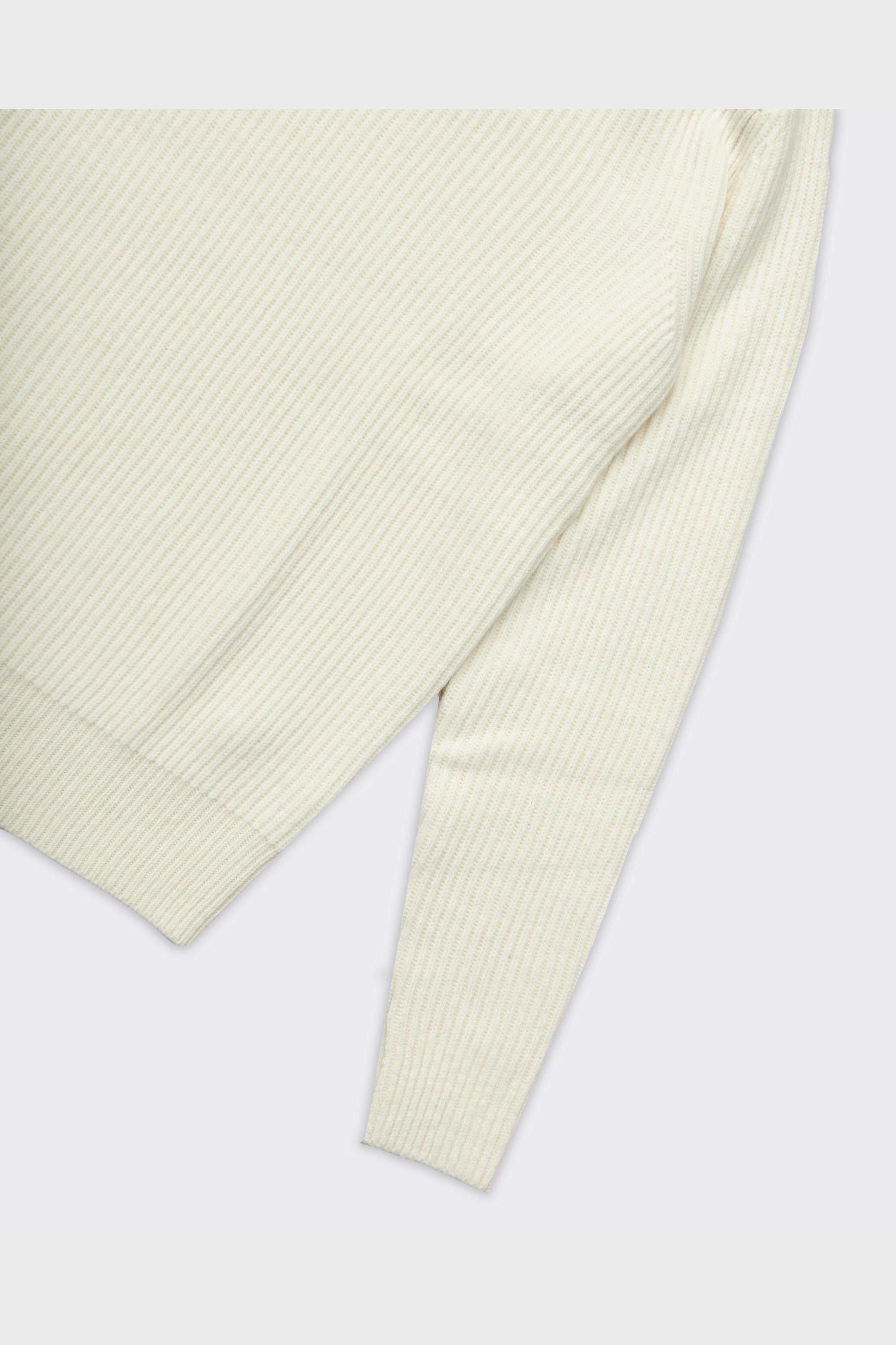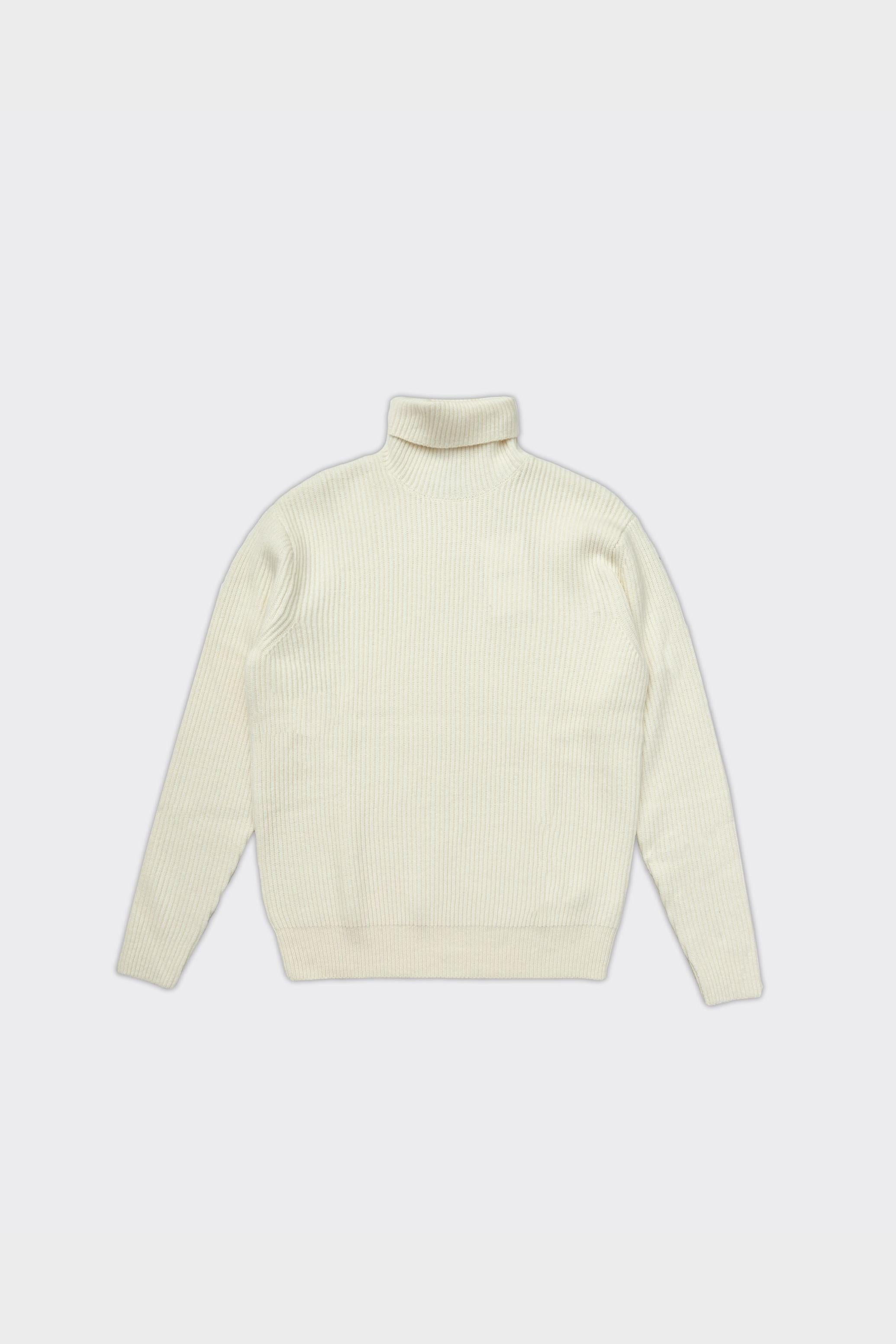 Maglione color avorio con lavorazione a coste visibile. Collo alto senza elementi di design visibili.