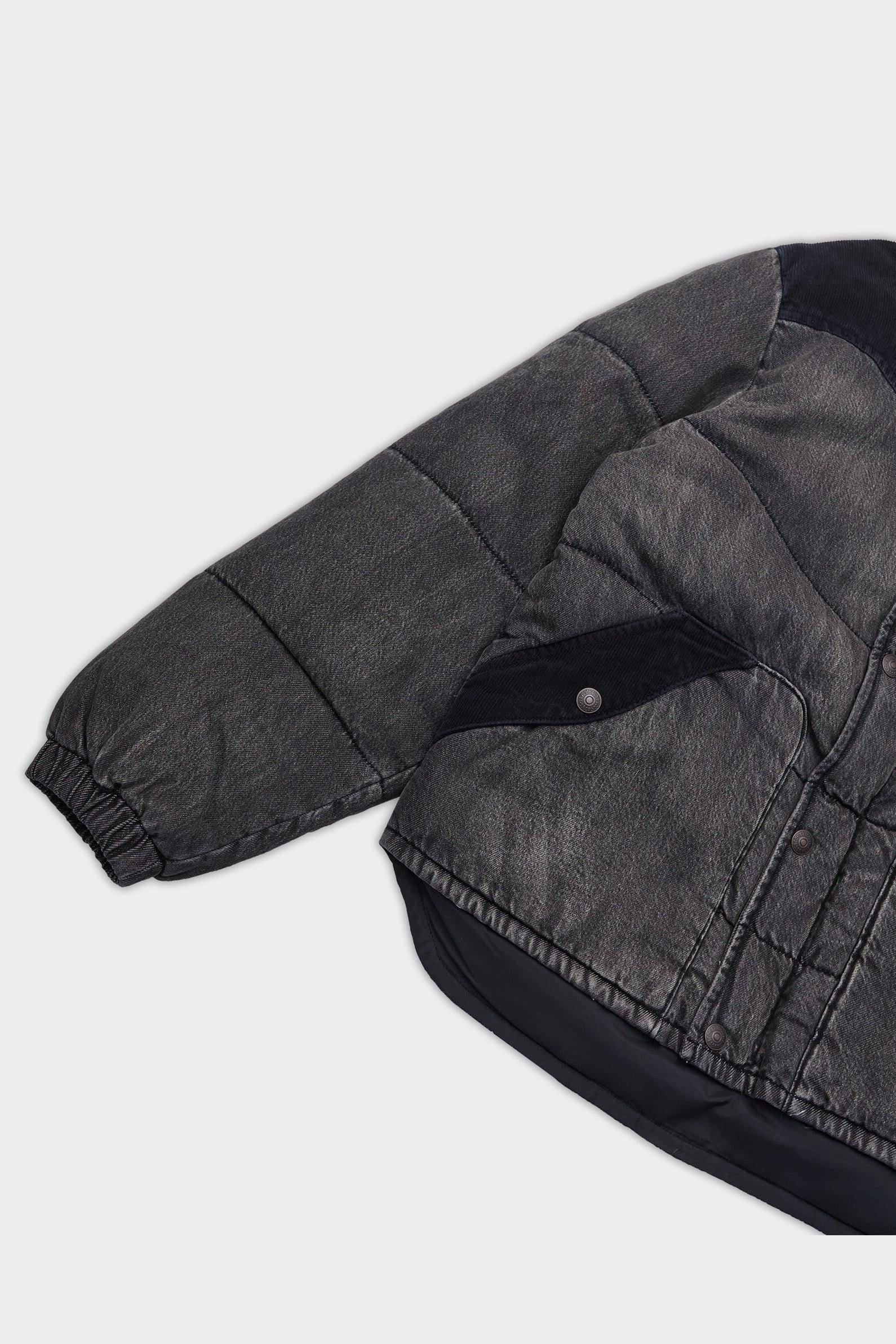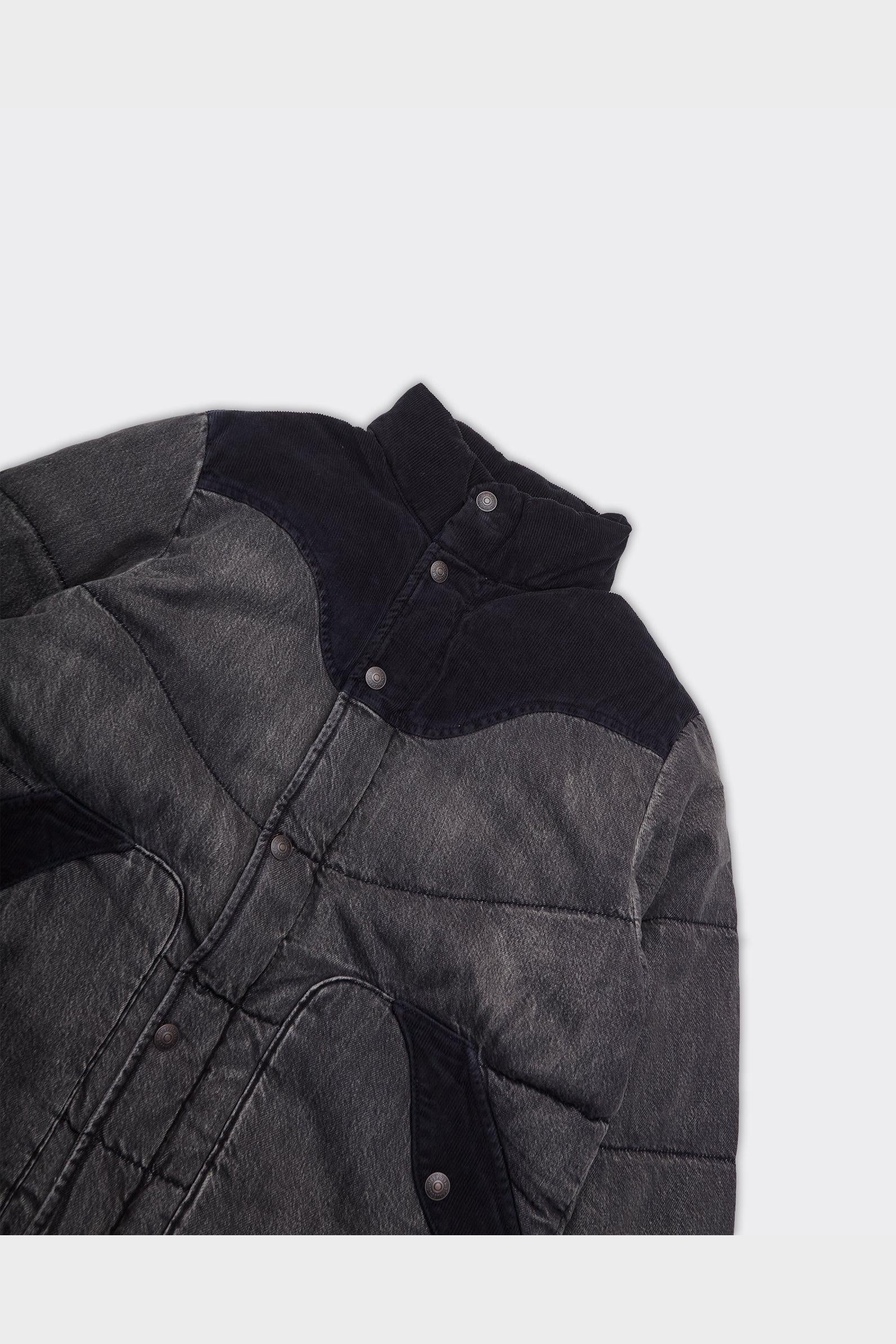 Giacca nera con finitura opaca, dettagli trapuntati, maniche lunghe con polsini elasticizzati. Colletto rialzato con bottoni visibili sul fronte. Tasche laterali con patta e bottoni.