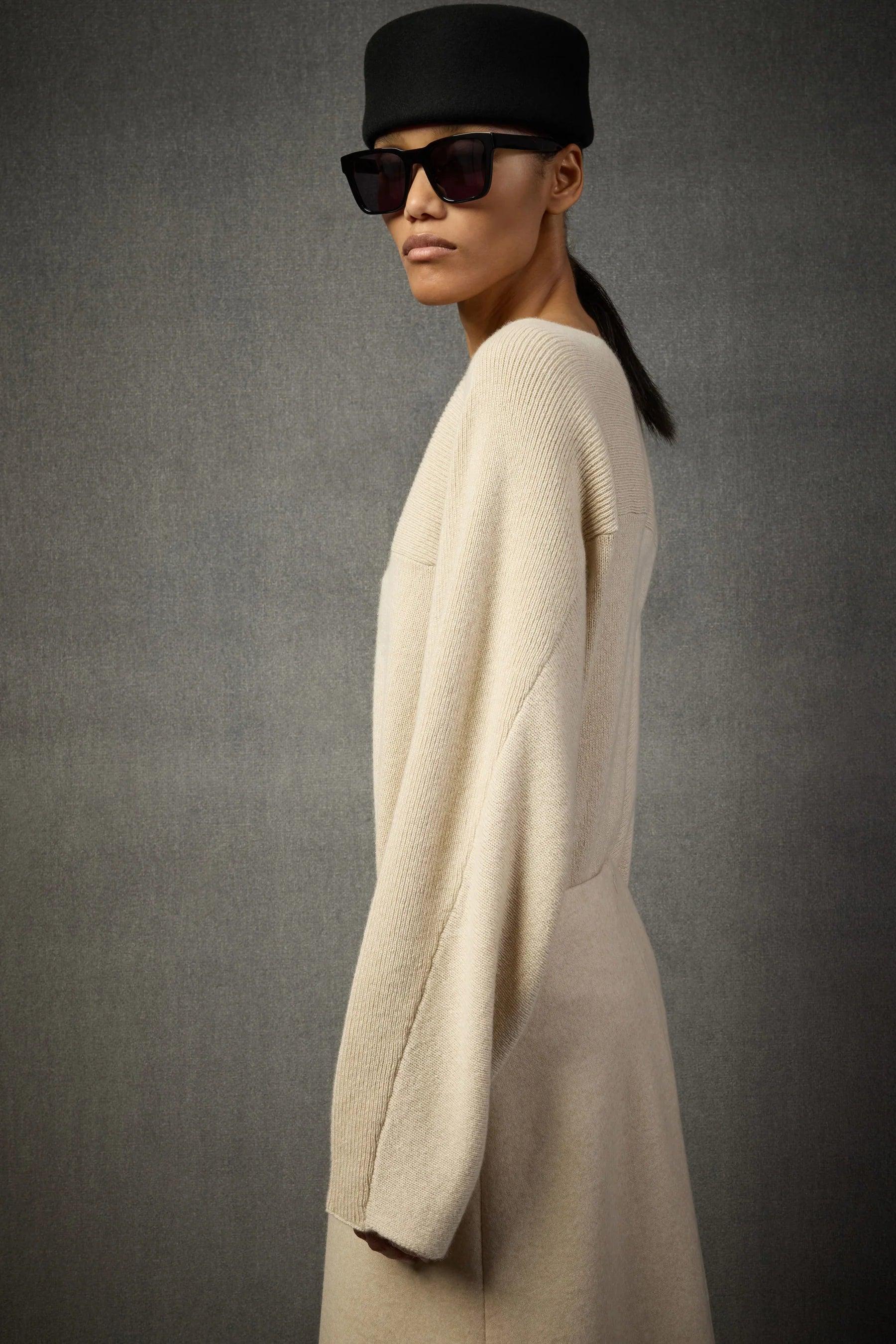 MAGLIONE A MANICHE LUNGHE IN CASHMERE E SETA CON SCOLLO A BARCHETTA E SPALLE SCESE. PRESENTA UNA VESTIBILITÀ LENTA E UNA LUNGHEZZA ALLA VITA. 60% KASHMIR 25% SETA 15% LANA Made in ITALY