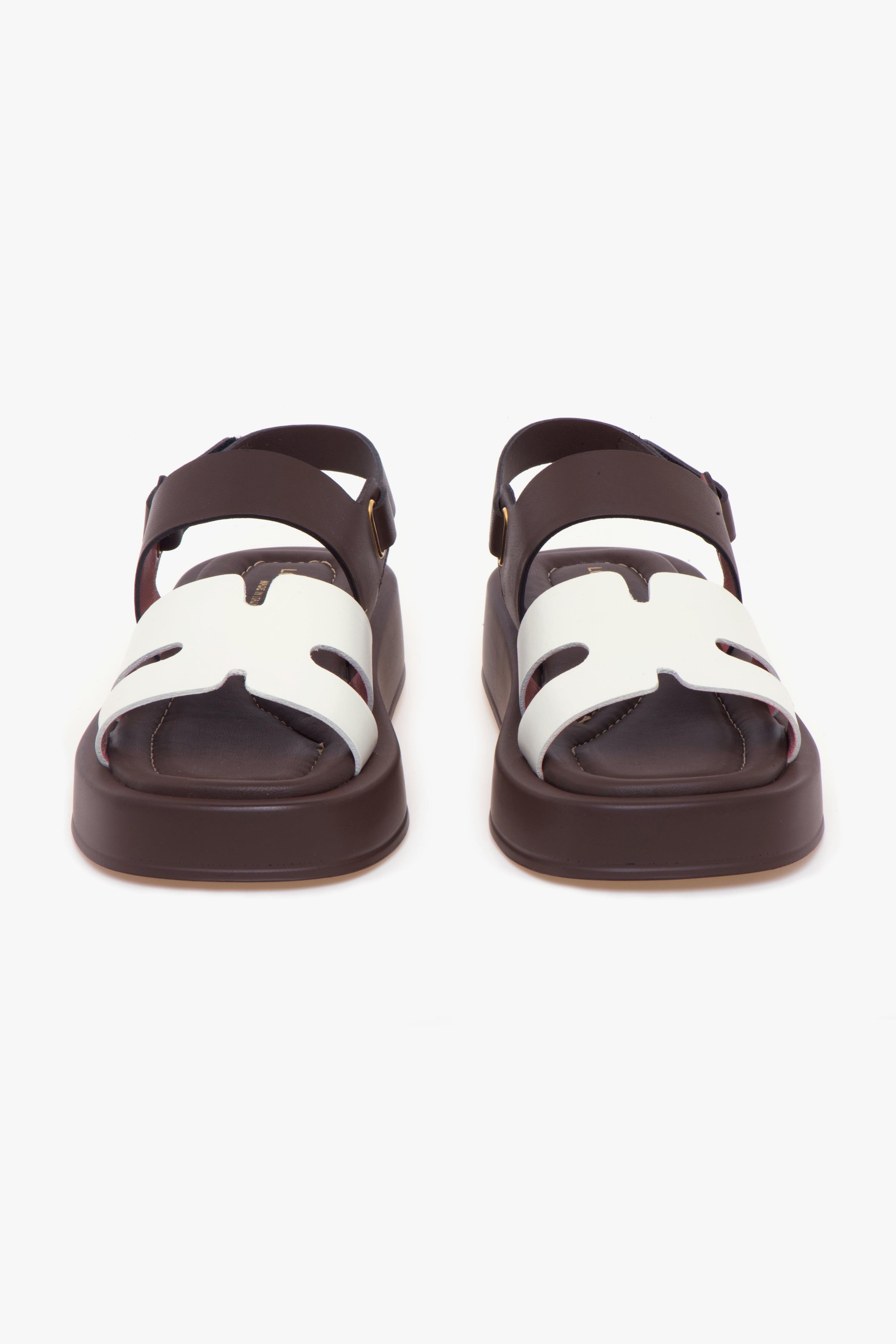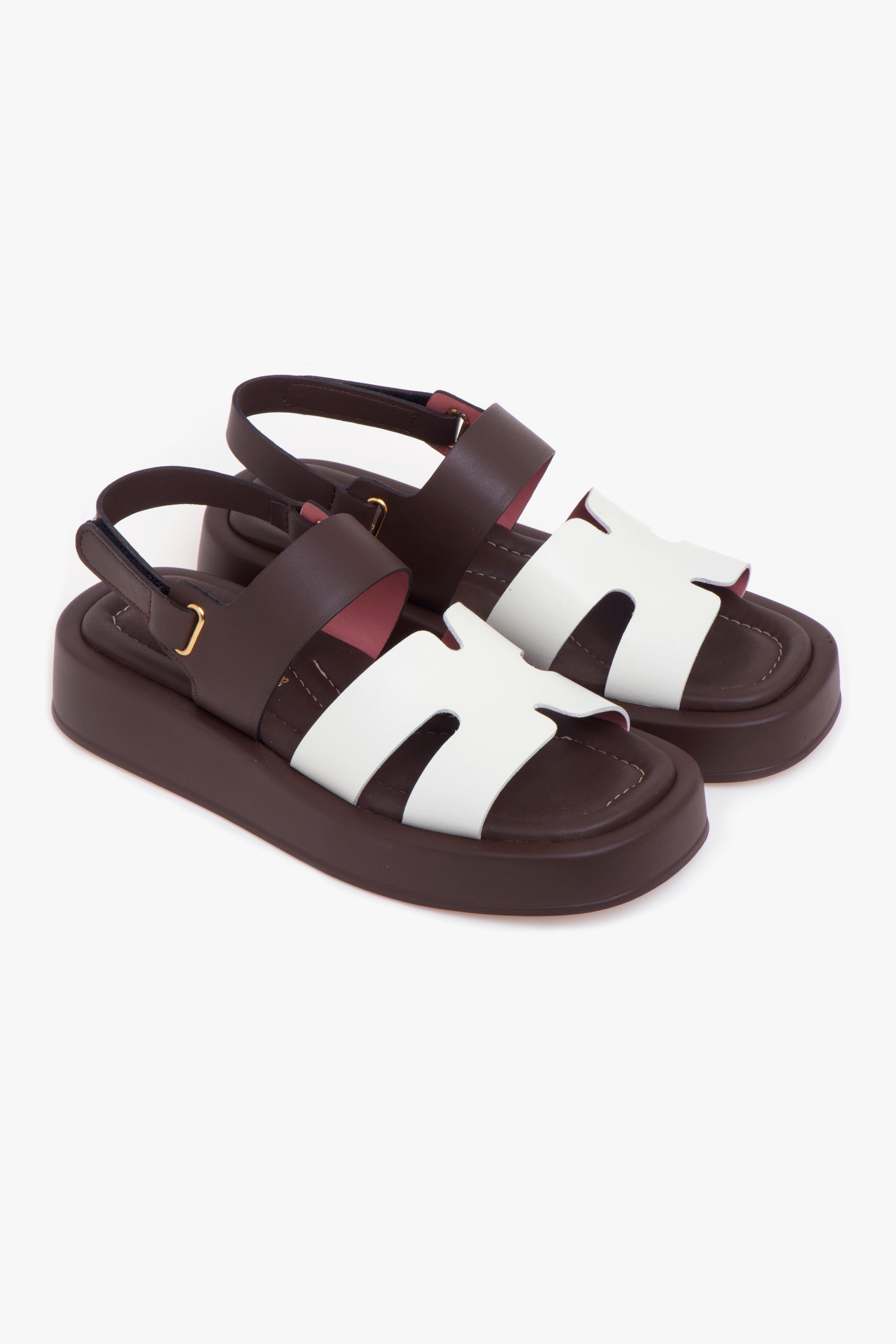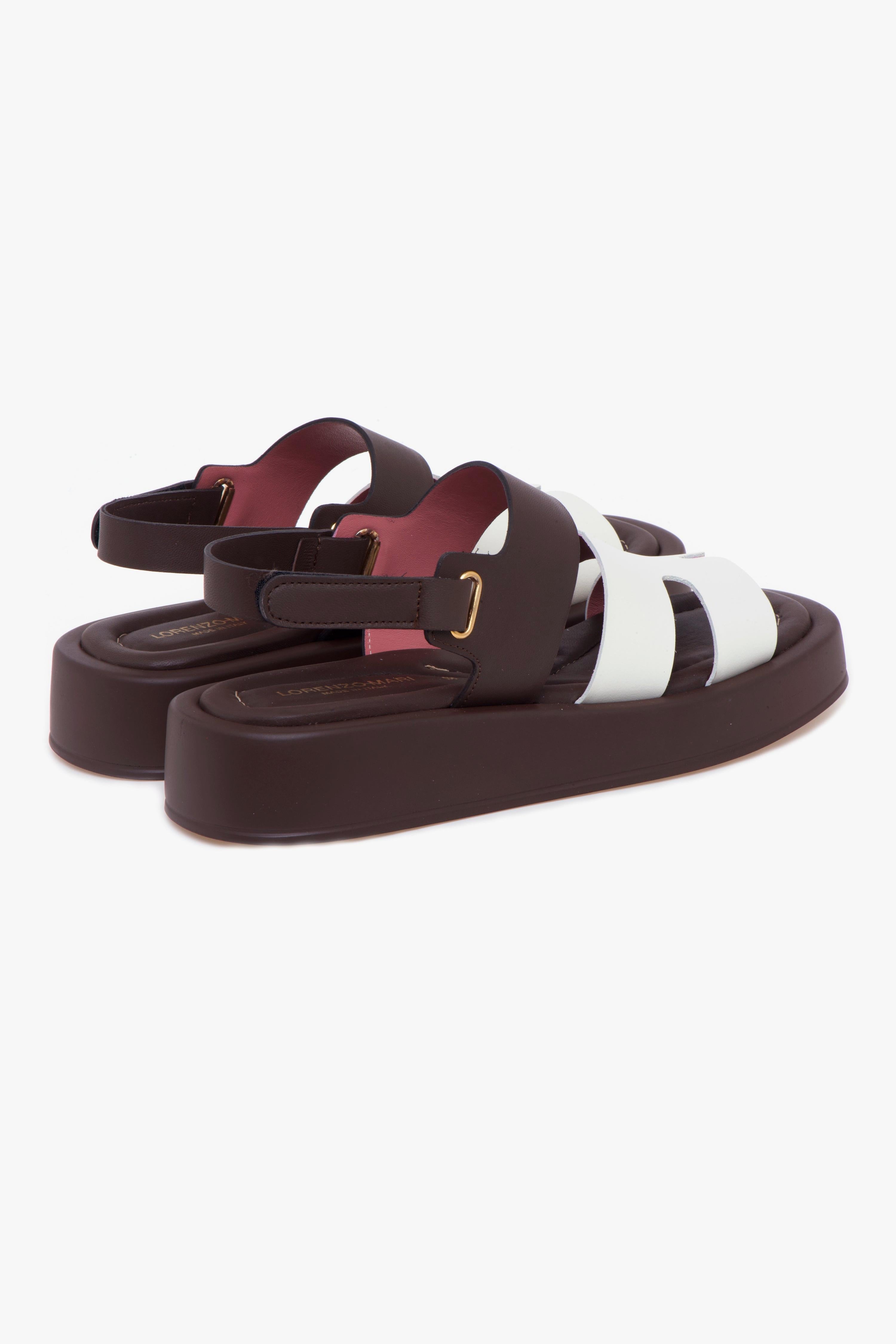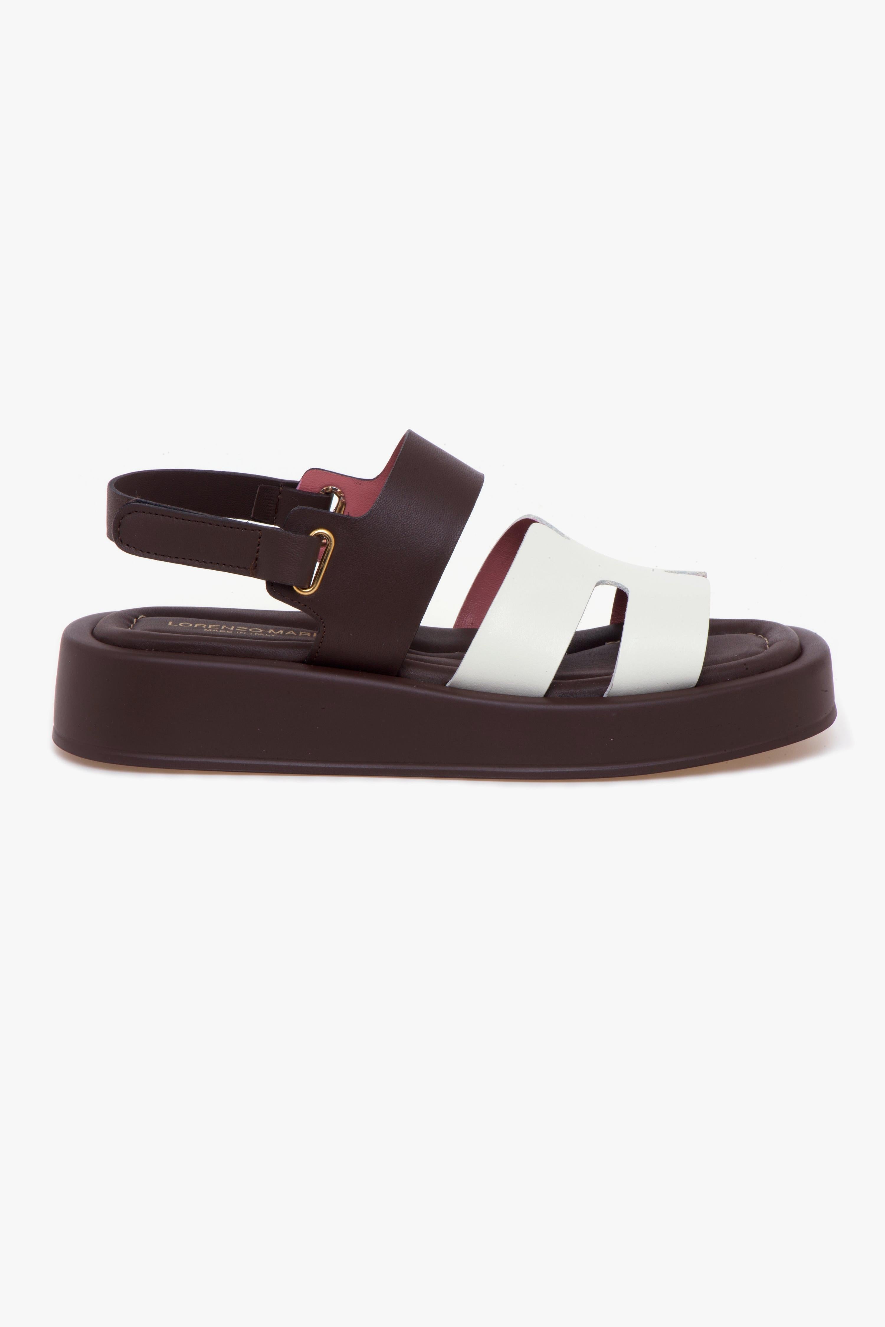 Design essenziale e palette cromatica raffinata si incontrano in questo sandalo Lorenzo Mari, ideale per completare con stile i look della stagione. La tomaia in pelle a taglio vivo è composta da una fascia anteriore a forma di “H” in tonalità latte e da una fascia color testa di moro sul collo del piede, a cui si collega il cinturino regolabile con chiusura in velcro.Il sottopiede in pelle imbottita assicura un comfort elevato, mentre la suola in gomma leggera con platform sostiene la camminata senza appesantire. La struttura è pensata per offrire una calzata stabile e comoda, mantenendo un’estetica pulita e contemporanea.Perfetto con pantaloni a gamba dritta e una blusa in popeline, oppure con un abito chemisier midi, per un look urbano, fresco e curato nei dettagli.# Tomaia in pelle. # Fodera in pelle. # Sottopiede in pelle imbottita. # Suola in gomma. # Altezza suola nel tallone: 40 mm. # Altezza della suola sulla punta: 25 mm # Made in Italy.