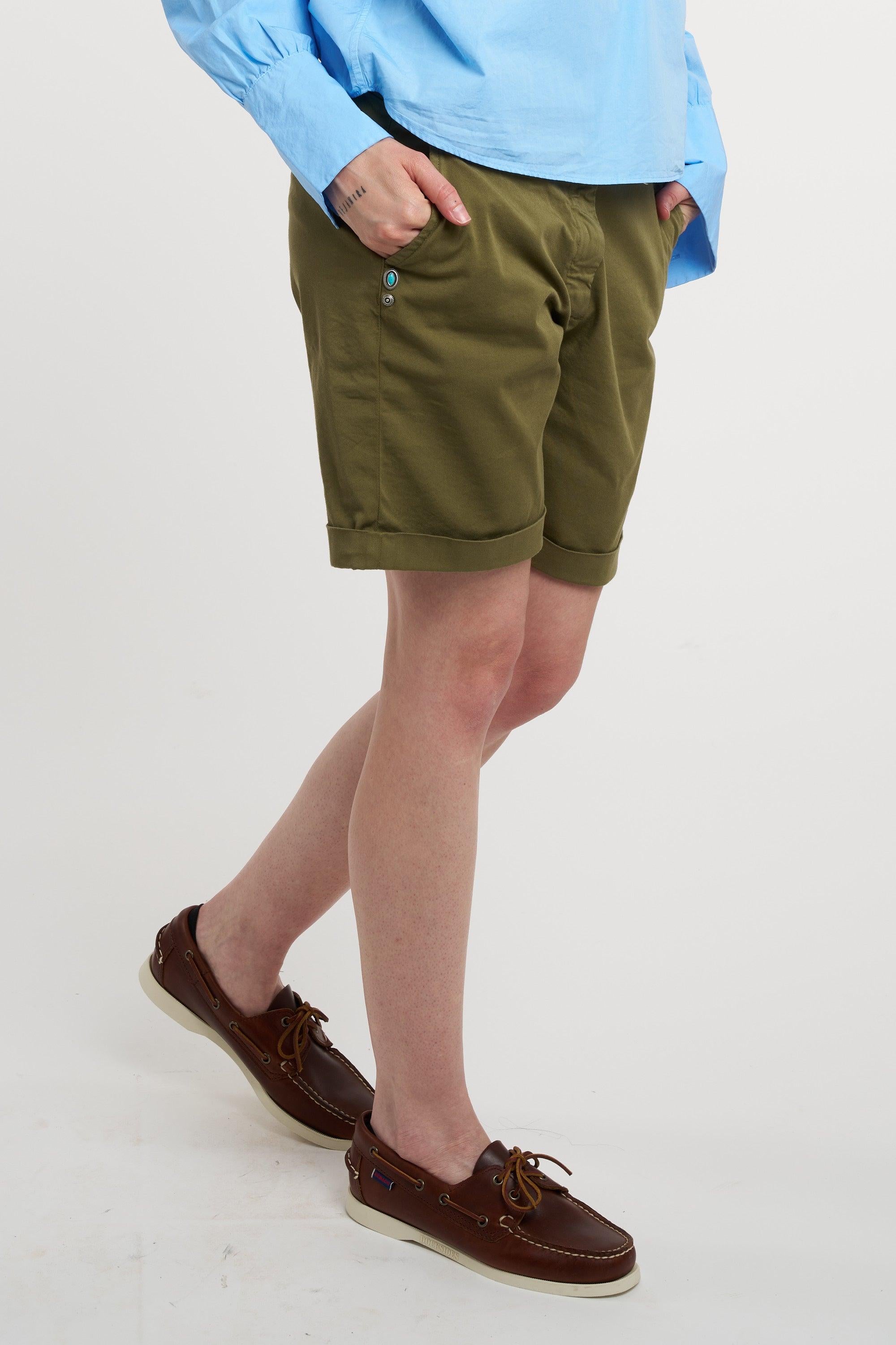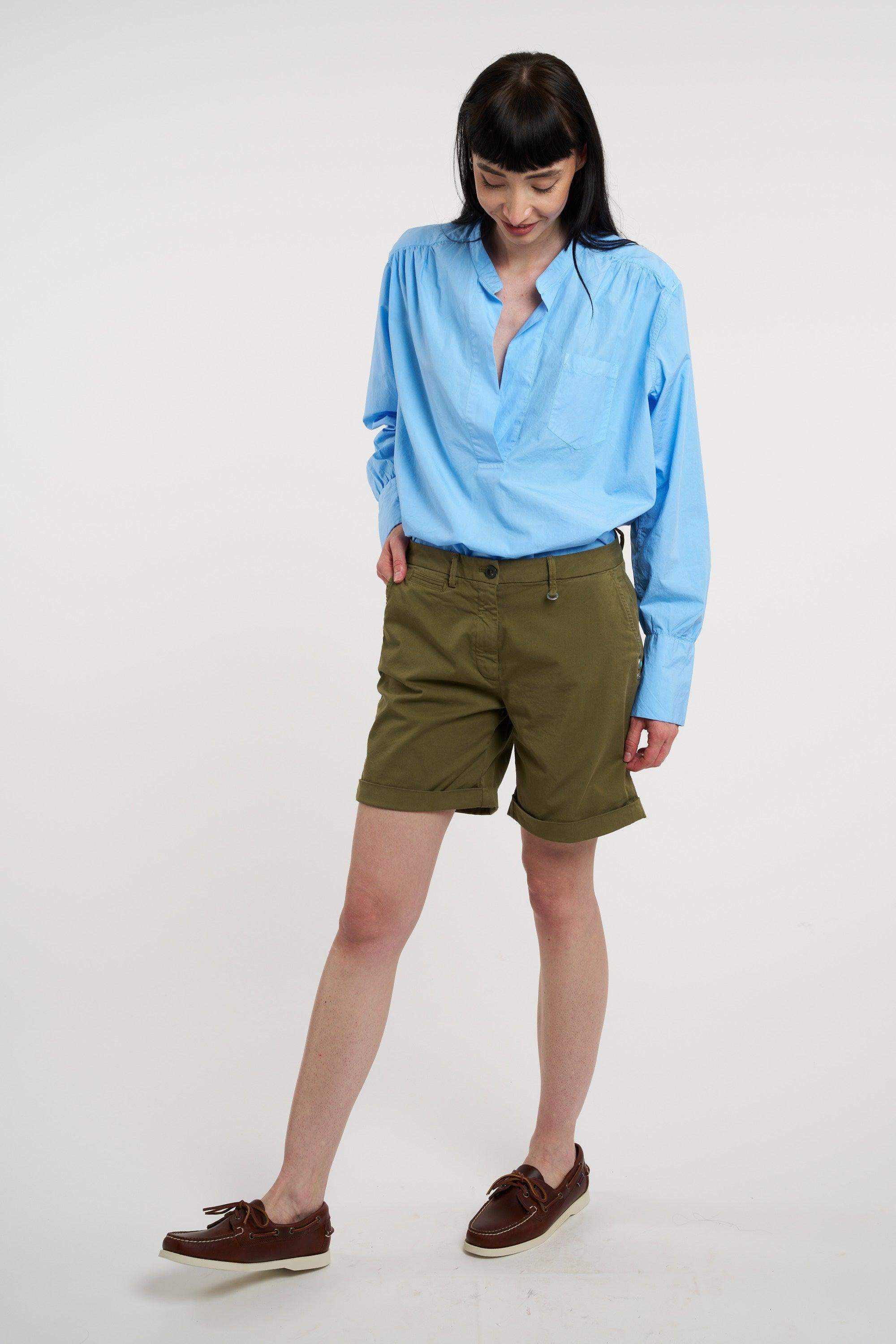 Tasca posteriore a filetto Rivetto M di Mason’s Il Bermuda chino è realizzato in gabardine ed è pensato per esaltare la silhouette femminile. Con una vestibilità che scivola comodamente sui fianchi e una lunghezza media, questo capo si adatta perfettamente a look casual e più urbani, rendendolo una scelta ideale per l’estate. Le due tasche frontali e la pocket money aggiungono un tocco pratico, mentre le borchiette sui fianchi e il rivetto con la M di Mason’s conferiscono un carattere distintivo. La vestibilità slim della gamba crea una linea armoniosa e slanciata, combinando comfort ed eleganza in un solo capo.